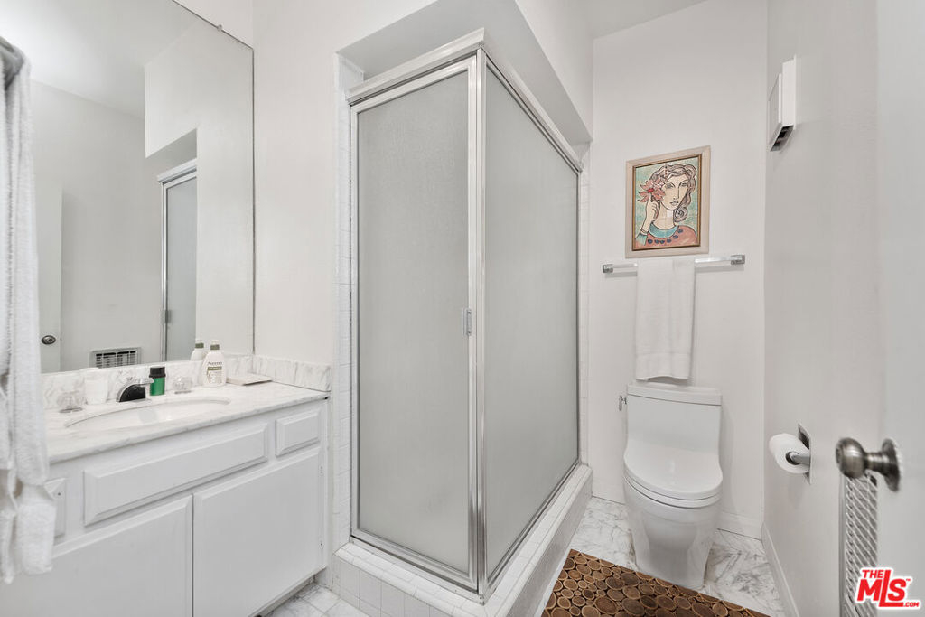 Spacious, street-facing 2BD bedroom condo in a great West Hollywood location. A dramatic, double door entry reveals a light and bright marble-tiled foyer with wet bar and half bath. Large living and dining area with hardwood flooring, high ceilings, recessed lighting, B&B Italia console and gas fireplace. Galley style kitchen with lots of cupboard and pantry space. Master suite features a formal entry with make-up vanity, 2 large walk in closets, soaking tub, bidet, and standing glass shower. Second bedroom offers ample closet space, large bathroom and lots of natural light. In unit washer and dryer. Updated furnished lobby, Pool, spa, dry sauna, assigned storage closet, side-by-side parking, and guest parking. Earthquake insurance included.