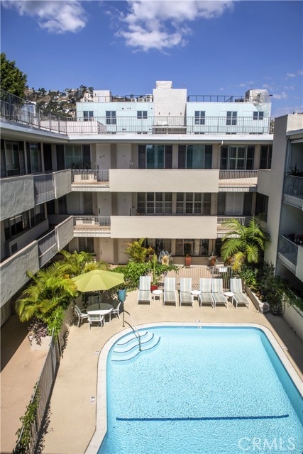 Spacious and bright top-floor corner condo with only one neighbor. Thoughtfully updated and meticulously maintained, this home features an in-unit washer and dryer, large closets, and a versatile living area with distinct zones including a private terrace. The kitchen is roomy and functional, complemented by a guest powder room. The large primary suite offers double closets and a bathroom with both tub and shower plus a window for natural light. The building is FHA-approved and in excellent condition, offering easy-access garage with double entry, modern security systems, elevator, and a sunny pool in a relaxed, quiet setting. Located on one of West Hollywood’s most charming streets, just steps from the best shops, restaurants, and nightlife. A rare opportunity to invest in a home that combines comfort, style, and lifestyle.