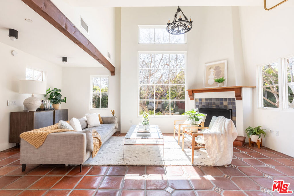 Located in West Hollywood's Historic Harper Avenue District, this Spanish revival community emphasizes outdoor space and has historic charm without all the hassle of a historic home. One of only 20 villa townhomes in the exclusive Seven Fountains, this incredibly private corner unit is the largest in the community and lives like a single family home. Walk into the double-height living room with a spectacular grand two-story fireplace, flooded with natural light from a large window and french doors. Feel like you're at a top resort, with three of the bedrooms featuring their own ensuite bathroom and ample closet space. The oversize and very private primary suite is located on its own floor - with a grand Romeo and Juliet balcony with french doors opening to the high ceilings. The bedroom opens up to a dressing area with dual sinks, adjacent to a bathroom with deep soaking tub and separate stand-up shower, and a very large walk-in closet. The fourth bedroom has its own private entry and is a perfect work-from-home space.The private rooftop deck with sweeping westward views towards is perfect for sunset cocktails. Another balcony off of a guest bedroom has charming hillside views. Wonderful features abound : central hvac with nest thermostat, in unit laundry, 3 reserved parking spots, and an extra large private storage space adjacent to the parking space. Designed by Moule & Polyzoides and built in 2000, the architects shared "This project continues the tradition of courtyard housing, using as reference famous Hollywood precedents such as the Andalusia (1926) and the Ronda (1927). Organized around four courtyards with seven fountains, it is located adjacent to the Sunset Strip in West Hollywood." A charming central courtyard makes you feel like you've been whisked worlds away to an exotic and beautiful location. The grounds feature lush landscaping, a large and tranquil spa, fountains, a koi pond, a seating area with fireplace and a serene reading room. Each of the seven fountains has a unique mosaic design using hand-painted tile. Invite your friends to enjoy the grounds with you, with easy guest parking available. A one of a kind unit in an incredibly special community, this gorgeous home must be experienced in person.