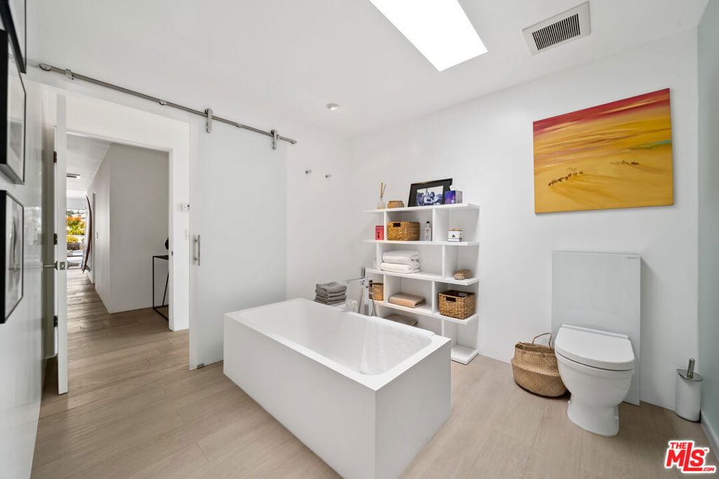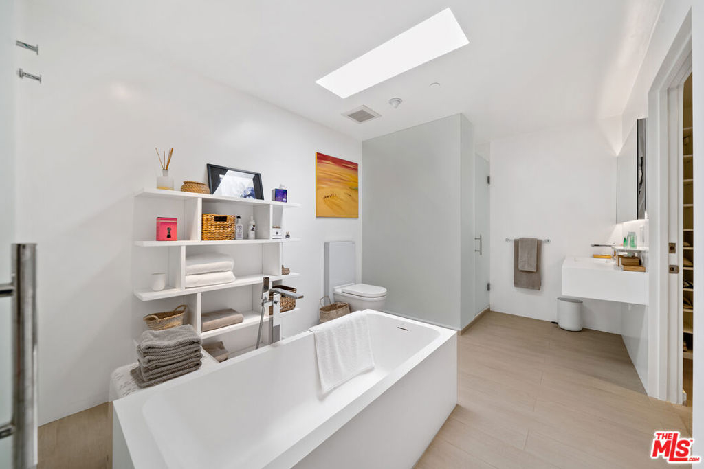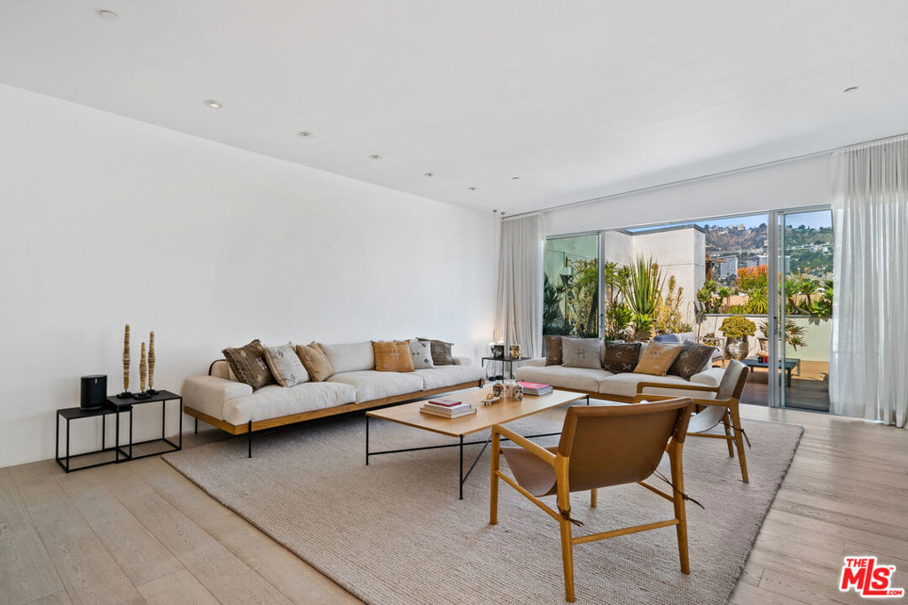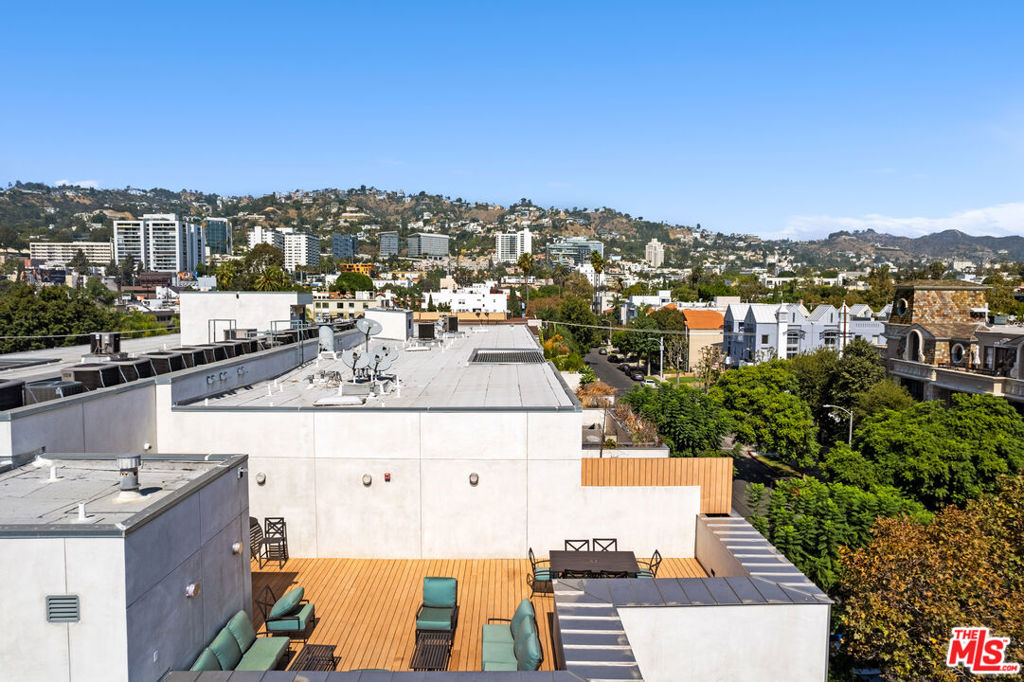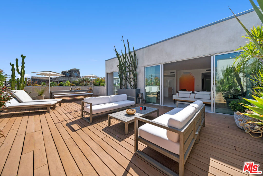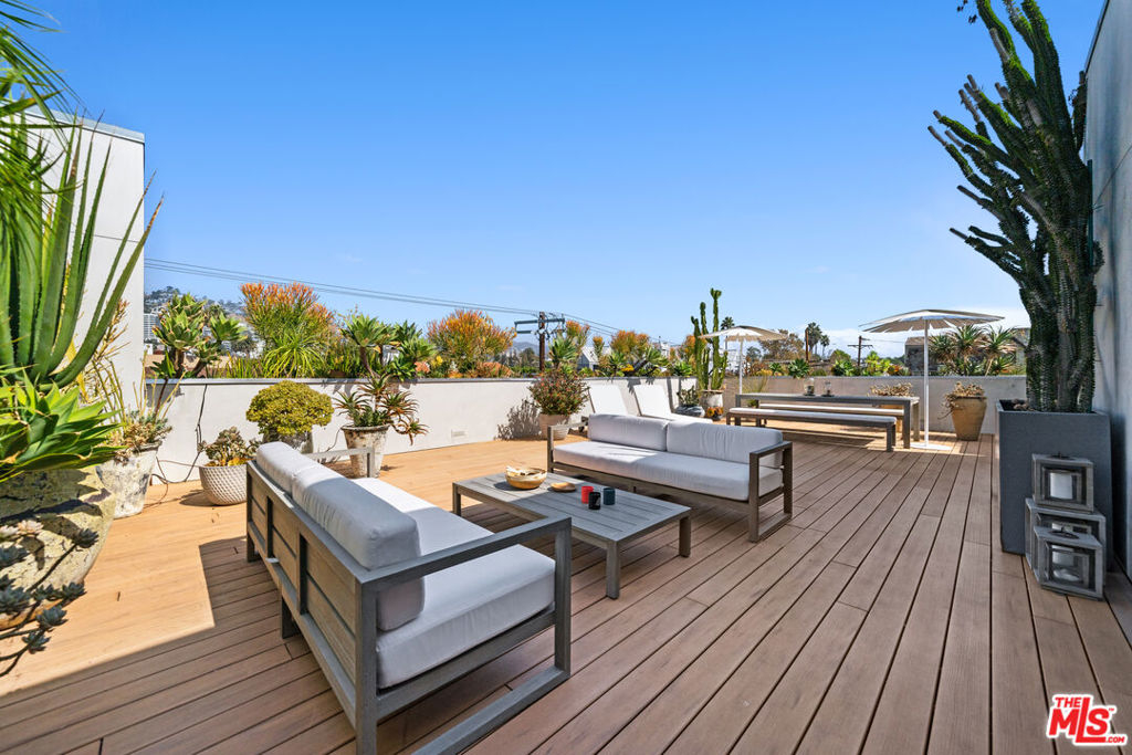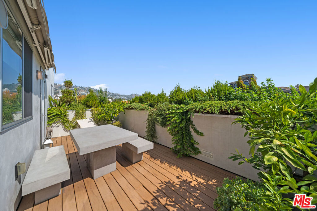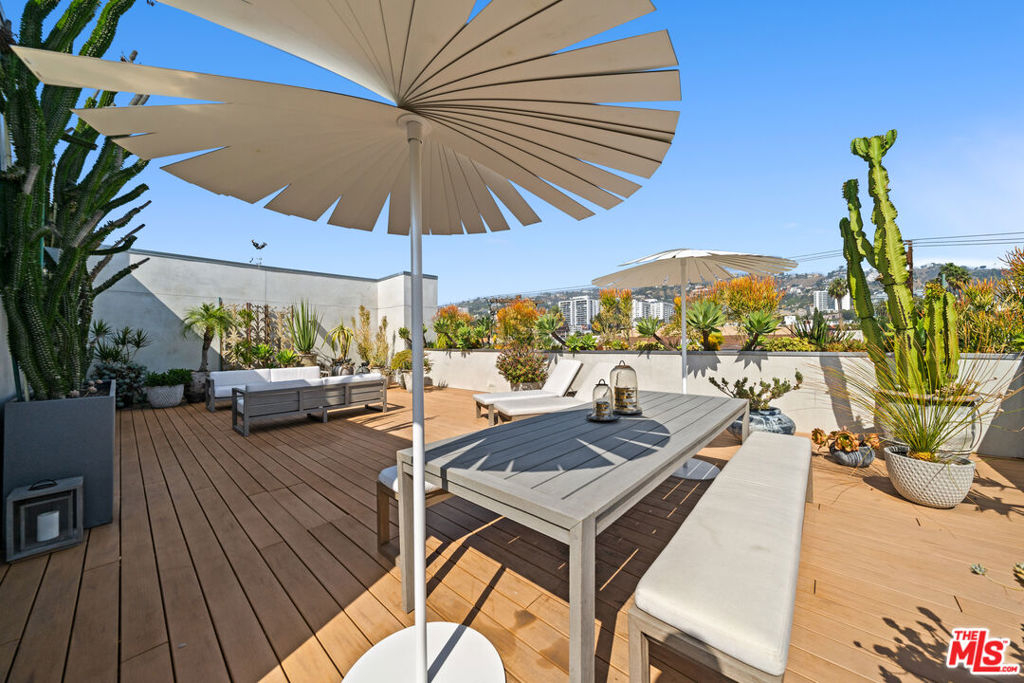 Just Reduced, Make it yours! Stunning single level designer penthouse has expansive outdoor oasis living spaces in excess of 1200 square feet (Independently measured). Situated in a beautiful modern environment designed by Zoltan Pali for SPF: architects, it has all the convenience of lock-up and go living in the ultimate location in the Melrose district. This chic unit with high ceilings, huge walls for art, incredible finishes, abundant light and postcard views of the Hollywood Hills will excite you every time you see it. The open floor plan with jaw dropping immense deck flows seamlessly off the living room. There are two spacious primary suites each with beautiful patios. Unit comes with side-by-side parking, extra garage storage and in unit laundry room. Highly sought-after location just a short stroll to Melrose Place. Why buy a house when you can have all this outdoor space, no common walls and minimal upkeep. All furniture and furnishings are available for sale.