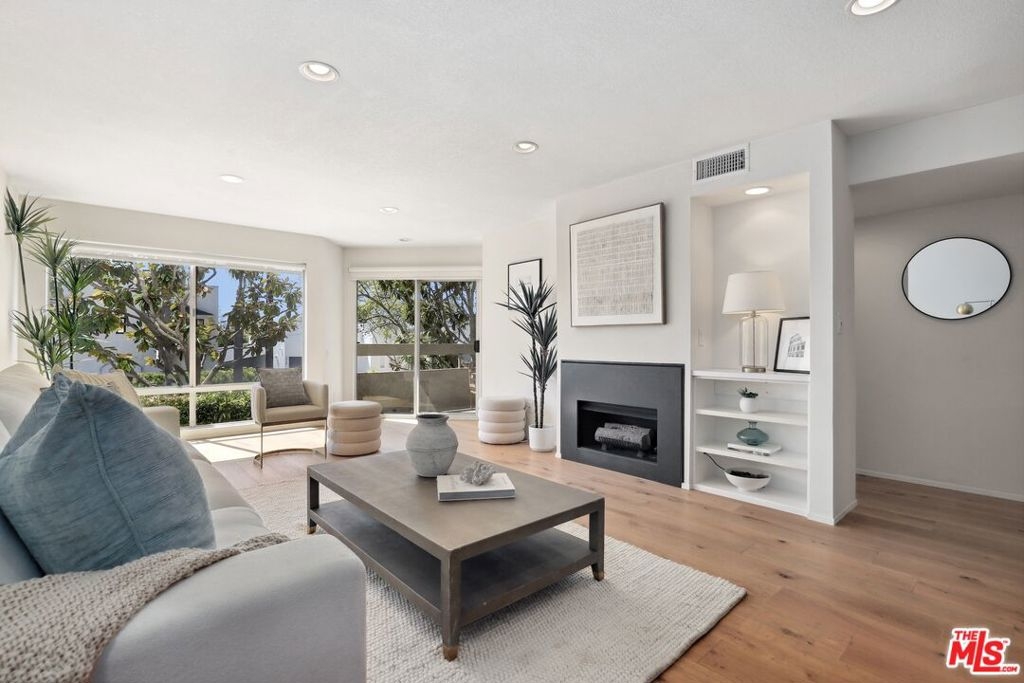 Stunning remodeled condo in West Hollywood's coveted Norma Triangle. Enter into modern luxury in this impeccably redesigned 2-bed, 2-bath condo, nestled in the heart of West Hollywood's most desirable neighborhood -- the Norma Triangle. Bathed in natural light from its south-facing exposure, this residence offers a seamless blend of contemporary elegance and urban convenience. Wide-plank oak hardwood floors flow throughout the living space, complemented by recessed lighting and a cozy fireplace perfect for relaxing or entertaining. Sleek Silestone countertops, custom cabinetry, stainless steel appliances, and a chic subway tile backsplash make this kitchen as functional as it is stylish. The breakfast bar adds extra seating for casual dining. Sliding glass doors open to a spacious balcony, offering a serene escape overlooking a quiet, tree-lined street. Two generously sized bedrooms feature Seagrass flooring, ample closet space, and tranquil vibes. The primary suite boasts an en-suite bathroom with a double-sink vanity and Carrera marble finishes. Both bathrooms are adorned with Carrera marble countertops, subway tile accents, and modern fixtures elevating everyday routines. Enjoy the convenience of two side-by-side parking spaces, plus access to resort-style amenities, including a sparkling pool, sundeck, remodeled lobby, and 24/7 controlled access.