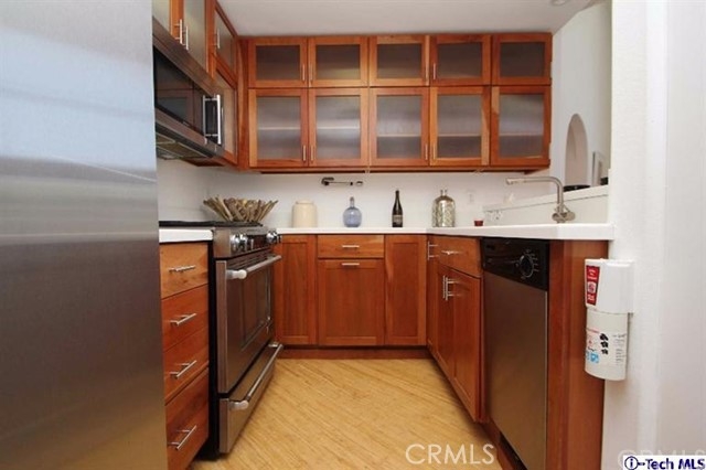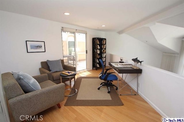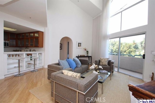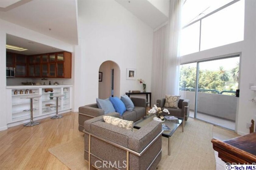Luxurious Penthouse, situated just outside the eastern edge of the hip Spaulding Square district, with its modern contemporary vibe offers 1469 sq ft of living space, 2bed/2bath + a loft/den. Its 21 ft cathedral ceilings & arched windows illuminate it with natural light and views of the Hollywood Hills. The double master suite, the upstairs loft office and the 230 sq ft trellised rooftop deck make this unit unique and create a home with elegance and style. This stunner comes equipped with stainless steel appliances, washer/dryer inside the unit, energy efficient heating & A/C unit, and recently installed floor sound insulation, brand new bamboo flooring and carpet throughout. In addition to the beautifully updated kitchen with light stained solid cherry wood kitchen cabinets & Corian counter, and large bathrooms, this unit comes with plenty of closets/storage.