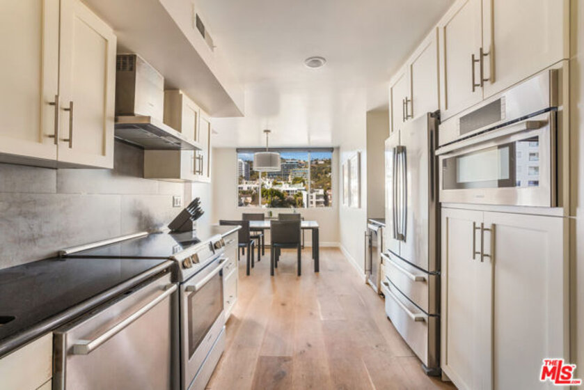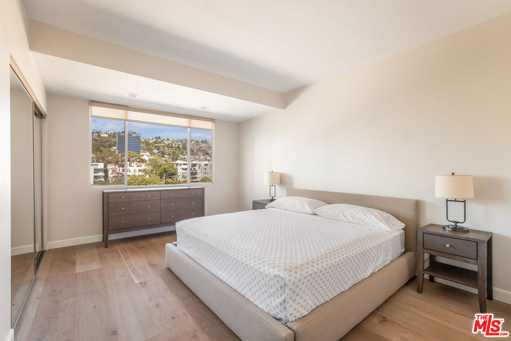 This modern pied-a-terre in the highly sought-after Doheny Plaza delivers immersive views of the city and the Sunset Strip. Situated on the border of Beverly Hills and West Hollywood, this iconic 13-story mid-century building, completed in 1963, offers a seamless blend of timeless design and modern convenience. Doheny Plaza provides a full-service, low-maintenance, luxurious urban lifestyle with 24-hour valet-parking, a newly renovated fitness center, a sparkling salt water pool, a conference room, and three guest suites available for visitors at a nominal fee per night. This renovated, north-facing residence features an open floor plan with two bedrooms, two bathrooms, and abundant natural light all throughout. Designed for both comfort and functionality, the spacious living area flows into a modern kitchen equipped with sleek cabinetry and high-end stainless steel Bosch appliances. The primary bedroom boasts generous closet space and an en-suite bathroom. Floor-to-ceiling sliding doors lead to a private balcony and frame panoramic city views that stretch across the Sunset Strip. With most utilities covered by HOA dues, residents enjoy effortless living with included water, electricity, and heating/cooling, along with 24-hour front desk service and secured parking. Just steps from LA's most exclusive social clubs, including Soho House, San Vicente Bungalows, The Bird Streets Club, and the world class dining and shopping Sunset Plaza living has to offer.