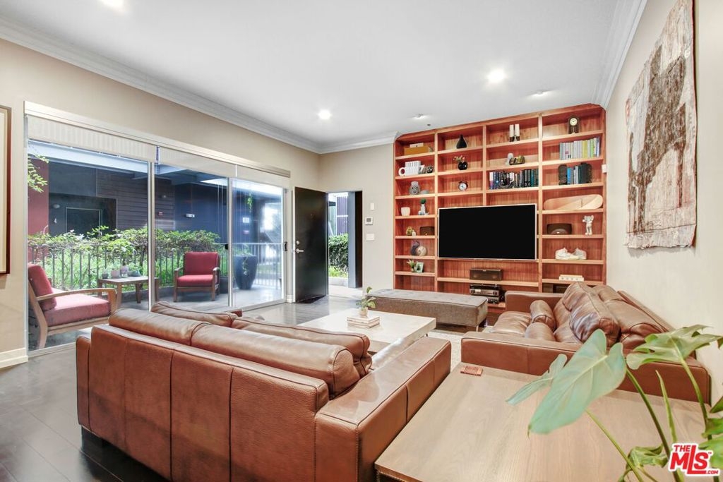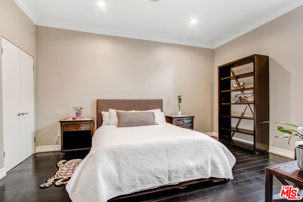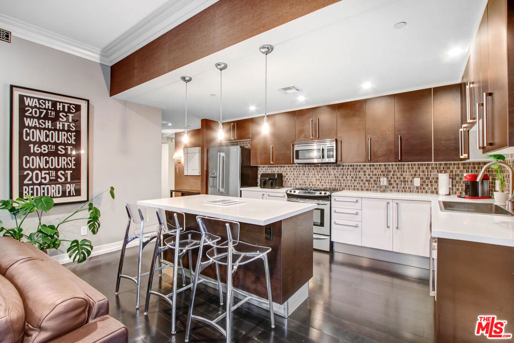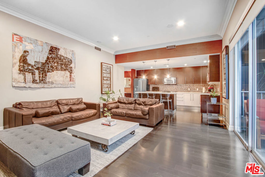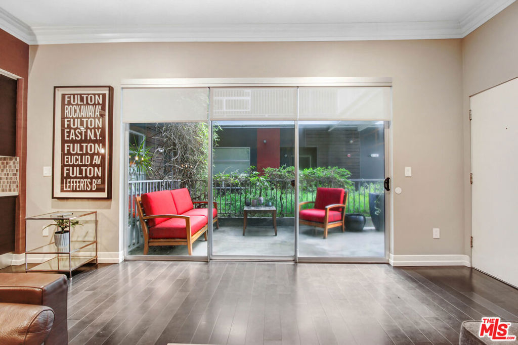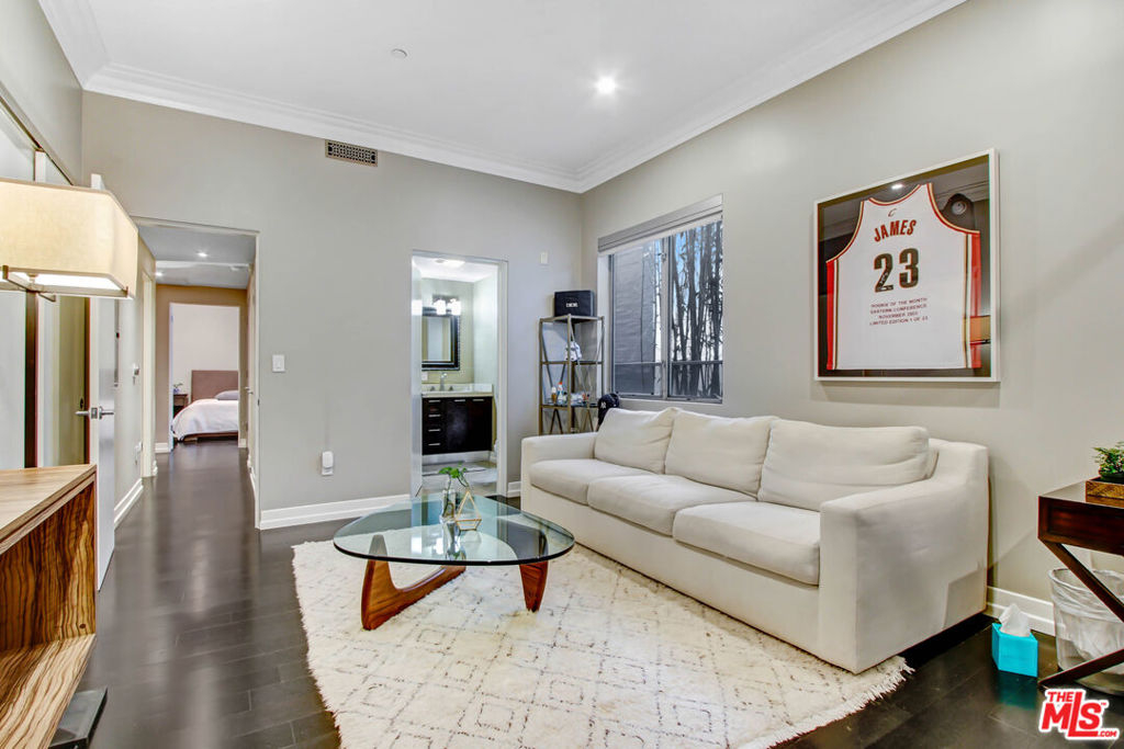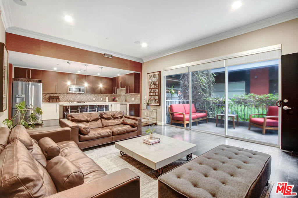 Location and style! This is a high design condominium in an architecturally significant property located adjacent to several shopping corridors. The property is just South of Santa Monica Boulevard and a few blocks North of Melrose, paces from coffee shops, boutiques, restaurants and other amenities. The unit has a large high-ceiling living room with an open modern kitchen and large sliding glass doors opening to a private patio. The setting, with large kitchen island, is ideal for gathering and entertaining friends. There are hardwood floors, granite counter tops, modern stainless steel appliances, imported Italian cabinetry and exquisite finishes throughout. The large primary bedroom features an en-suite bath and walk in closet. The second bath is in the central hallway and serves as the second bedroom bath and powder room. (the bedrooms are separated by lengthy hallway which affords privacy to the occupants of each) There is a spacious laundry closet just off the kitchen. The parking structure is large and secure, and the two parking spaces for this unit are side by side. ("Gardner 9", the name of the building, was designed by Lorcan Oherlihy and featured in Dwell Magazine)