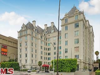 A tastefully remodeled condo in the historic 1930 Granville Towers. With unique E/W exposure, this jewel has direct views of the Downtown skyline from the kitchen, DR and master and has direct western views from the LR and second bedroom of two of Los Angeles' iconic structures: the Sunset Tower Hotel and Le Colonial, both conceived by the same architect, Leland Bryant. The unit brings NY living to LA by utilizing B/W honeycomb stones in the kitchen and basket weave patterned marble in the bathroom. The approximate 9' ceilings make the interior space grand. The entry foyer works as a great introduction to what the rest of the interiors offer. Chocolate floors throughout create a great foundation of space vs. views. The large, well appointed chef's kitchen offers Viking appliances, two wine refrigerators, black stone countertops, and farmhouse sink. The 24-hour doorman allows for peace of mind living, hence it is a well sought refuge for the well heeled and the entertainment elites.