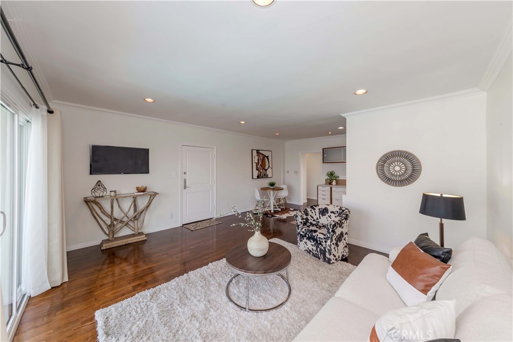 Enjoy the gorgeous city views of Hollywood Hills from your new home! This private, two bedrooms, two baths, top floor, end unit condo has no common walls. Bathrooms have been remodeled and updated with quartz sinks, marble tile tub, and an enclosed glass shower. Unit overlooks the pool and is bright with lots of natural sunlight. It has an open layout with hardwood floors, crown molding, and recessed lighting throughout the home. Bedrooms are spacious with plenty of closet space. Parking garage is gated and comes with two designated spots and a storage area. Amenities of HOA includes heated pool and an on-site laundry. Don't miss out on the opportunity to make this Harper Regency condo your new home, in the heart of the Sunset Strip with nearby trendy cafes, restaurants, shopping, entertainment!