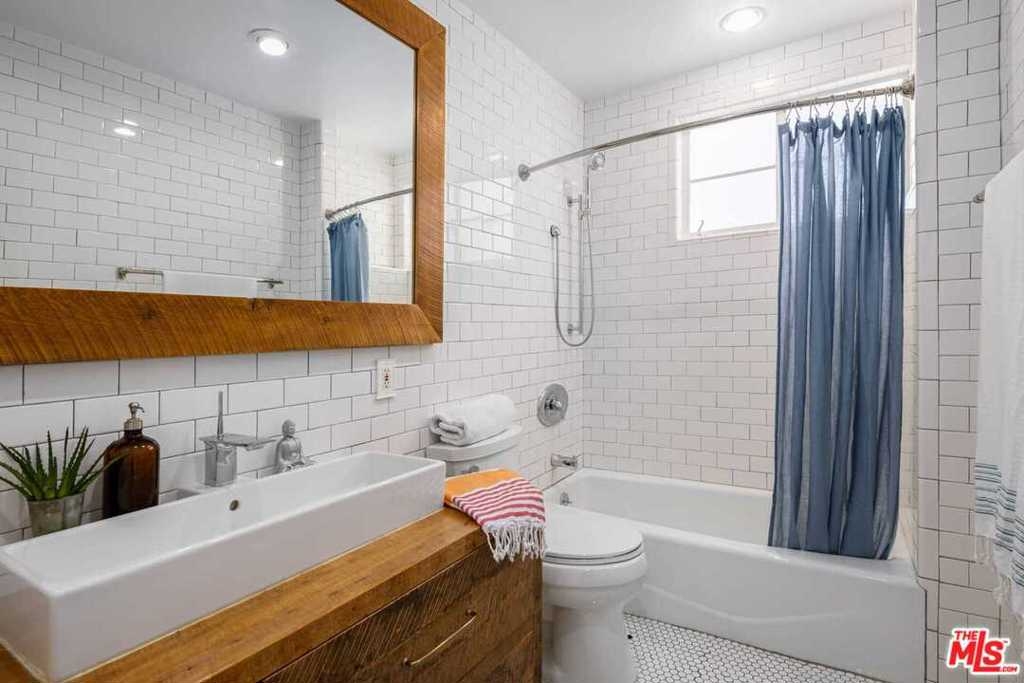 Classic 1950's mid-century character bungalow meets the ease of condo living in this low-rise courtyard building with sunny swimming pool and verdant landscaping. Located at the rear of the building with no common walls, the west facing location offers a light filled living space with views of the pool from picture windows, open living and dining area, and spacious kitchen featuring modern updates including newer wood and stainless steel cabinetry with double pantry, built-in appliances and washer/dryer. Hardwood floors throughout lead to spacious bedrooms, each with ceiling fans, generous closet space, and newer double paned windows. Updated bathrooms with newer vanities and subway and penny tile provide charm to the character-filled residence. Additional inside closets and storage. Private living in a quiet building with an old-Hollywood vibe. Great walkability to area dining, shops and grocery make this a practical and convenient West Hollywood location a destination to call home.