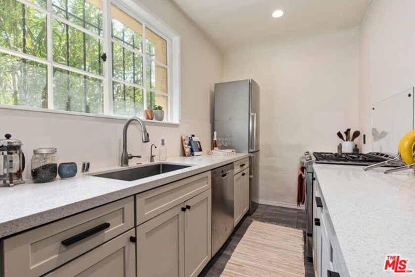 Welcome to Unit 1 at Hayworth Gardens - a private, secure sanctuary within a romantic 1929 Spanish hacienda built around a stunning central courtyard. Tucked along a beautiful tree-lined side street and just moments from Bristol Farms, Whole Foods, and an array of popular restaurants, this remodeled condominium offers the perfect blend of historic character and modern sophistication. From the moment you enter the building foyer, you're greeted by exquisite period tile work and a picturesque view of the central courtyard - a nod to the glamour and architectural romance of late 1920s Hollywood. Inside, the residence has been thoughtfully reimagined using high-quality materials while preserving its original Spanish charm. A wall of windows fills the open-concept living space with natural light, creating a warm and inviting atmosphere. The spacious living room flows seamlessly into the dining area and adjacent galley kitchen, offering both functionality and effortless entertaining. The kitchen is beautifully appointed with quartzite countertops, bespoke cabinetry, oil-rubbed bronze hardware and custom details, a five-burner stove, and stainless steel appliances by Bosch and GE. Wood floors run throughout the home, complementing fresh paint and refined finishes. A complete electrical rewire enhances both safety and modern convenience. The bedroom is thoughtfully positioned for privacy and connects to a spacious bathroom, creating a peaceful retreat separate from the main living areas. Located one level below the lobby, Unit 1 enjoys a private, standalone-home feel. An assigned gated parking space and a separate storage unit add everyday ease. Low HOA dues cover all utilities, providing exceptional value. Unit 1 offers a rare opportunity to own a home of timeless elegance, modern upgrades, and an unbeatable value for the location.