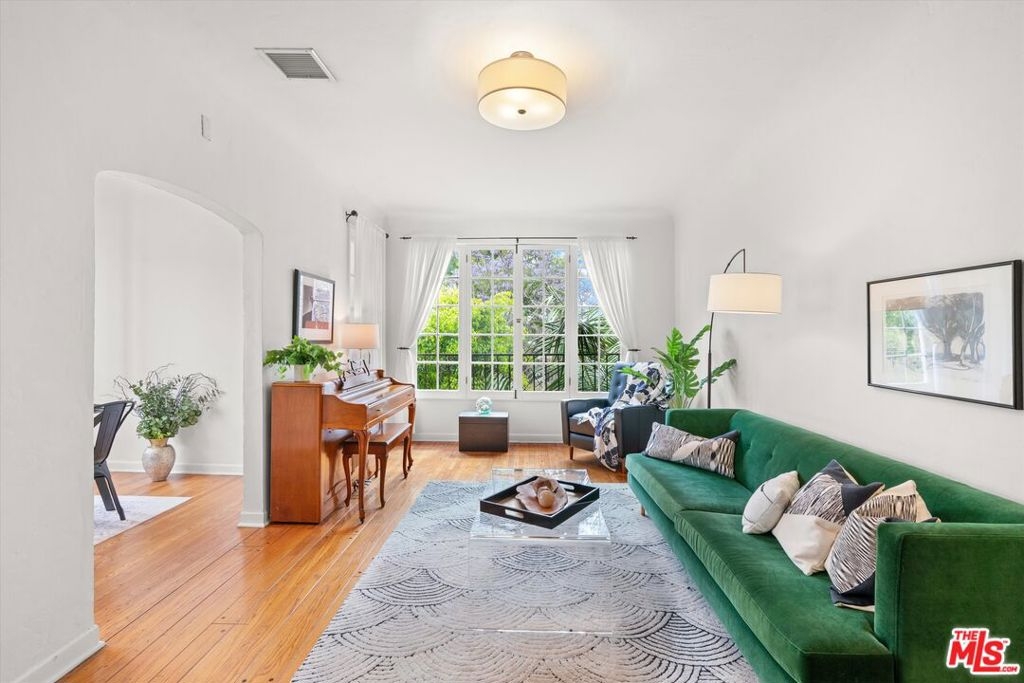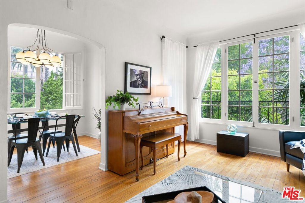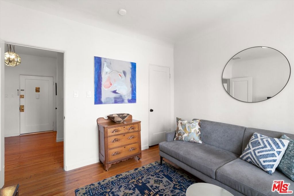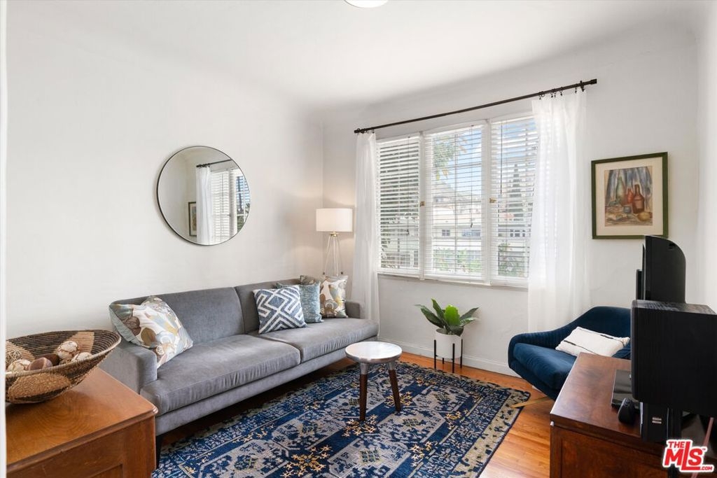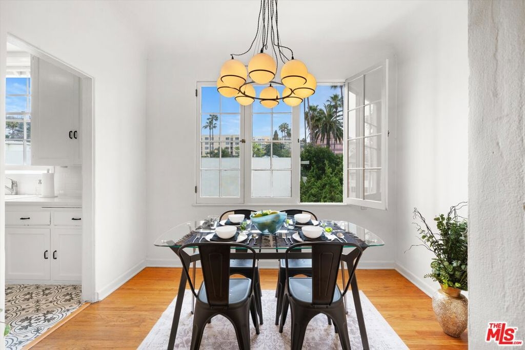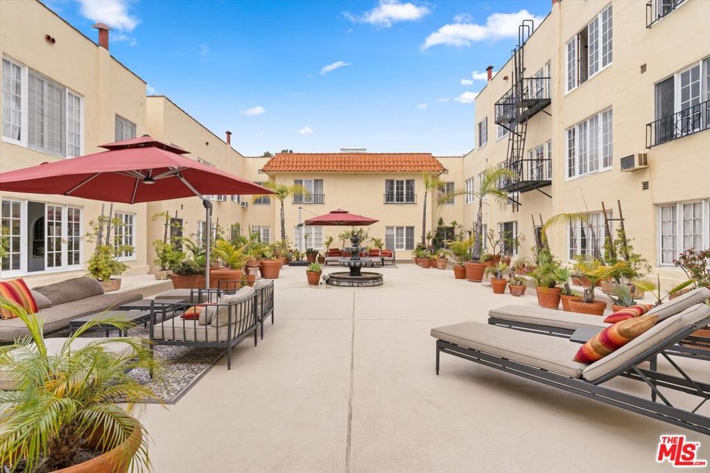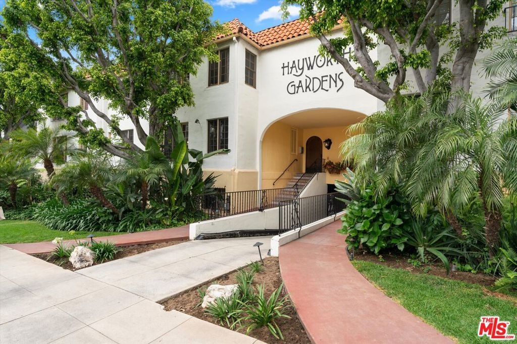 An Oasis of light greets you as you step into this top floor, corner unit of the romantic Hayworth Gardens, just south of Sunset Blvd. The natural sun pouring in from the front facing windows dances across the hardwood floors connoting a warmth and character not found in modern West Hollywood builds. Feeling much larger than the square footage suggests, the dining area between the kitchen and living room easily seats 6-8 guests and is illuminated by its own oversized window. The recently remodeled kitchen offers ample counter & cabinet space as well as newer, modern appliances, including a gas range. The large primary suite also has a front facing window and easily accommodates a king size bed with plenty of room left over for two dressers and nightstands. Separating the primary suite from the guest room is an open foyer & greeting area featuring four individual closets to fulfill your storage needs. The guest bedroom is ideal as an office, yoga, or media space and is in very close proximity to the guest bathroom. A well maintained central air conditioner and a wood burning fireplace assures comfort and warmth all year around. Hayworth Gardens is a pet friendly, historic 1920's Spanish/Mediterranean that welcomes guests into a nicely appointed lobby with direct access to a sizable central courtyard and picnic area with a flowing water feature and lovely outdoor furniture. Experience what Redfin classifies as a 'Walker's Paradise' with quick access to Trader Joe's, Bristol Farms, Starbucks, and many other fitness, shopping, dining, and entertainment establishments.