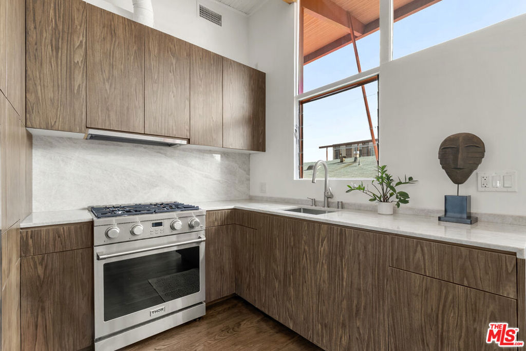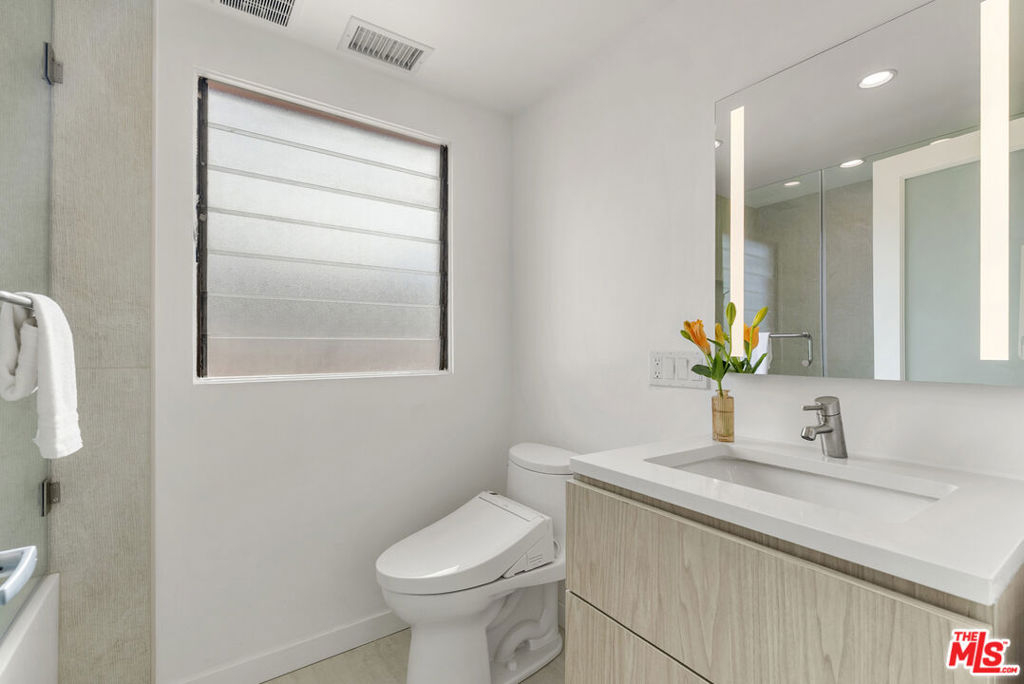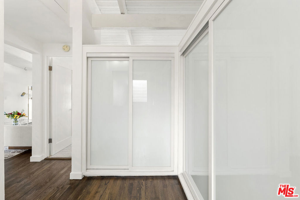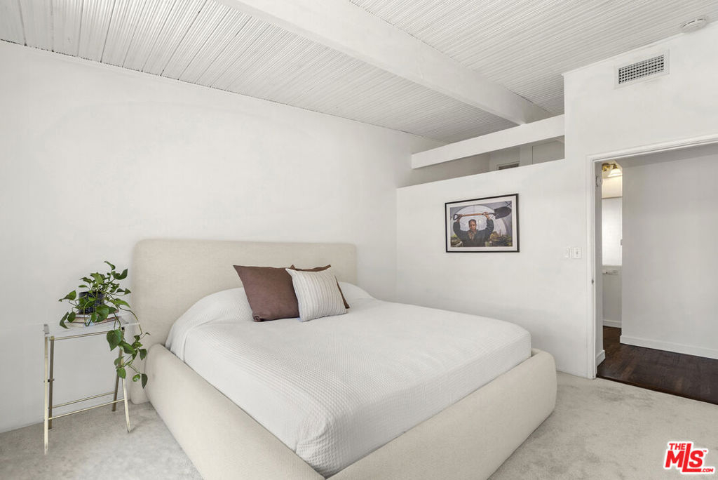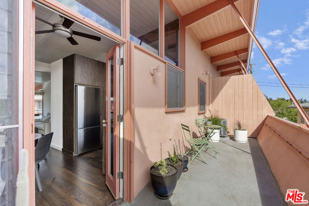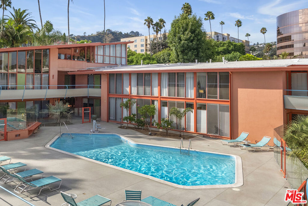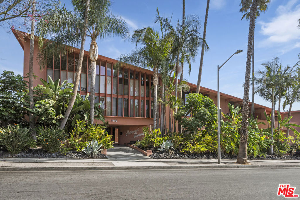 The iconic Hollywood Riviera is a celebrated West Hollywood landmark, designed in 1954 and embodying the quintessential mid-century Los Angeles aesthetic. Featured in publications such as Dwell and Architect Magazine, the building holds a coveted Mills Act historic designation, offering substantial property tax savings for its next owner. A recently completed renovation included earthquake retrofitting and a meticulous restoration of the common areas, returning the property to its original splendor. Residents now enjoy a resort-style pool with an expansive deck framed by lush tropical landscaping. This south-facing, upper-level residence showcases dramatic architectural elements, including vaulted ceilings, exposed beams, and floor-to-ceiling windows that bathe the interiors in natural light. Thoughtfully updated, the home blends authentic character with refined modern finishes. The kitchen is appointed with all-new custom cabinetry and appliances, Taj Mahal quartzite countertops, and clerestory windows. A renovated bathroom features a soaking tub, contemporary vanity, illuminated medicine cabinet, and upgraded plumbing. Additional highlights include a newer HVAC system, generous in-unit storage, and a private balcony spanning the length of the residence. Secure, automated gated entry provides two covered parking space, a rare amenity in the neighborhood, along with additional garage storage. The building also offers on-site laundry, controlled access, and earthquake insurance. Steeped in Hollywood history and often seen in film, television, and commercial productions, the Riviera remains one of West Hollywood's most enduring architectural treasures. Perfectly situated moments from the Sunset Strip's world-class dining, shopping, and nightlife, this residence offers the ultimate expression of California living.