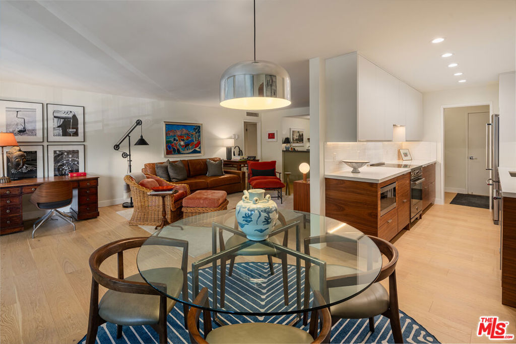 Experience sophisticated living in the heart of West Hollywood at the iconic mid-century Kings Plaza. This beautifully remodeled condo perfectly blends sleek modern design with timeless architectural charm, creating a chic and inviting retreat. Step inside to pristine white oak hardwood floors, setting the tone for an elegant yet comfortable living space. The expansive living area, bathed in natural light from floor-to-ceiling glass sliders, opens up to a spacious private balcony, ideal for morning coffee or unwinding in the evening. The gourmet kitchen is a chef's dream, featuring custom cabinetry, stainless steel appliances, and a Bertazzoni electric range oven, all complemented by high-end finishes. A custom wet bar with a dual-zone wine cooler adds a stylish focal point, perfect for entertaining guests. The serene primary suite offers floor-to-ceiling windows, flooding the room with natural light. The spa-inspired en-suite bath showcases modern fixtures and designer touches, while the in-unit Miele laundry system provides everyday convenience. A beautifully updated power room add the finishing touch. Residents of Kings Plaza enjoy access to a lush courtyard oasis, complete with a heated pool and spa. Located on a tree-lined street in a walker's paradise, this condo is near the Melrose Place Farmer's Market, high-end shopping, renowned restaurants, and trendy cafes along Melrose & Santa Monica Blvd. Don't miss the chance to own this exceptional mid-century modern condo in one of West Hollywood's most coveted locations!