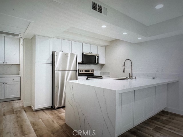 Location Location Location!!! Excellent walkability to restaurants and shopping! Completely Redone!!! New Kitchen and Bathroom remodel! Kitchen boasts new Shaker style cabinets with Quartz Carrera Marble Countertops with a large “waterfall” side. Cabinets on both sides of the peninsula give an abundance of extra storage, with an incorporated breakfast bar. Brand New Name Brand Stainless Steel Appliances. The bathroom was completely redone as well. New bathtub, shower enclosure, 1’x2’ Carrera style tile, vanity and mirrors. Fresh paint and new vinyl flooring throughout. The patio is enclosed and offers additional interior flexible space that could be used as a home office or a seating area. Formal Large Living Room offers a lot of natural light from the windows, and has a gas fireplace. Recessed Lighting in Kitchen, Dinning area and bathroom. The Primary Bedroom is large in size and offers a walk-in closet as well as a wall closet. The complex offers a Spa, Bonus Room, Workout Gym, Rooftop Deck and more. Gated garage with 2 tandem covered spaces come with the unit.
