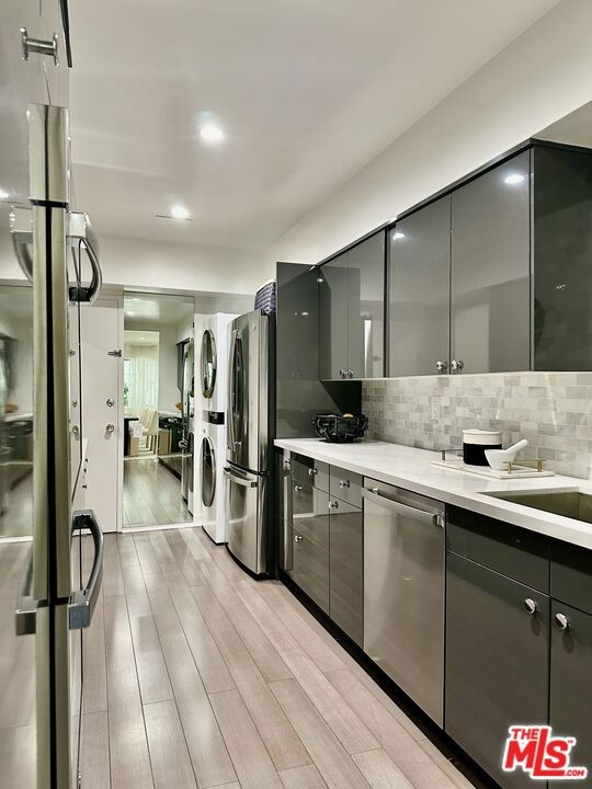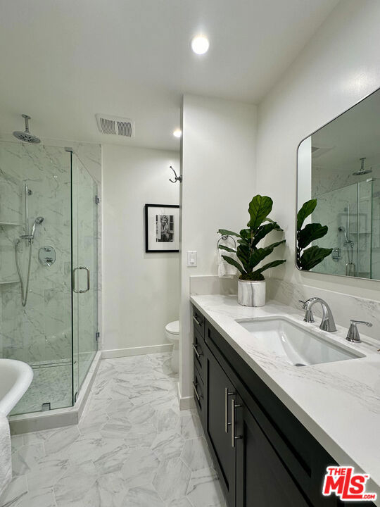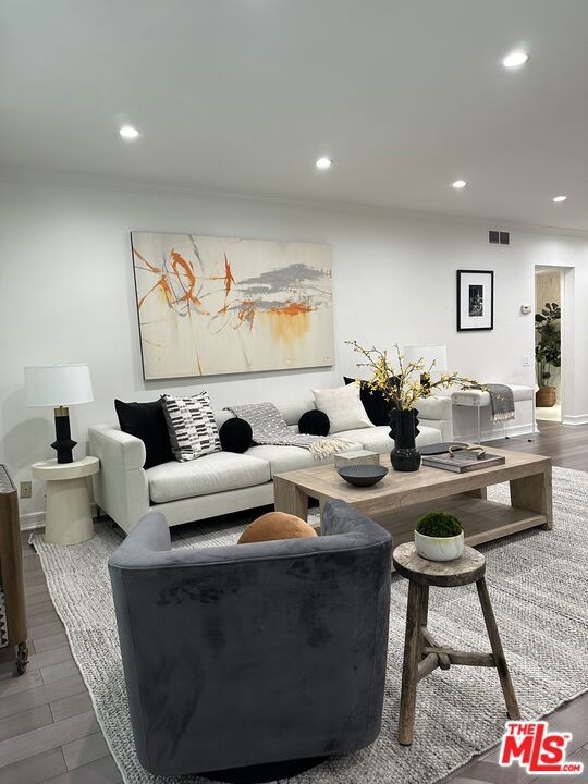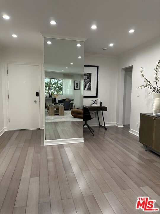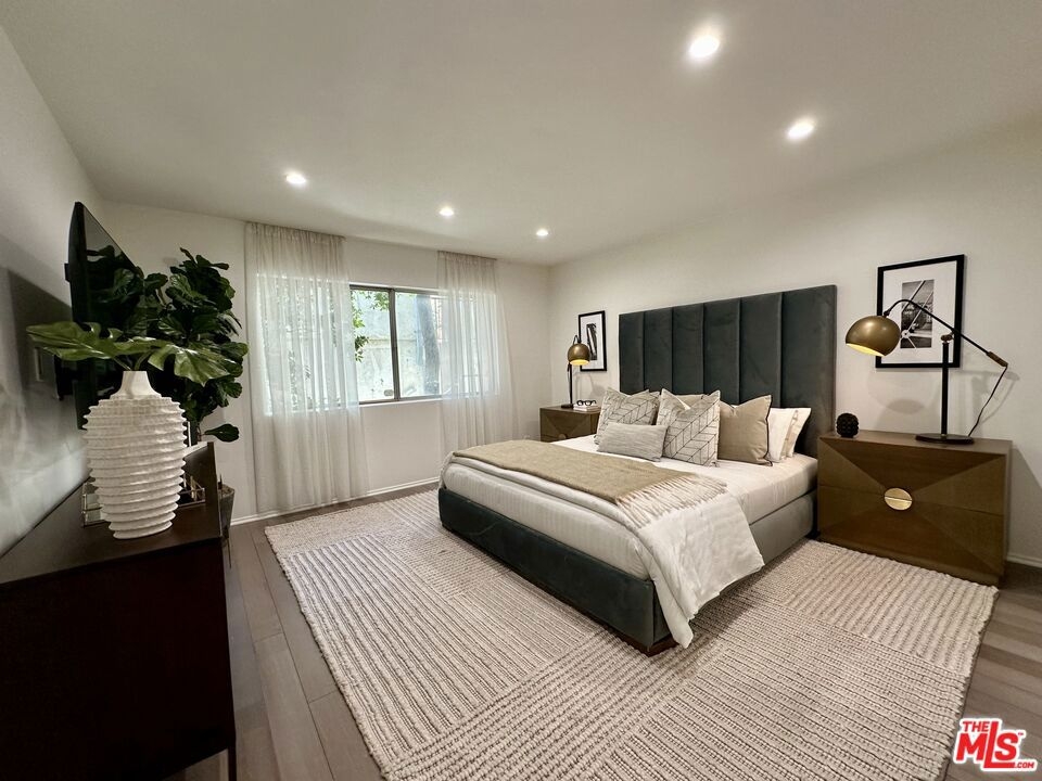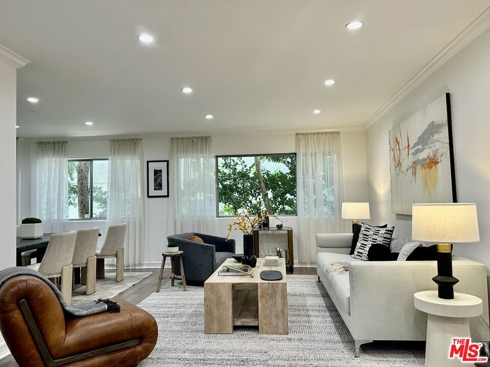 This fully remodeled one-bed, one and a half bath, single-level unit is beautifully situated on one of We Ho's most sought-after tree-canopied streets. An open floor plan with a wall of windows and tree line view. All new recessed dimmable lighting, and new engineered hardwood flooring are used throughout the home. The Chef's kitchens floor-to-ceiling custom cabinetry with new built-ins including washer& dryer. Gorgeous Caesar stone countertops and backsplash under cabinet. Stainless steel single oversized sink and GE appliances.), GE top-of-the line dishwasher, and new fixtures used throughout the home The spacious bedroom with ensuite separate glass shower and clawfoot soaking tub has custom cabinetry. Beautifully maintained building recently painted lobby and hallways with new carpeting. Property amenities include parking, pool, spa,. HOA fee includes water, trash & AC . Near beautiful Kings Road Park, minutes from Gelson's, Melrose Farmers Market, and the best new restaurants, clubs, and storefronts. The perfect condo for a West Hollywood location and lifestyle!