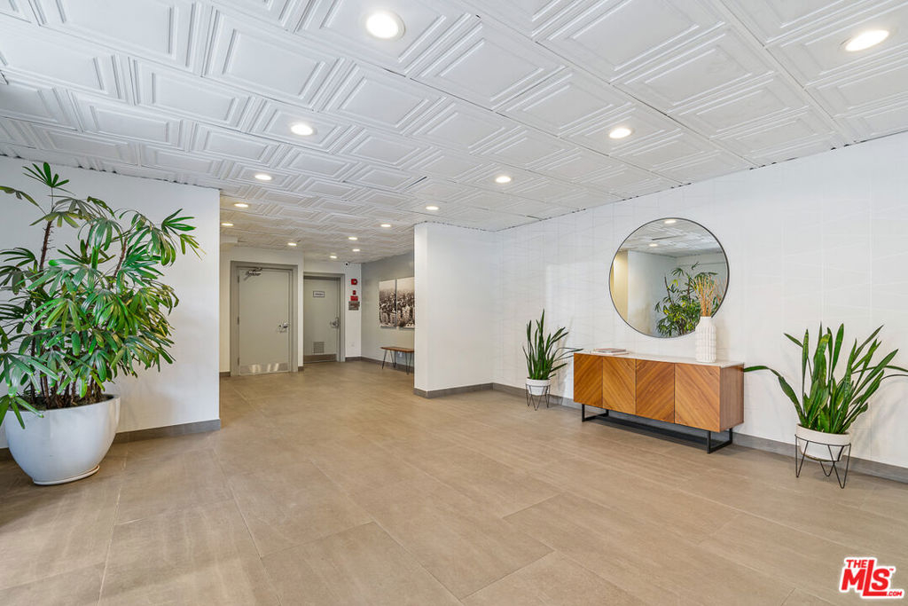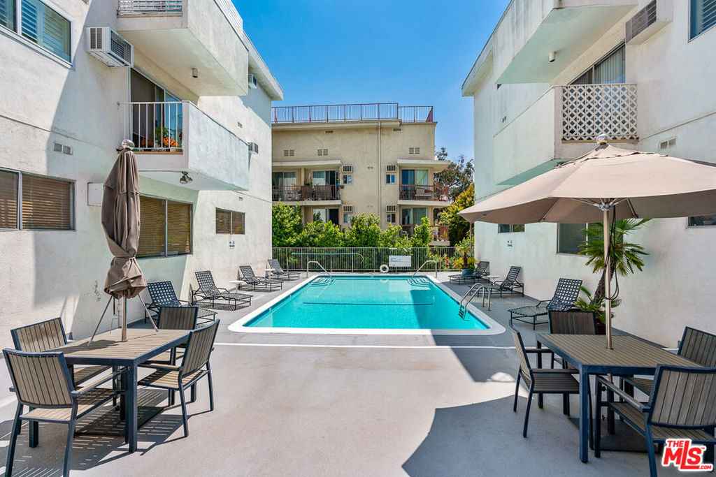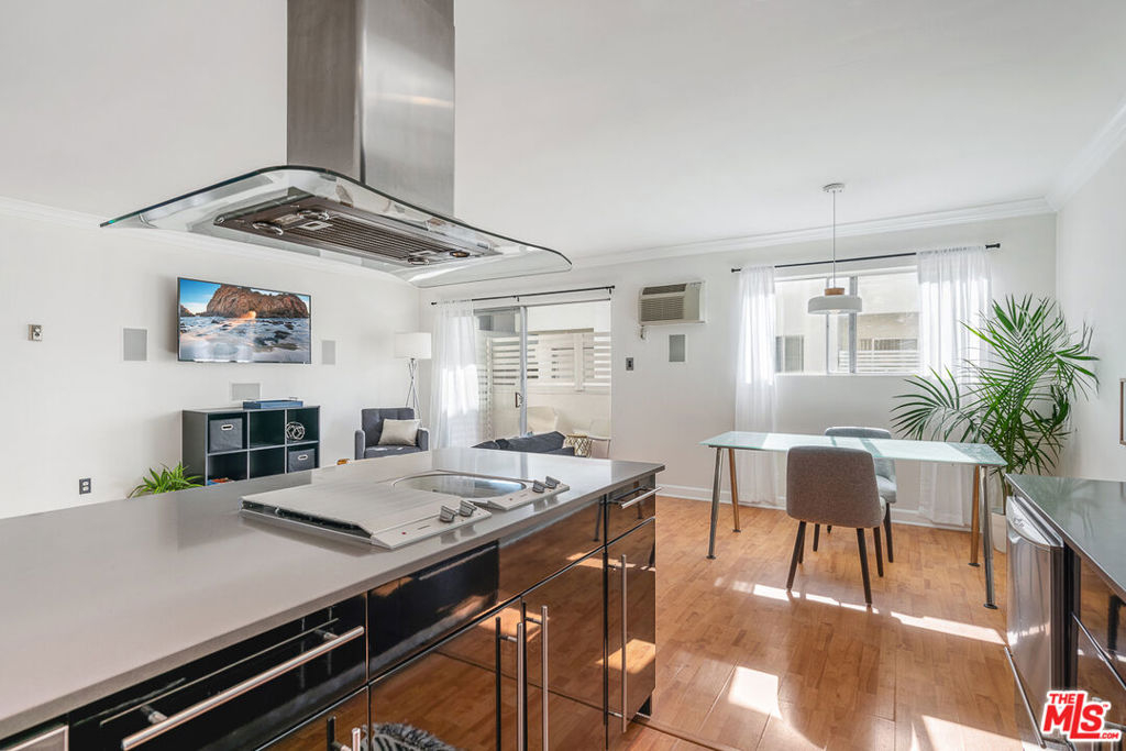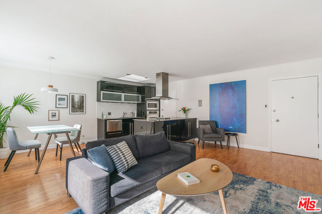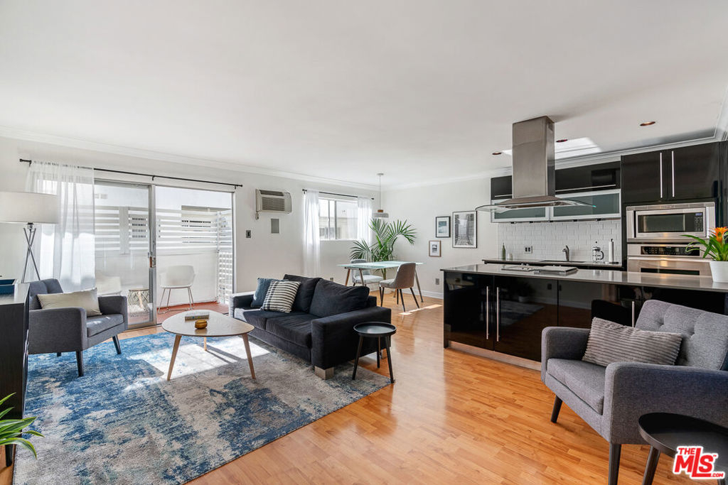 Thoughtfully modernized + sharp looking corner condo with lots of natural light that calms the senses with good energy. This spacious unit is open concept with large living and dining areas that flow together nicely on top of golden engineered wood floors that make a warm first impression. Modern kitchen with large island offers sleek corian countertops, gaggenau cooktop portfolio and new subway tile mosaic that awaits its next chef. Large light-filled bedroom with built in drawers and closet to organize yourself clean. Bathroom has a newer vanity with shelves next to a hallway closet. Freshly painted warm white interior with new light fixtures along with a large terra cotta painted balcony paneled with privacy to enjoy your morning coffee. Interior facing condo is on 2nd level that offers some real peace and quiet. Washer + Dryer can be installed with HOA approval. Low monthly HOA of $430. Building offers a pool, rooftop deck with very cool LA views, a gym, mailroom and gated parking with 1 space. Pets allowed, long term rentals only - HOA covers most utilities. This place will make you a smile, come take a look!