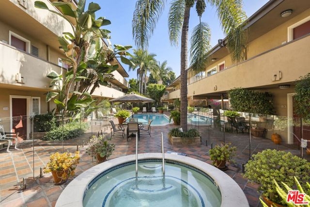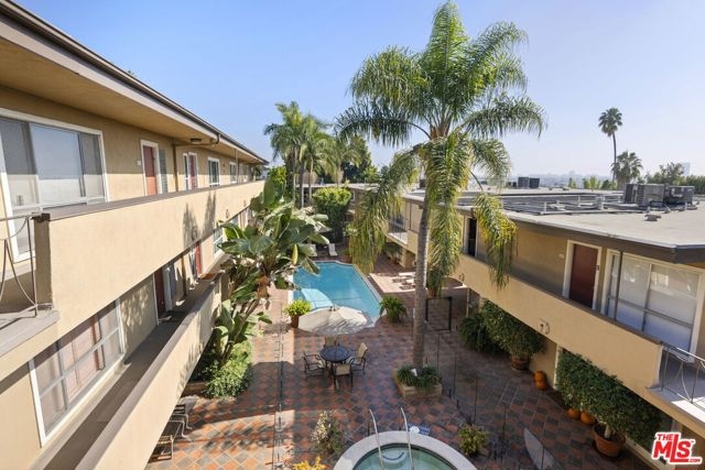 A location that must be experienced to be believed! 970 Palm Ave #218 sits on the top floor of a lush, tropical mid-century building that's so beautifully maintained, its charm is immediately apparent. Peacefully tucked away in the heart of West Hollywood, this hidden gem is surrounded by the city's most iconic destinations: the Sunset Strip, Santa Monica Boulevard, the Norma Triangle, and just moments from Beverly Hills. Live steps from the best of LA, where world-class dining, legendary nightlife, chic boutiques, and cultural landmarks are right outside your door. This move-in-ready home blends mid-century character with modern updates, offering roomy layout, a sleek kitchen with new LG refrigerator, a spa-inspired bath with frameless glass shower and a skylight that fills the room with natural light. You'll also love the large tall window in the living/dining area facing the center courtyard, allowing tons of light with foldable shutters that provide privacy when desired. With few shared walls and no neighbors above OR below, you'll have an uncommon sense of privacy rarely found in city living. Enjoy resort-style amenities, including a sparkling heated pool, spa, BBQ area, keyless entry, one secure parking spot (plus extra storage), a private dog walk, and impeccably maintained grounds, all within one of West Hollywood's most walkable and desirable neighborhoods.