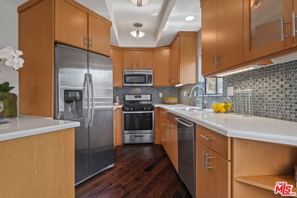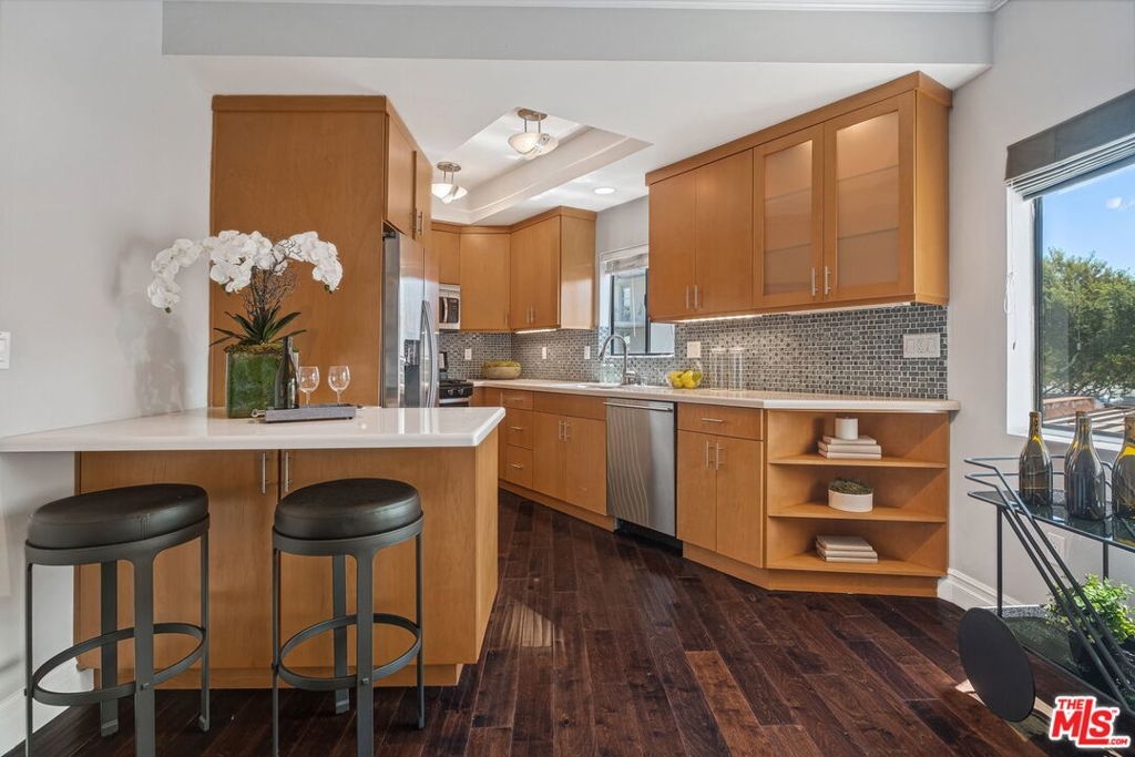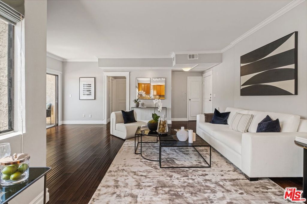 This well located, and large two bedroom, boasts convenient access to all the wonders of West Hollywood. South facing exposure and open layout make for a light & bright unit. Work from home at the remodeled kitchen bar area, or your second bedroom. Upgrades include wood flooring (see image of newly installed light oak flooring), sliding glass bathtub panel, floor to ceiling shower tile, and all S/S appliances. Cook at home while enjoying kitchen window views across to the PDC. Lobby and elevator have benefited from recent updates. Two side by side parking spots, dedicated storage room and in unit laundry all make this offering a great buy.