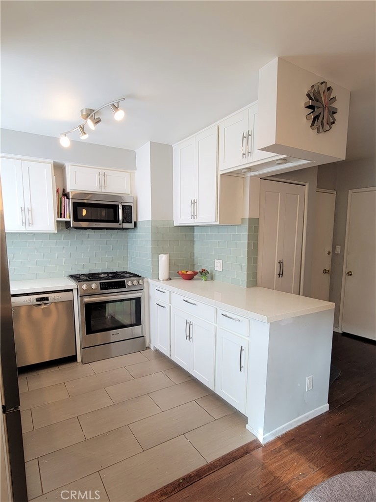 Bright, spacious 1 bdrm/1 bath, 769 sq ft, ground floor. Includes assigned covered parking, storage, backyard, and newly remodeled pool/lounge area. In a building of just 21 units in the vibrant heart of West Hollywood, near Trader Joe’s, Whole Foods, Griddle Café, 24-hr RiteAid, cafes and cocktail spots. Entry intercom is camera and web enable for video. Cleverly designed and energy efficient, with all-new plumbing, electrical, two HVAC split systems, double-pane windows, new flooring, remodeled kitchen with restaurant-grade gas range, new appliances incl full size washer/dryer. The back yard is fenced and a quiet place to bring your puppy, and enjoy the orange and lemons from the trees in the back garden. Highly energy efficient appliances, making any utility bills very minimal. Hot water is included in the HOA dues, Low electric and gas bills, even on the hottest and coolest days. Kitchen appliances are state of the art, Custom kitchen includes Bosch oven stove and convection oven, Bosch high efficiency Fisher & Peykel Refrigerator, water filter and ice maker. All inspections and Full renovation in 2017 permitted work on plumbing, new electrical and resurfaced hardwood floors. The unit is securely located in the quietest and most private area of the building with a garden and view of the pool. One unit above you has soundproofed flooring, lots of light and quiet.