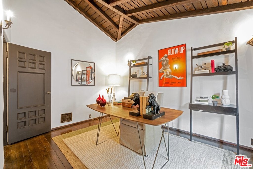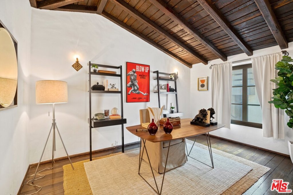 "SPANISH CASTLE MAGIC" Steps from the Sunset Strip and Chateau Marmont, The Andalusia is the quintessential Spanish Revival Courtyard building in Los Angeles. A true architectural masterpiece built by the Zwebells in 1926 and once home to Jimi Hendrix, Marlon Brando, Caesar Romero, Louis LAmour, and Jason Schwartzman (to name a few). This 2BR + 1BA unit is ideally located on the upper level at the rear of building, affording enchanting views of the lush courtyard gardens from two balconies. The lofted wood beam ceilings and clerestory windows bring in a flood of natural light. Wood floors, wrought-iron fixtures, and original tile work throughout plus a classic Beehive fireplace. The kitchen includes a refrigerator, dishwasher, and Viking Range and is otherwise period correct. There is a bonus office area above the living room that is simply magical. The Andalusia is on the Historic Register and Mills Act offering significant property tax savings. This one is truly rare and magical.