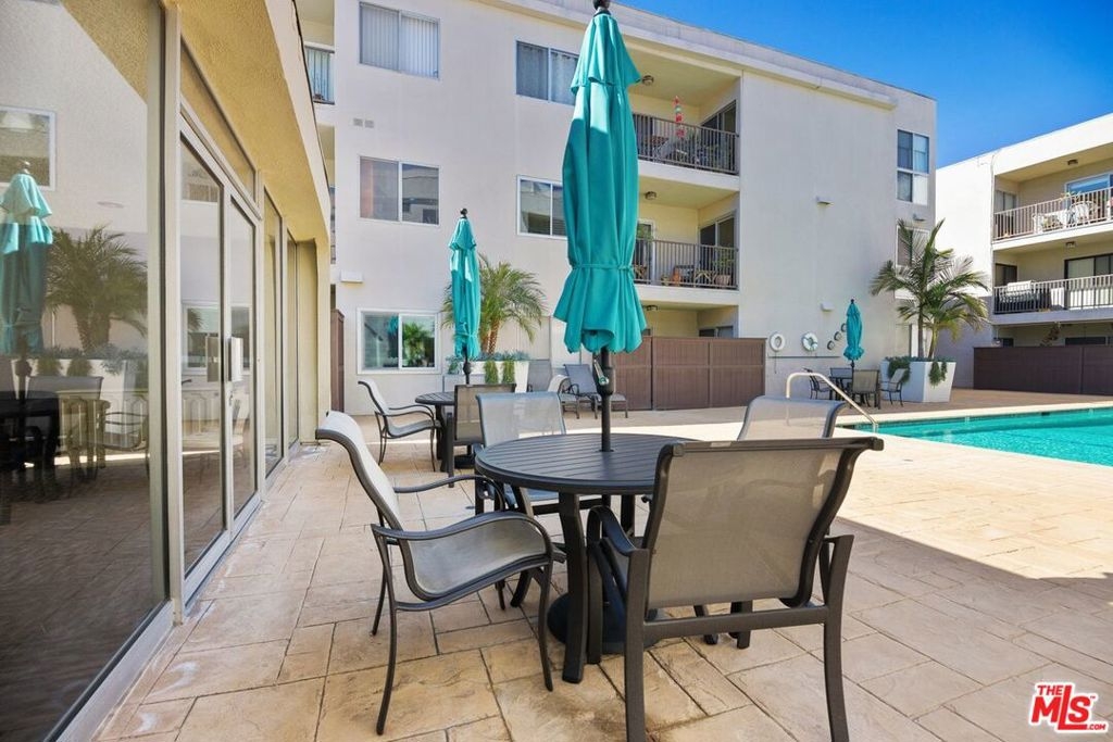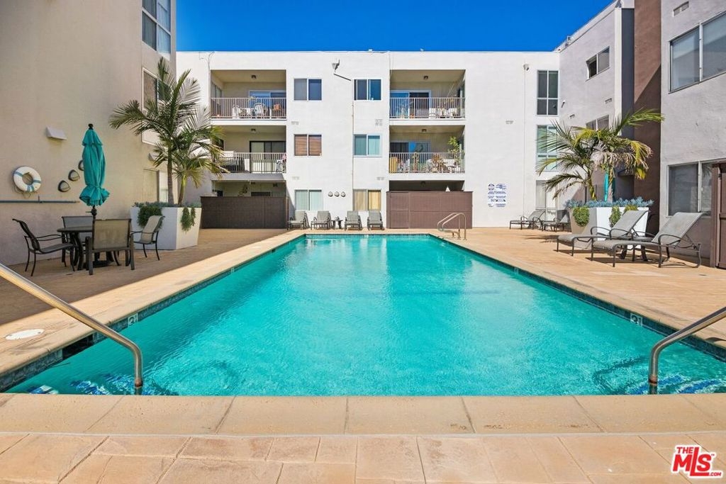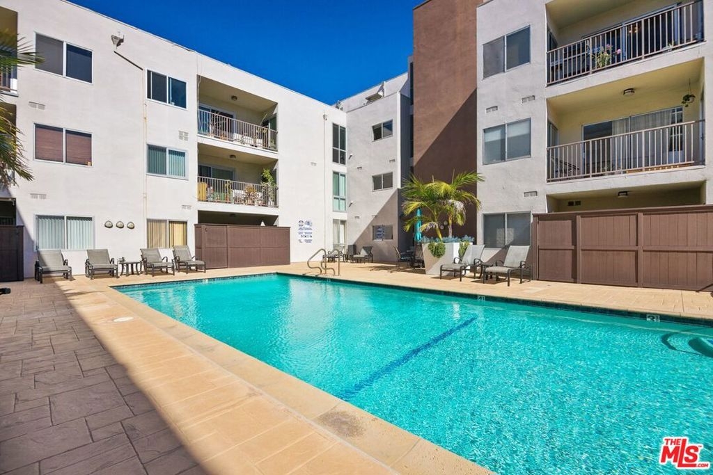 A unique opportunity to own a condo home on coveted Kings Road in one of LA's most sought after neighborhoods. TOP FLOOR...NO COMMON WALLS!!! Enter into a spacious, light-filled living room with bamboo floors, plantation shutters, an inviting fireplace and a balcony overlooking a sun-drenched pool area. The kitchen has stainless steel appliances, built-ins, loads of storage and a breakfast area with access to the balcony for enjoying your morning coffee. The oversized master suite easily fits a king bed, and sofa and/or desk. It has plantation shutters updated bath, floating custom vanity with double sinks, built in shelves, a tub with shower above as well as a separate stall shower. Separate office (or small 2nd bedroom) with access to the balcony is a great bonus space with multiple uses. There is also a powder room 1/2 bath for guests. Washer and Dryer can be installed with HOA approval.Low HOA dues include earthquake insurance. The common area includes a large heated swimmer's pool, lovely deck area, clubhouse and a sauna. Steps from Melrose... farmers market, fabulous dining, shopping, night life, galleries and cafes!