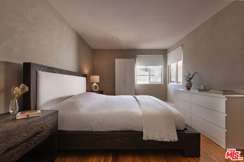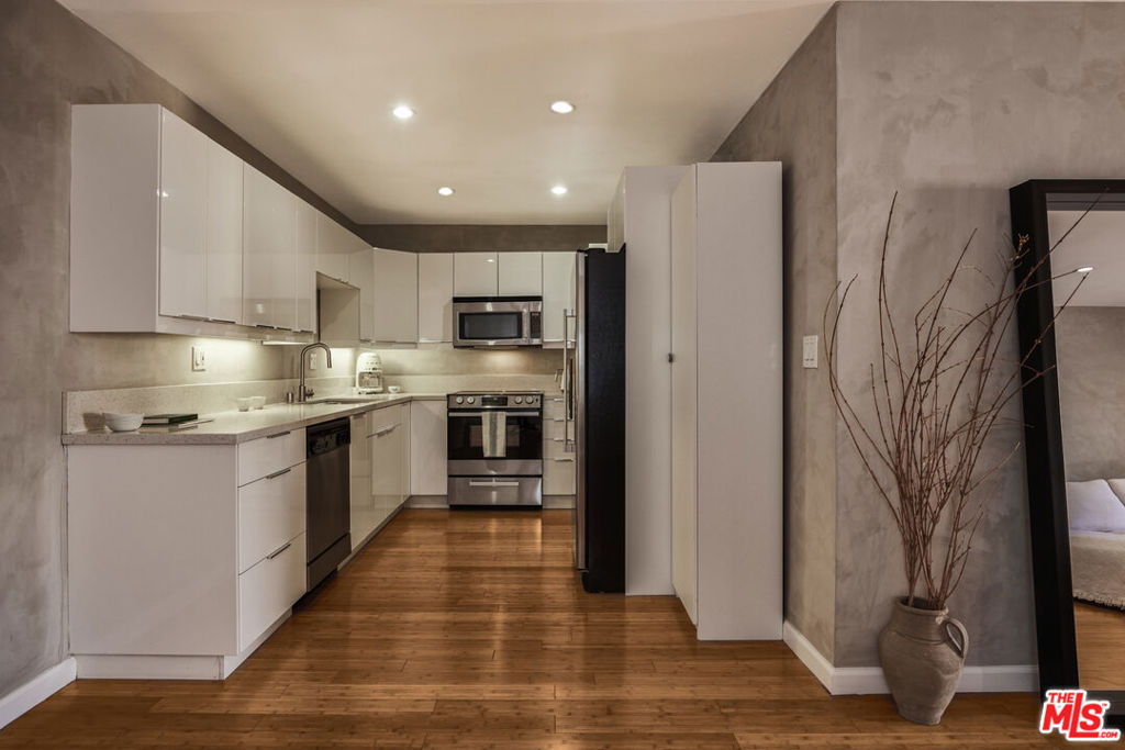 Designer top floor condo located in the best part of West Hollywood, the Melrose Design District. This modern space has been remodeled to perfection featuring a new kitchen with stainless steel appliances, open plan living/ dining area with a sizable balcony, and a naturally bright primary bedroom with ample closet space and a shoe closet. Miele Washer/ Dryer in unit. Building features include controlled access, underground gated parking, an elevator, and additional storage space. Moments from award-winning restaurants, coffee shops, gyms, and designer shopping on Melrose, Santa Monica, and Robertson. Near West Hollywood Park, with local recreational activities including tennis courts, rooftop swimming pool, library, and two dog parks. A must see.