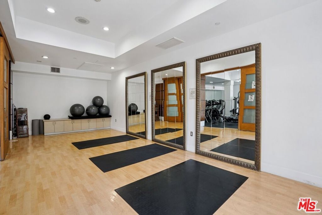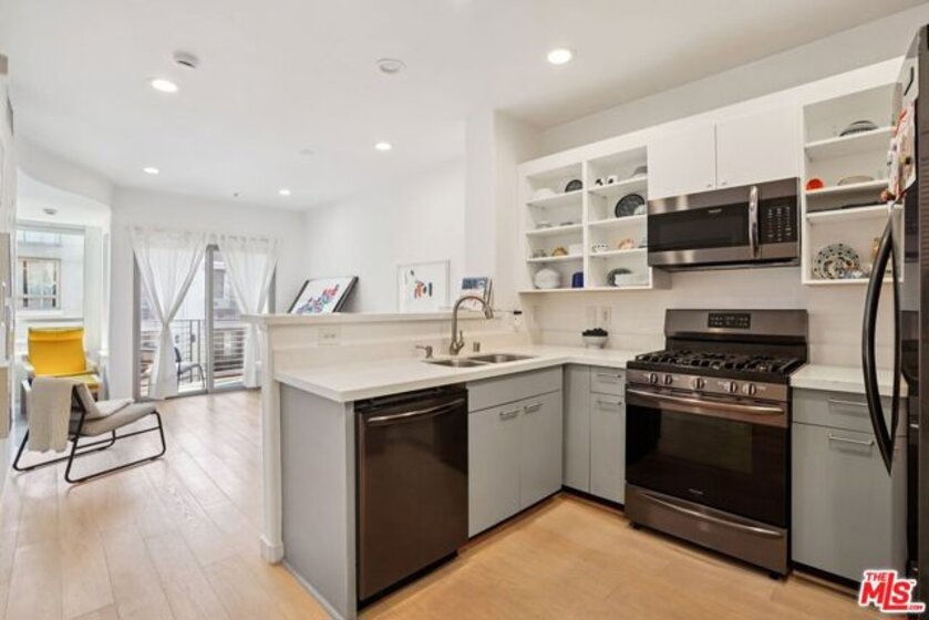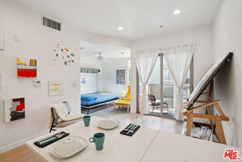 Perched on the top floor, Residence #419 offers a rare sense of volume, light, and creative clarity. Currently serving as the West Coast studio for an accomplished contemporary artist, the space has been thoughtfully refined to support both living and artistic expression. Natural light pours in throughout the day, enhanced by taller ceilings and an open layout that feels airy yet grounded. Recessed lighting adds a gallery-like quality, ideal for showcasing artwork or creating a calm, focused environment. The interior has been carefully updated with engineered light wood flooring set over cork underlay for warmth and comfort underfoot. The bedroom area comes with a large walk-in closet and a built-in wall bed allows the space to transform effortlessly while maintaining openness when desired. Honeycomb shades, operable from both top and bottom, offer nuanced control of light and privacy. The kitchen features newly painted cabinetry and updated appliances. The bathroom has a refinished tub/shower, vanity and textured stone flooring, which brings a subtle, tactile contrast to the clean aesthetic. Additional upgrades include a new HVAC system and an in-unit washer and dryer. A sliding glass door leads to a private balcony overlooking the interior courtyard, extending the living space outdoors. One assigned parking space completes the offering. A refined and flexible top-floor studio, equally suited for creative work, quiet retreat, or modern city living. Set within the amenity-rich Savoy, moments from the culture, dining, and creative pulse of Little Tokyo and the Arts District.