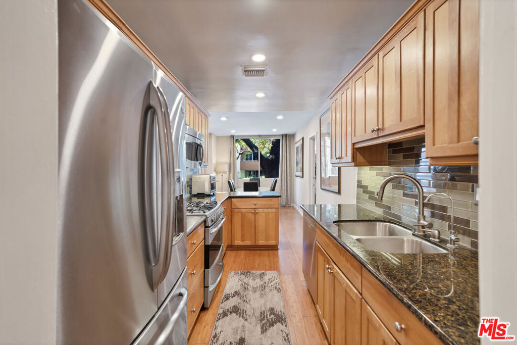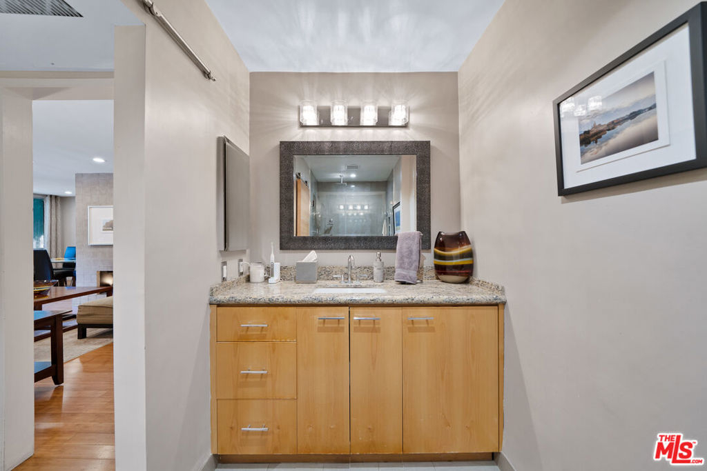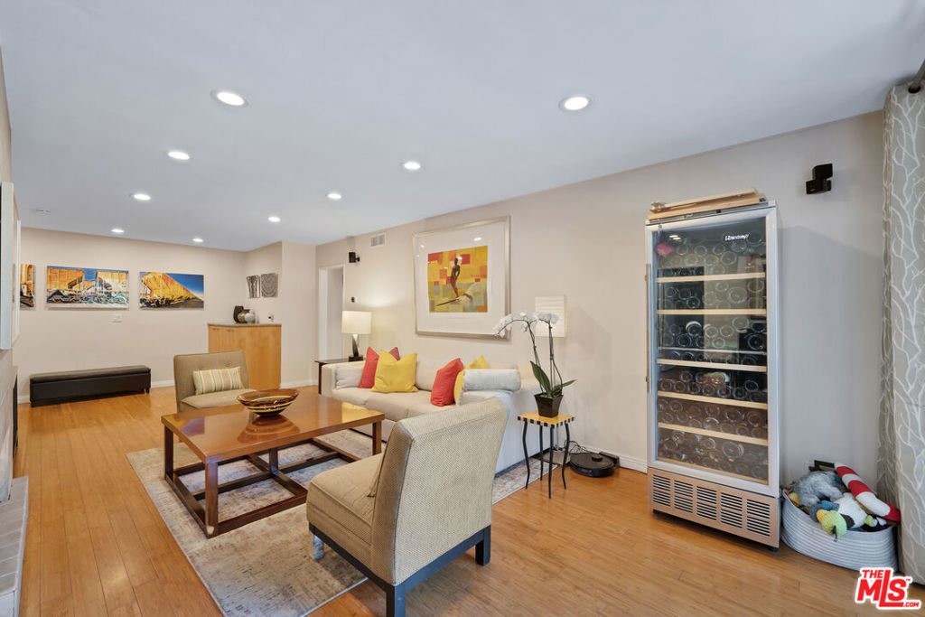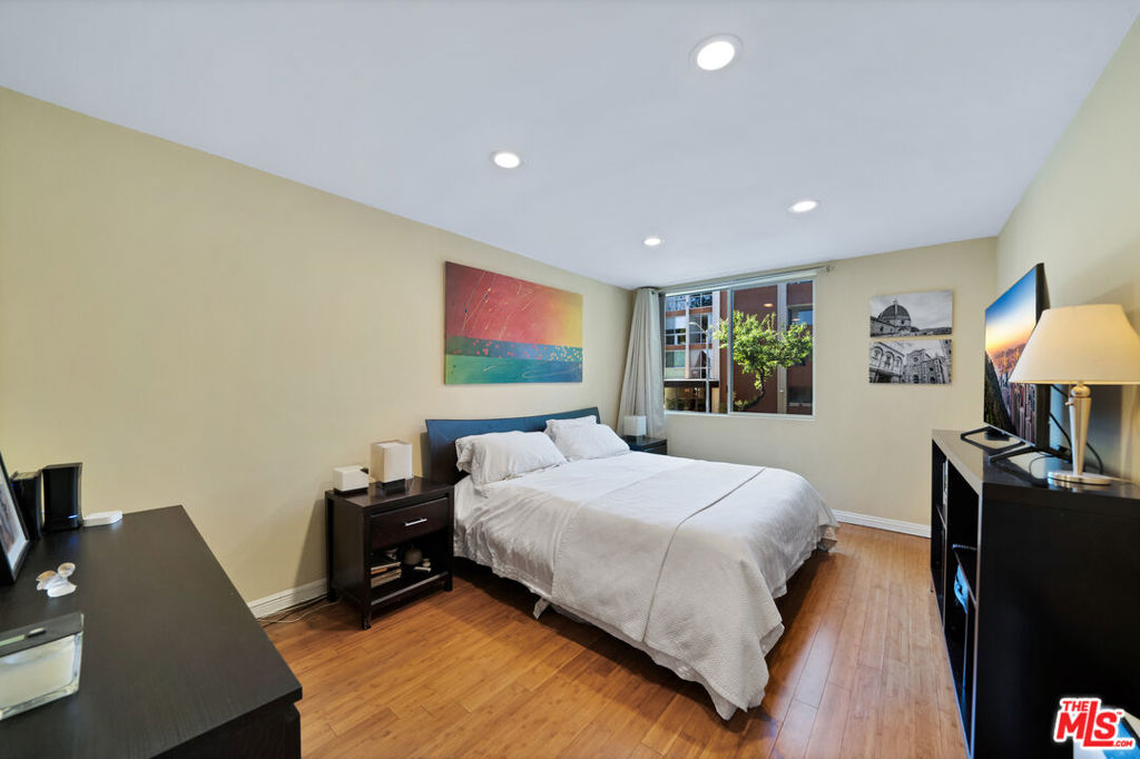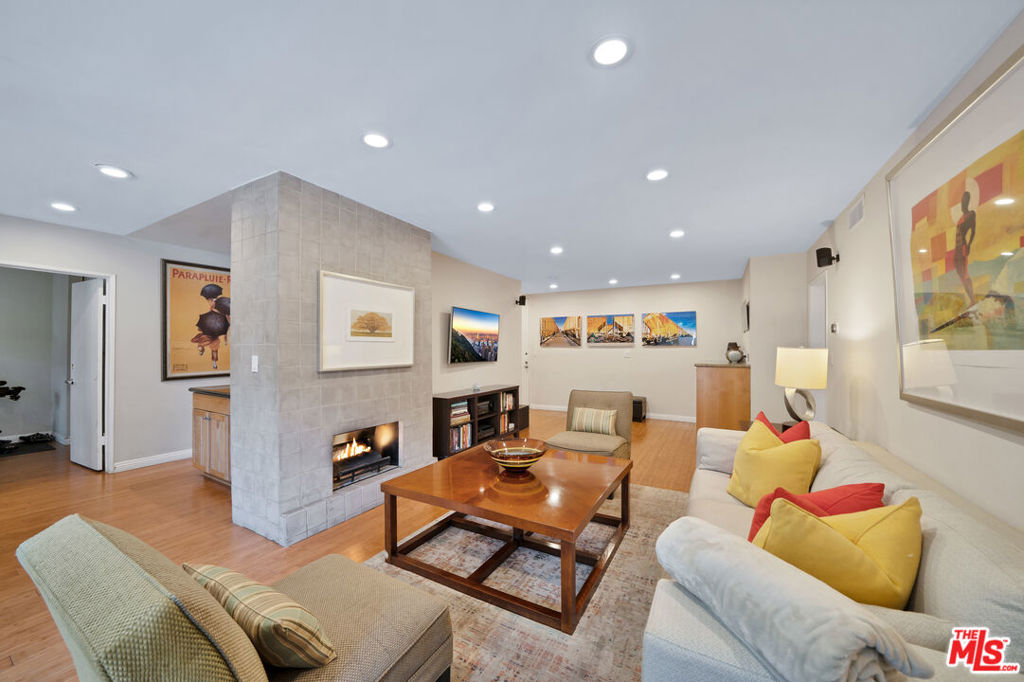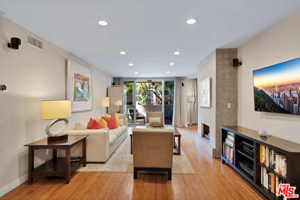 This fabulous front facing elevated first floor condo is the one you've been waiting for. Conveniently located just South of Santa Monica Blvd in the center of West Hollywood, this two bedroom one and a half bath unit offers a desirable split floor plan, walk in closet in bedroom, bamboo flooring throughout, a gorgeous spa like bathroom including oversized custom glass shower complete with rain shower system and body jets, newer central air conditioning and heat with Nest thermostat, smart LED recessed lighting, newer windows and sliding glass door, updated kitchen with granite counters and stainless steel appliances, gas range, romantic gas fireplace, and wall to wall sliding glass doors which open to the balcony. West facing, this home gets beautiful afternoon sunlight and is great for pets, take the dog and be outside within seconds, West Hollywood public park right next door. Two side by side parking spaces with a large storage closet. The building is currently remodeling the common area hallways and lobby with cool grey tones, new lighting fixtures, and new lobby furniture on the way. You will love the common area rooftop deck, newly remodeled gym with Peloton bike and tread, and indoor pool. Truly a great find in a great location.