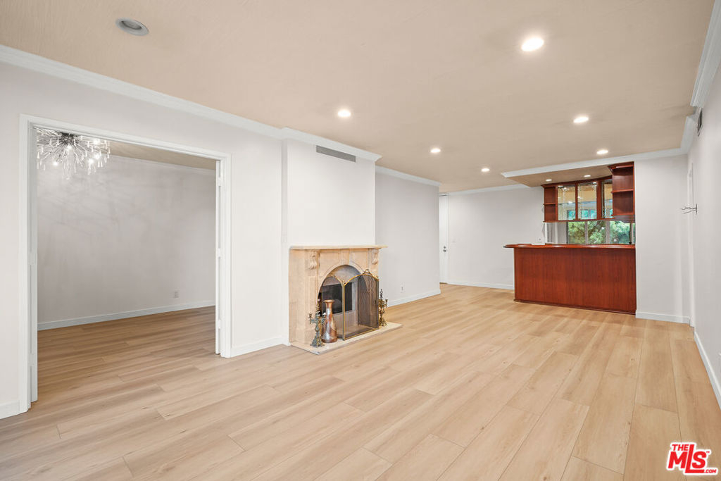 Stylish and spacious top-floor 1-bedroom, 1-bathroom condo in the heart of vibrant West Hollywood. The inviting living room is perfect for entertaining, featuring a decorative bar, cozy fireplace, recessed lighting, and sliding glass doors that lead to a private balcony. The modern kitchen offers stone countertops, ample cabinet space, and elegant glass shelving.Double doors open to a generous dining area, ideal for hosting dinner parties. The large primary bedroom is filled with natural light and enhanced by recessed lighting, plus a walk-in closet for plenty of storage.Community amenities include two assigned parking spaces with storage, a pool, spa, fitness center, guest parking, community laundry, and a rooftop deck with stunning views. Just steps from Kings Road Park and minutes from West Hollywood's premier shops, dining, and entertainment. Washer/Dryer can be installed per HOA rules.