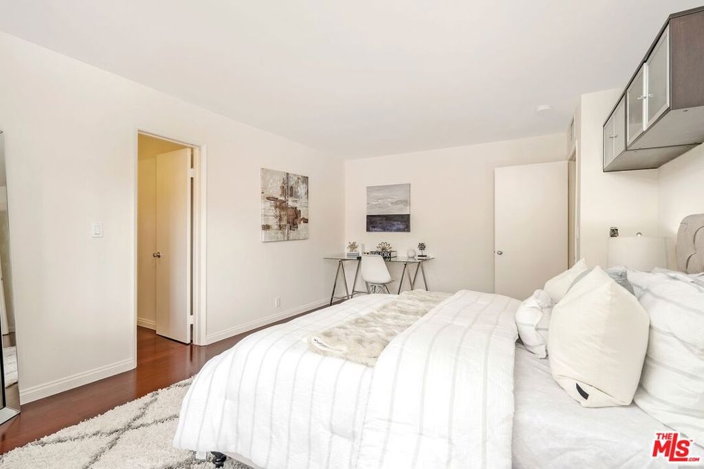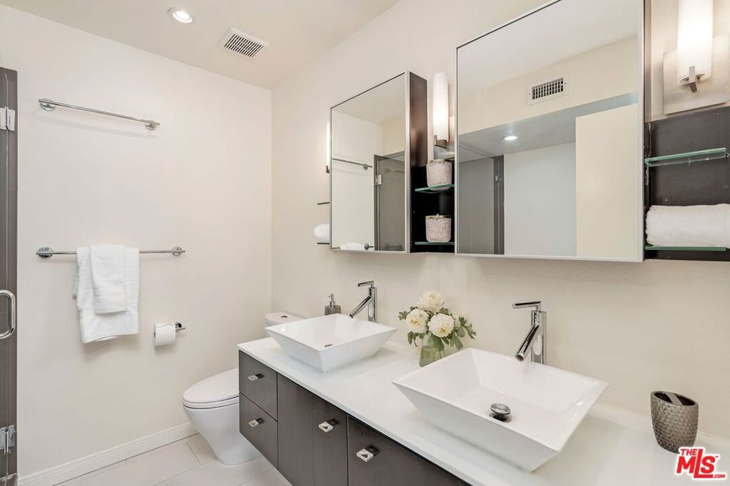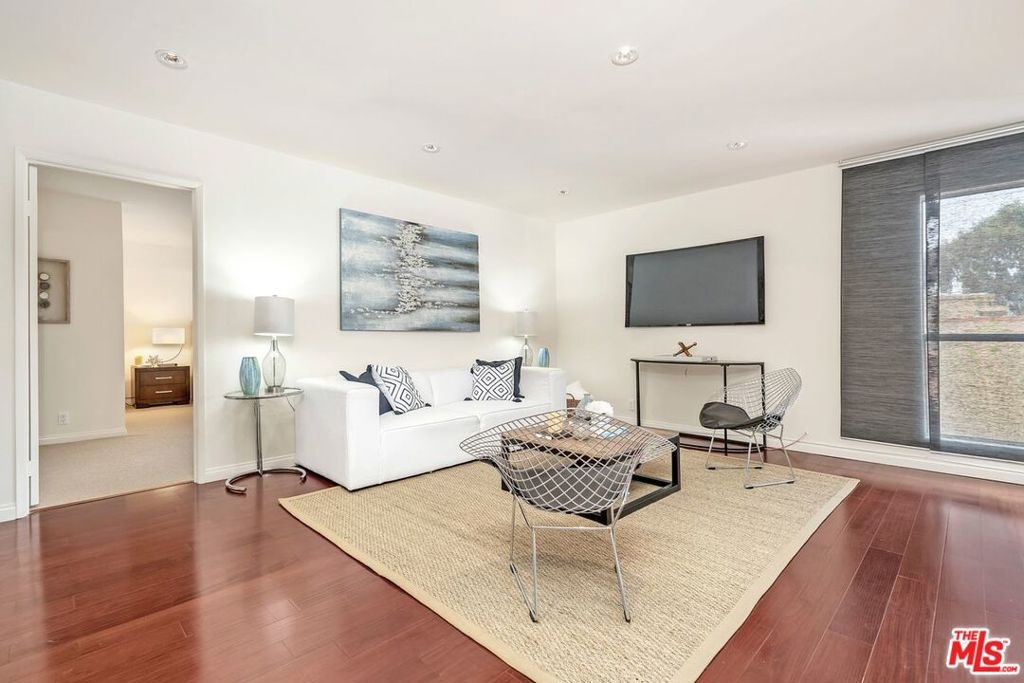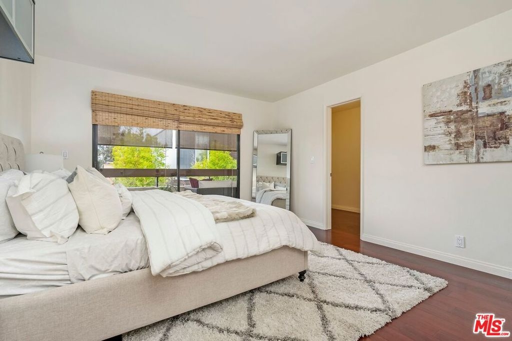 No expense spared with this large, light and airy condo. Double doors open to a formal entry with Santos Mahogany Hardwood Floors and a coat closet with built-in-drawers. The large open, floor plan features a chef's kitchen with custom cabinets, stainless steel appliances, breakfast bar, glossy black subway tile and separate laundry room. The living room and dining area make it ideal for entertaining with wired surround sound and access to a larger west facing terrace, fantastic for relaxing with a cocktail. The master bedroom has a walk-in designer closet, an additional spacious balcony and a master bath that will impress. Low HOA's, 2 side by side parking spaces (gated and secure) and additonal storage in garage. Fantastic central location close to the best shopping in WEHO/Los Angeles, entertainment and restaurants.