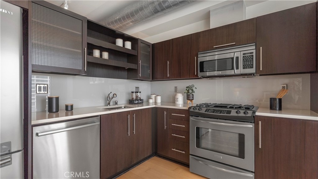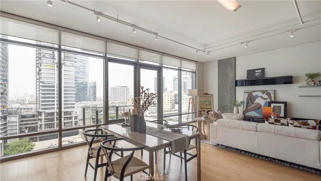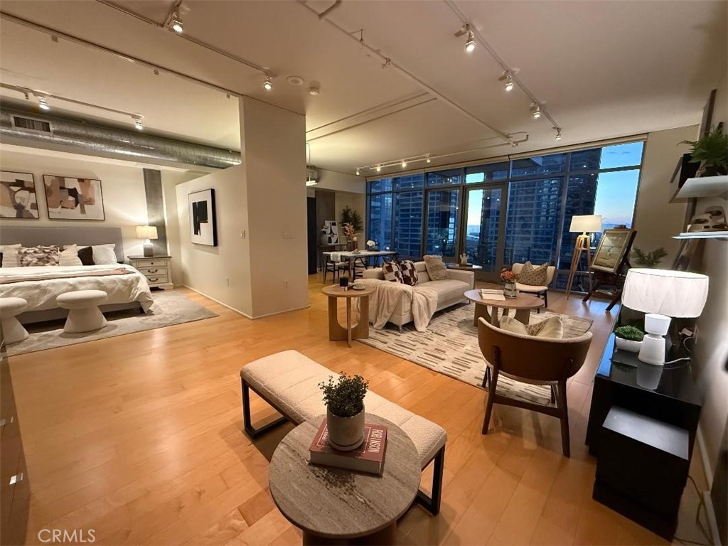 This spacious 1-bed/1-bath loft-style condo features a balcony with operable door and sweeping west-facing views of LA Live, Crypto.com Arena, and vibrant sunsets framed by floor-to-ceiling glass. Meticulously maintained by its original owner, the home blends modern upgrades with an open layout that maximizes light and space. Highlights include a custom closet system, sleek glass-enclosed bath, stainless steel appliances with Bosch quiet-mode dishwasher, track lighting for art or ambiance, and a full-height cabinet that provides ample storage while integrating seamlessly with the living space. The defined bedroom, enclosed by a sliding Hunter Douglas fabric panel, offers privacy while maintaining the loft’s airy feel. At Luma, one of South Park’s premier LEED-certified luxury towers, residents enjoy 24-hour security and concierge, a resort-style pool and spa, fitness center, and outdoor BBQ lounges. Renowned for its modern design and prime location just steps from LA Live, Luma offers the perfect combination of style, convenience, and community in the heart of Downtown Los Angeles, surrounded by acclaimed restaurants, nightlife, entertainment, and professional sports venues. A Must see.