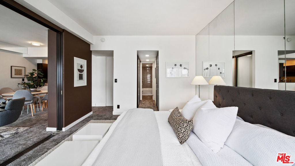 A measure of style and sophistication awaits your new lifestyle at the full-service high rise Westview Towers. Move-in or make this 12th floor condo your own with the Sunset Strip and Hollywood Hills views as the backdrop. Floor to ceiling panels of sliding glass doors hide within the walls to create seamless transitions of loft-like flow for flexible space, additional light, or close to create intimacy when the moment arrives. Wall mirrors throughout help create a spacious dining and living room area including half bathroom for ease when entertaining. The large bedroom suite includes ample hallway built out closets and modern updated bathroom with soaking tub/shower combo, rimless glass with rectangular tile. Community laundry directly next door for convenience or add to the unit. Amenities include roundabout drive with valet guest parking, controlled access, door person, security, on-site management, pool, spa, sundeck and sauna, fitness center, dog park, updated hallways with views and basic cable included.
