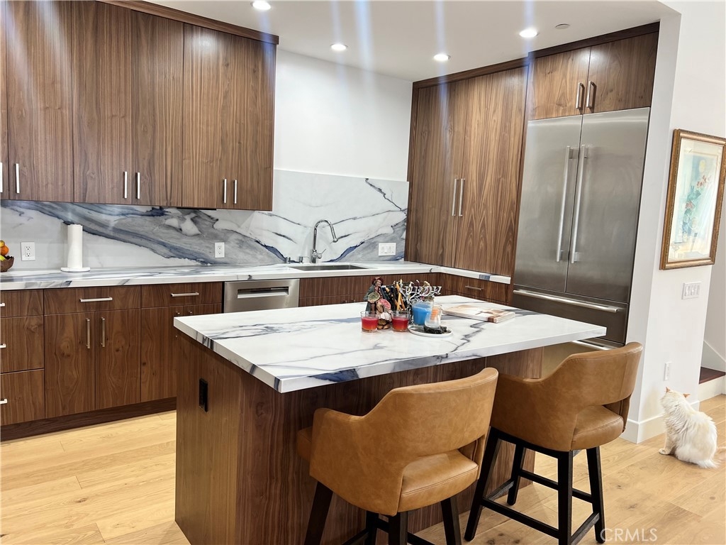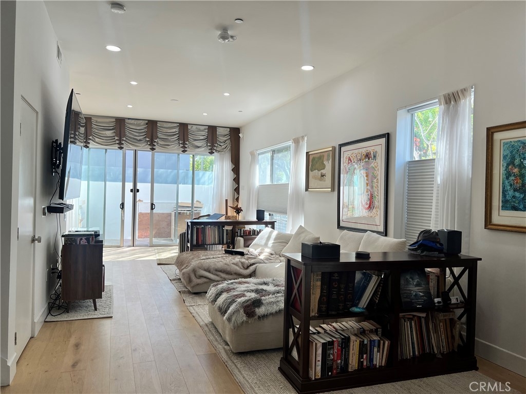 Discover the epitome of West Hollywood living in this bright, spacious, open-concept 3-bedroom, 2.5-bathroom two-level condo, bathed in natural light and designed for effortless elegance and convenience. The condo offers a vibrant lifestyle just steps from Barry’s Bootcamp, Speir Pilates, Earth Bar, trendy restaurants, nightlife hotspots, and premier shopping along Santa Monica Boulevard. Step inside to a spacious, inviting living area featuring newly remodeled floors, soaring high ceilings, recessed lighting throughout, custom window treatments, and a generous patio perfect for indoor-outdoor entertaining. The modern kitchen boasts walnut cabinetry, luxurious marble countertops and backsplash, high-end stainless steel appliances, and an island with bar seating—ideal for casual meals or hosting. Additional highlights include in-unit laundry with a ventless dryer, a Nest thermostat for smart climate control, two tandem parking spaces with an electric car charger, secure gated entry.