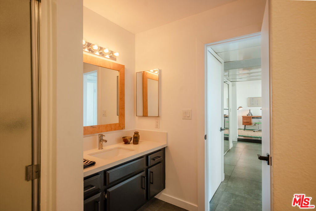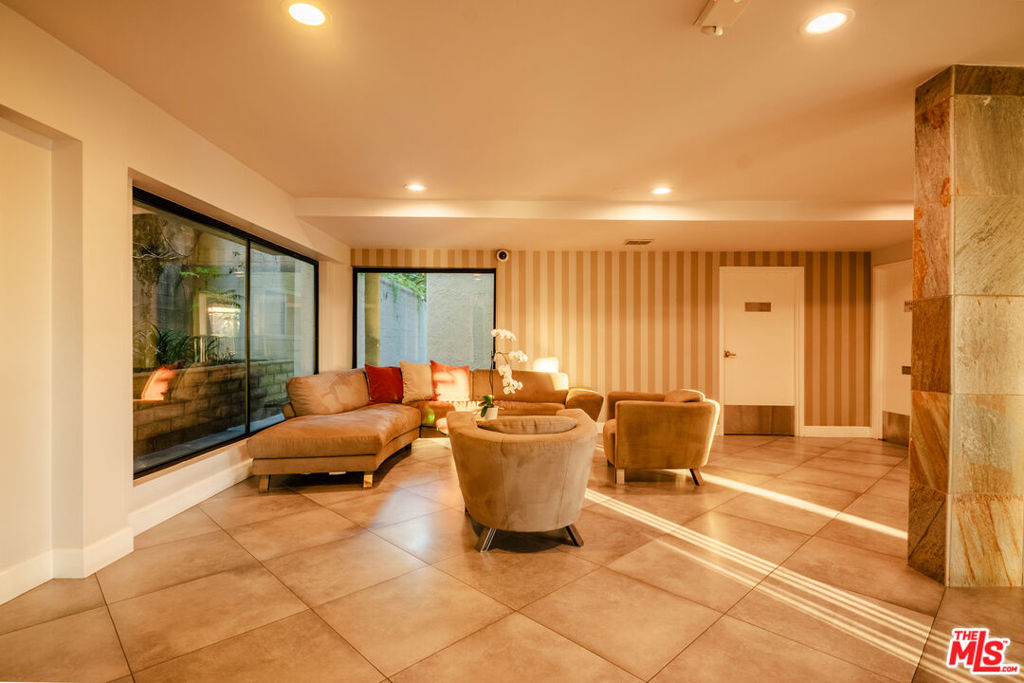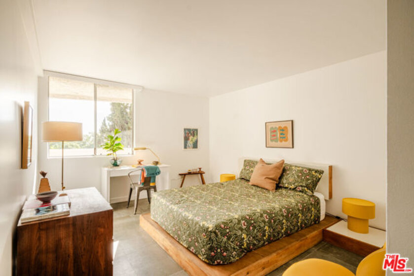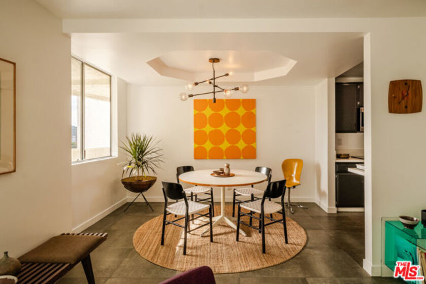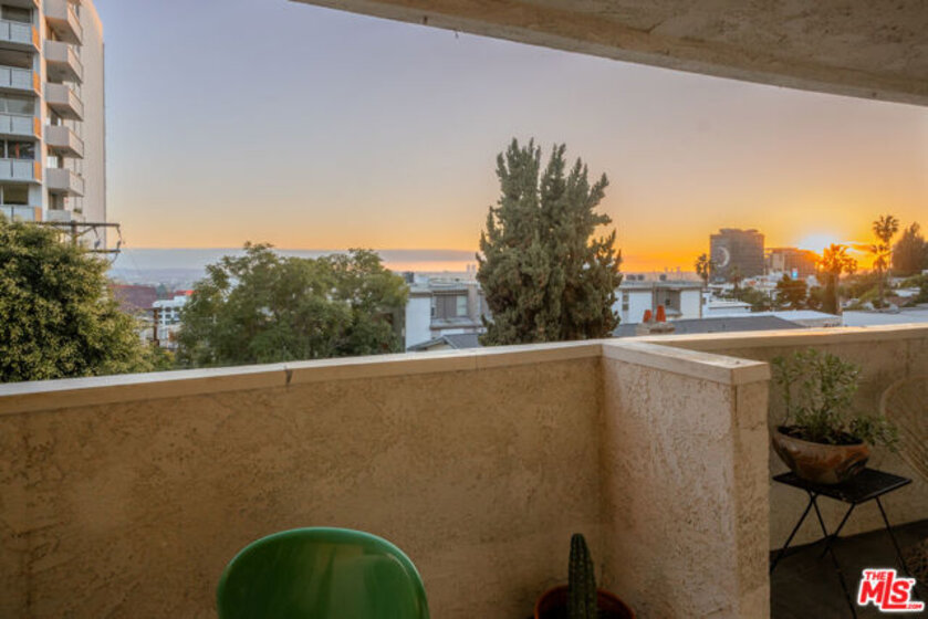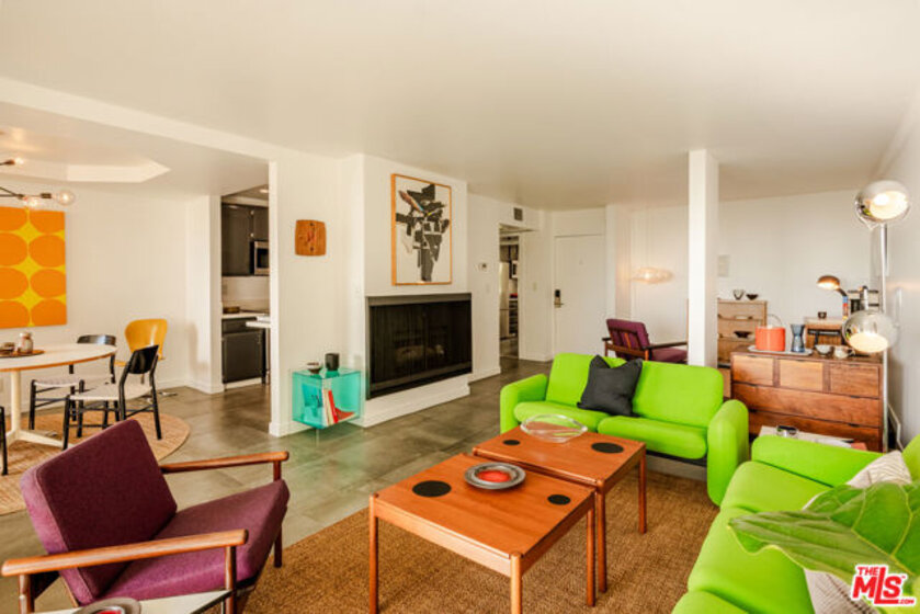 John Gary Wallis, AIA, Architect, Horn Plaza, 1974 - Here, at the end of a quiet cul-de-sac in the foothills of the Santa Monica Mountains, with panoramic views of the city, this charming condominium excels on a number of different levels. The tight-knit community of WeHo Heights offers a quiet respite from urban life, with secluded streets, hidden stairways, and access to nature. Yet the fabled Sunset Strip is just down the street, with its vibrant music scene, historic nightlife, celebrity haunts, luxury hotels, and innumerable restaurants, coffee shops, and boutiques. And Horn Plaza's distinctive mid-century modern architecture provides a backdrop for an elevated lifestyle. Floor-to-ceiling glass doors and operable windows funnel cool breezes throughout the interior, and large-format porcelain floor tiles extend outside to the private balcony, blurring the boundary between indoors and out, plus ample room for a couch, chairs, and patio furniture. Cinematic views enhance the experience, with focused vistas from Palos Verdes to Catalina, with container ships on the horizon. Inside, the open floor plan is differentiated by a raised fireplace and a den area elevated to capitalize on the views. All finishes have been tastefully redone, with quartz countertops, distinctive cabinetry, stainless steel appliances, European fixtures, a stacked washer/dryer inside the unit, and a series of mirrored wall panels that reflect the ocean views. The Plaza's resort-like amenities make this building well equipped for the fitness and relaxation of the residents. The heated pool and spa are surrounded by a spacious sundeck, with deck chairs for rest and repose, and a dry sauna for cleansing and detoxification. The club room provides ample space for lounging, with comfortable furniture, television, billiards, ping pong, and a wet bar for entertaining. A dog run with natural turf is a favorite among the four-legged friends, and a large rooftop deck features panoramic views from downtown to the ocean. Horn Plaza has it all.