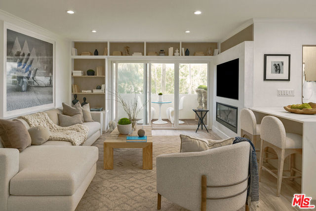 Perched on the top front corner of a classic mid-century building, this rarely available stunning 2Bed/2Bath condo captures the essence of refined West Hollywood living! Bathed in natural light and enjoying exceptional privacy with no adjacent neighbors on 2 sides, the home overlooks graceful palm and tulip trees and opens to a serene balcony retreat- an ideal setting for morning coffee or evening gatherings. *** Completely reimagined with a thoughtful and welcoming sense of design, the fully remodeled curated interior feature French white oak flooring throughout and a seamless open layout. The chef's kitchen is a true showpiece, with custom underlit white oak cabinetry, warm Caesarstone countertops, and top-of-the-line appliances. A waterfall peninsula offers additional seating and a large passthrough balcony window ensures a brightly lit kitchen and frames views of the lush balcony. Seamlessly connecting to the outdoor patio, the living room features a custom built-in bookcase that transitions into a stunning Venetian plastered wall unit perfectly framing a 65" flat-screen TV and contemporary fireplace (with adjustable ambient settings). The adjacent stylish dry bar, with custom underlet cabinetry, enhances the space, while the dining area's cozy corner nook offers versatility as an intimate lounge or home office. *** The primary suite is a truly light and bright retreat, featuring custom Japanese-inspired screen closet system and beautifully designed built-ins that will be the envy of all. The ensuite bath evokes a spa-like ambiance with a floating vanity, bidet toilet, limestone-inlaid walls, and a generous walk-in shower, all adorned with designer trim-work and lighting. The secondary bedroom is equally spacious and includes a fully customized closet, while the hall bath feels like a boutique hotel suite with elegant finishes and a step-in shower. ***Beyond the residence itself, the building embodies the effortless elegance of its mid-century heritage. Residents are greeted by a terrazzo-lined lobby while the central courtyard pool is surrounded by palms, cushioned lounges and sitting areas, offering a perfect escape reminiscent of quintessential Palm Springs. It's a place that feels as welcoming as it is stylish! *** Additional highlights include in-unit laundry, Eero wifi and smart home control system, upgraded LED lighting, custom doors and trim work throughout, HVAC, custom storage cabinetry, rare two side-by-side parking spaces with universal electric charger, and a level of detail and craftsmanship that sets this home apart from any other. *** Perfectly situated in one of West Hollywood's most sought-after and convenient locations, this quiet street, top-floor corner residence blends thoughtful design, comfort, and timeless mid-century character in one exceptional offering.