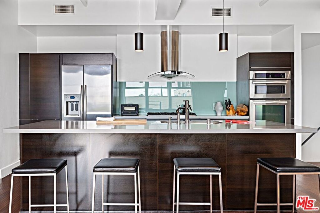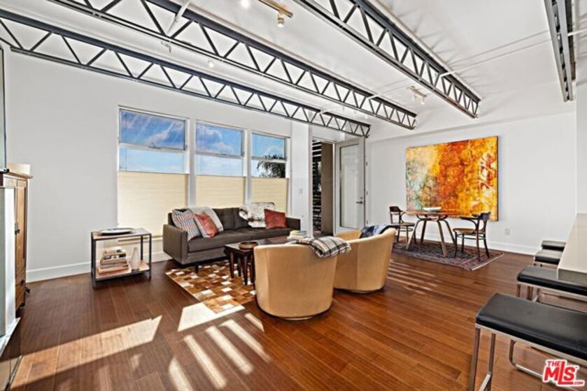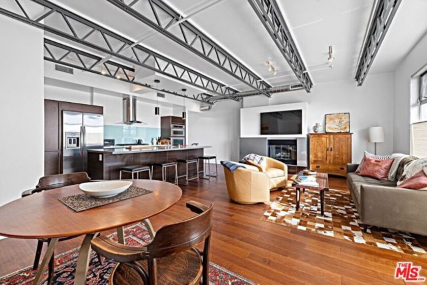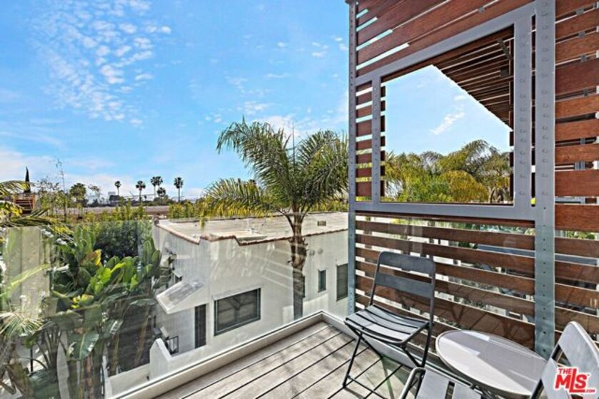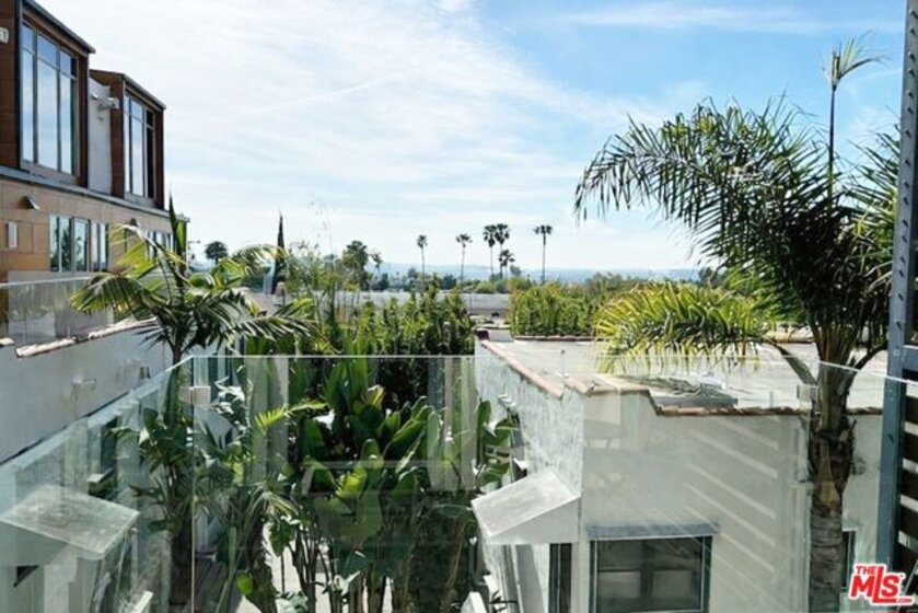 This striking, loft-style two-story architectural residence offers panoramic city views in the heart of West Hollywood, set within a sleek building complex. The one-bedroom, one-and-a-half-bath home showcases a refined blend of steel, wood, metal, and glass throughout. Bright and modern with coveted southern exposure, the approximately 1,200-square-foot floor plan features soaring ceilings and an expansive entertainer's layout. The open living, dining, and kitchen areas are anchored by a gas fireplace and extend seamlessly to a private outdoor terrace. The lower level is dedicated to a luxurious primary suite, complete with a generous walk-in closet and a spa-inspired bath featuring dual sinks, Caesarstone countertops, a separate shower, and a soaking tub. Designer finishes elevate every space. Additional highlights include in-unit washer and dryer, central heating and air conditioning, two-car parking and separate storage closet in gated security garage. Located on a quiet tree-lined street, moments away from trendy shops, restaurants and all that West Hollywood has to offer.