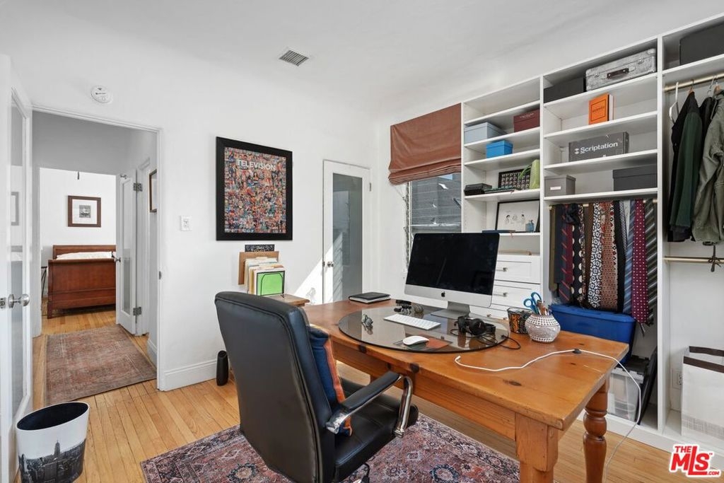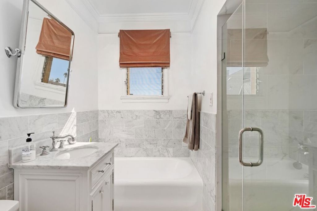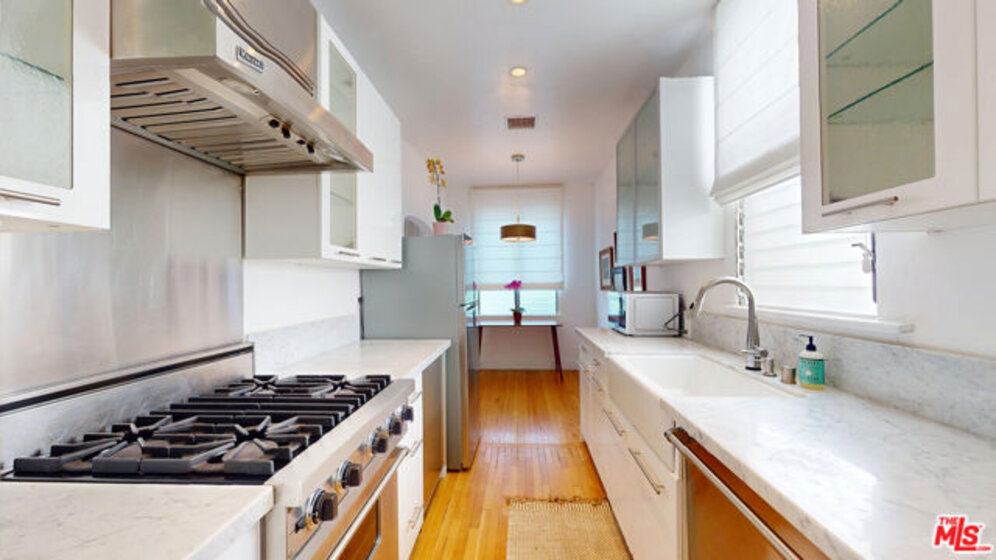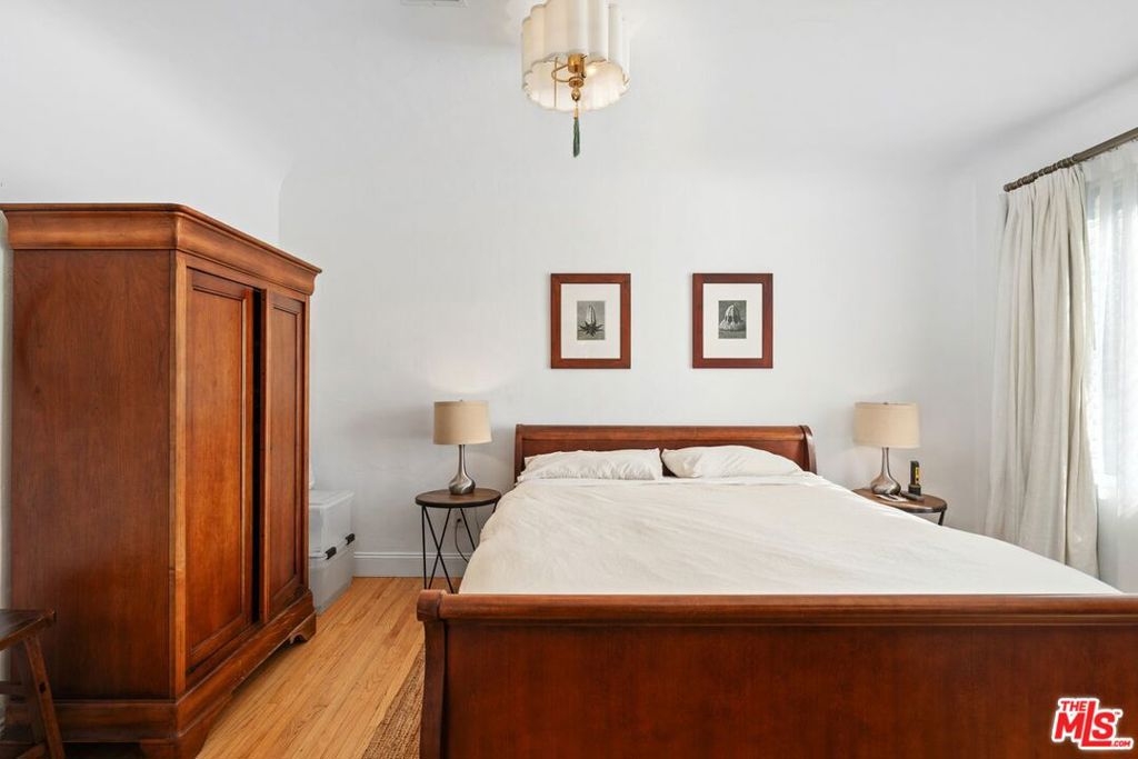 This sunlit top-floor end-unit residence captures the essence of classic LA living in a charming Spanish Hacienda setting. Set within a well-maintained, secure 1929 architectural gem south of Sunset, the building features security cameras and a lush open courtyard that creates a peaceful, resort-like setting.Reimagined in 2020, the residence enjoys only one shared wall, abundant natural light, and serene treetop views. A spacious foyer with a large entry closet welcomes you, while low HOA dues include all utilities. The home blends historic charm with modern refinement, highlighted by central A/C, 2nd bdrm enhanced with a custom-built closet, 9-foot coved ceilings, warm oak floors, & smooth plaster walls. The kitchen has been recently upgraded with a luxury standalone refrigerator partially replacing the original under-counter European built-in alongside Viking appliances, sleek countertops, and a farmhouse sink. A portion of the original built-in fridge remains functioning as a secondary fridge and a charming bonus..The bathroom features Carrera marble complemented by high-end fixtures.. Additional highlights include side-by-side subt. parking with private storage & a central location with easy access to BH, the Westside, and the Valley. Notably, a slightly larger unit (#209, +34 sq ft) sold for $750,000 on 3/17/26 without high-end updates, underscoring the value offered here. Unbeatable location at an exceptional value.