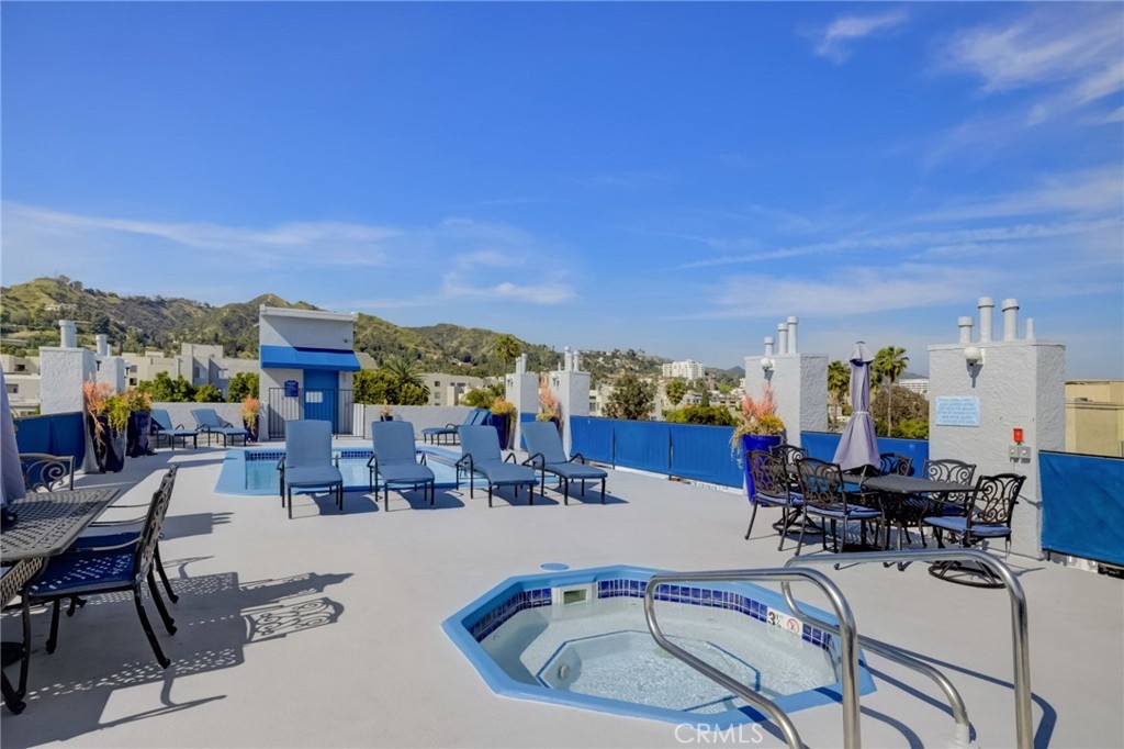 Welcome home to this stunning top floor 1 bed 1 bath unit with French doors that open to a balcony boasting breathtaking views of the iconic Hollywood Sign. Brand New HVAC system - AC and Heat installed ready for the summer!! The rooftop pool is perfect for relaxing and entertaining, with tables, chairs, umbrellas, lounge chairs, and a gas grille for outdoor cooking. Inside, you'll find a spacious walk-in closet and a large changing area in the bathroom for added convenience. Fireplace in the living room and washer in the unit. The unit is located on the top floor with no one above. Stay active in the exercise room or take a leisurely stroll to nearby Sunset and Melrose for shopping and dining options. This secure building features an indoor gated garage and locked entry to all floors for peace of mind. With easy access to highways 101 and 10, as well as close distance to the Hollywood Bowl, and historical Spaulding Square, this location is unbeatable. Additionally, this property includes a one-year policy for American Home Shield for added protection and peace of mind. Don't miss out on this opportunity to live in luxury in the heart of Hollywood.