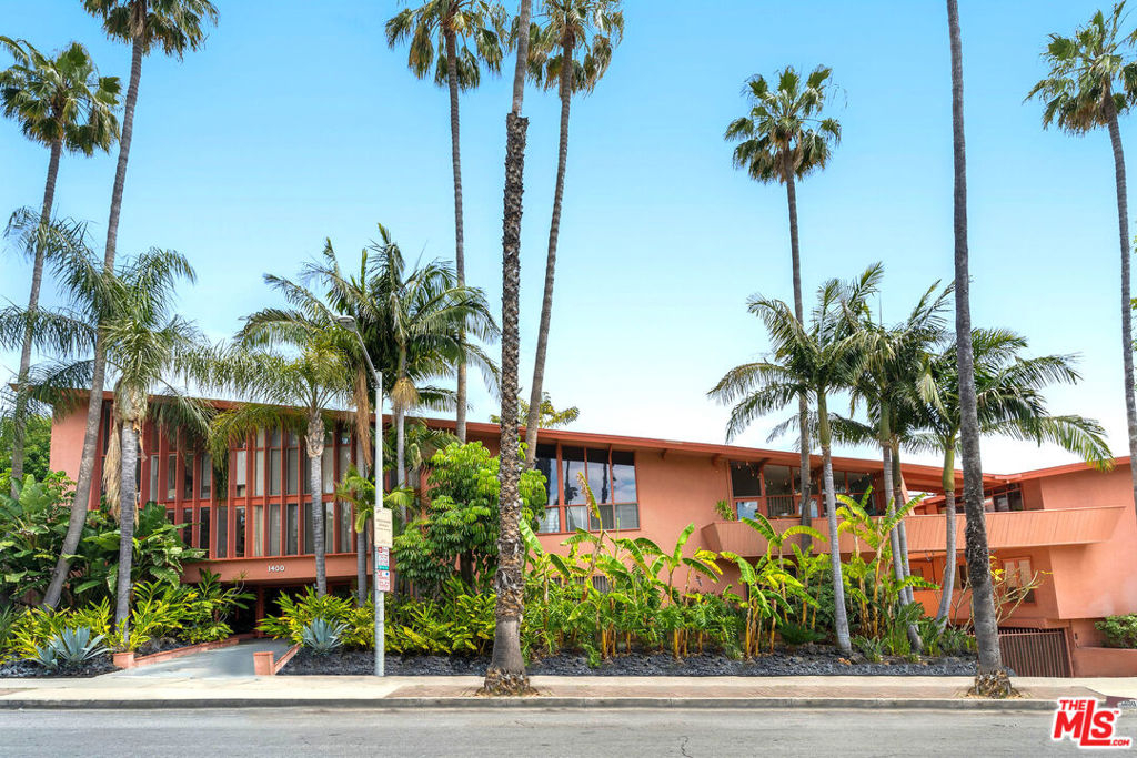 Top floor unit situated in the beloved "Hollywood Riviera," a historically designated, Mills Act approved, mid-century, post & beam masterpiece designed by famed architect Edward Fickett (FAIA). Built in 1954 and starring in numerous films, shows and commercials over the decades. Enjoy an open concept layout perfect for entertaining, and one of the many benefits of being up on the top floor: vaulted ceilings! Clerestory windows and walls of glass bathe the space in tons of natural light and overlook the courtyard pool. Views of the Hollywood Hills from the bedroom, also featuring high ceilings. Unit features central heat and air conditioning. Controlled access entry and secured subterranean gated parking garage for easy off-street parking. Enjoy the serene Palm Springs vacation vibes that accompany life at this iconic pink oasis nestled amongst the palm trees, while being just half a block from all the action on the Sunset Strip and the beloved restaurants, shops and nearby gym + markets. Welcome home!