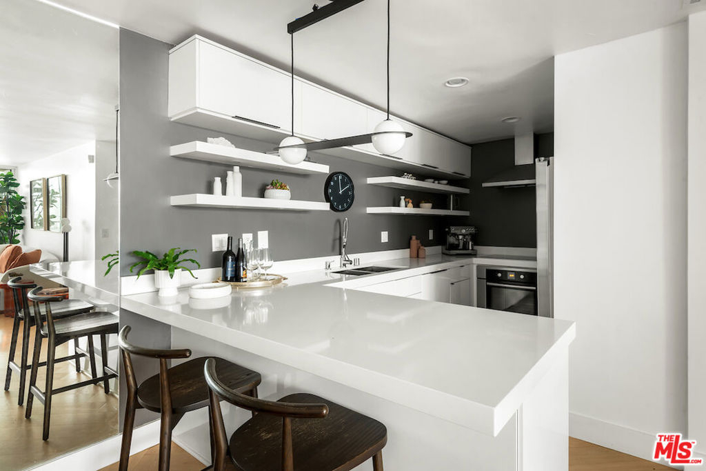 Experience Mid-Century Modern luxury steps from the Sunset Strip in Prime West Hollywood! This 2-bed, 2-bath residence blends timeless design with modern upgrades across 1,109 square feet, plus a rare large private patio, all in a stunning building designed by renowned architect Frank P. Schneider, AIA. Located on the quiet rear side of the building, this corner unit showcases clean architectural lines, a seamless open layout, and a floor-to-ceiling glass door that opens onto the largest private patio in the building, an outdoor sanctuary delivering unmatched space and tranquility. The updated kitchen features stainless steel appliances, granite countertops, and plenty of storage. Both bathrooms have been thoughtfully renovated with upgraded vanities, high-end fixtures, and state-of-the-art bidets. Throughout the home, new wide plank herringbone hardwood flooring elevates the aesthetic. Complemented by the convenience of in-unit laundry and side-by-side gated garage parking. Residents also enjoy access to a rooftop deck with panoramic city and ocean views. Enjoy this quiet and tranquil condo home on a peaceful street, just steps from all the action on the iconic Sunset Strip. Walk to Sunset Tower, Chateau Marmont, the Pendry and LA's best in dining, shopping and nightlife. Come experience this architecturally significant, extensively upgraded, and ideally located condo home for yourself.