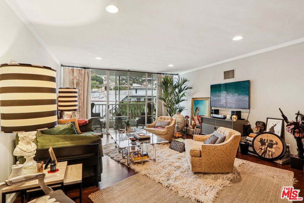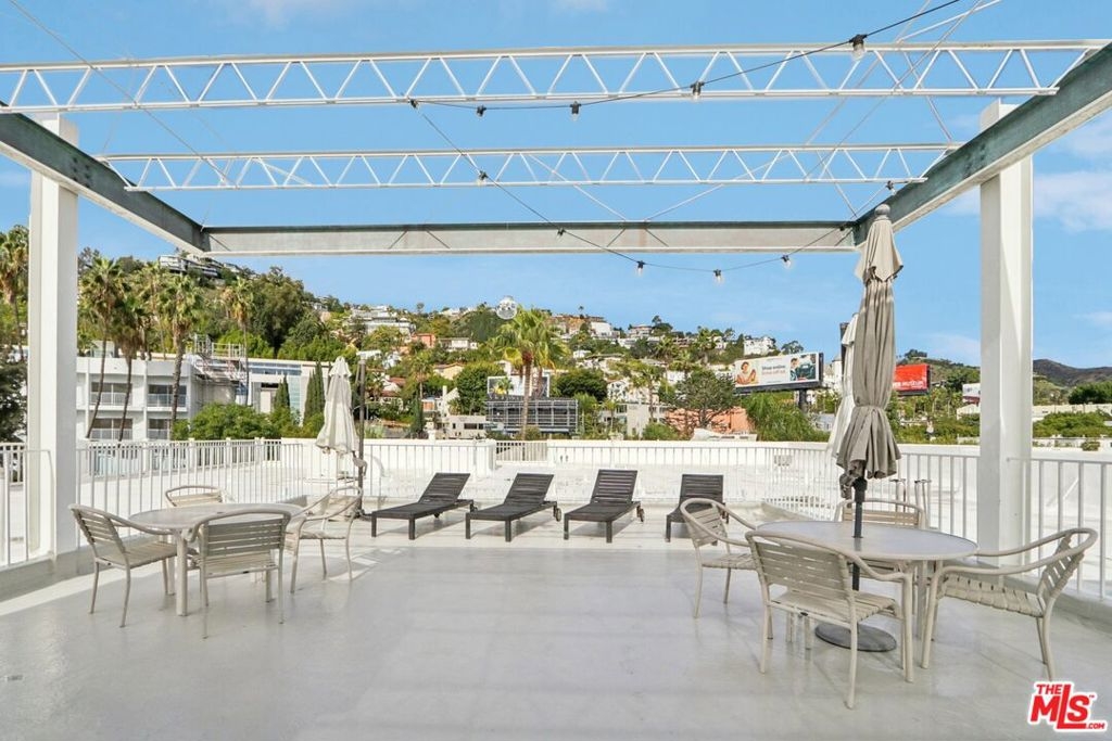This top floor, two-bedroom condo in West Hollywood's iconic Sunset Penthouse building offers unbeatable views and classic mid-century modern style by renowned architect Frank P. Schneider. Located just below Sunset Boulevard, the Northeast corner unit sits beside the elevator, creating the feel of a private lift delivering you directly into your penthouse retreat. Inside, a bright open floor plan with high ceilings and hardwood floors feature a dramatic floor-to-ceiling glass wall that opens to a large private balcony with sweeping Hollywood Hills views. The spacious living and dining areas, complete with a wet bar and chef's kitchen, are ideal for entertaining, while additional highlights include recessed lighting, central heating and air conditioning, washer/dryer hookups, two side-by-side covered parking spaces, extra storage, and access to a rooftop terrace with panoramic 360-degree views perfect for sunset gatherings on the sundeck. Priced under $1 million, this home presents an exceptional opportunity for first-time buyers to enter the market in style, with prime walkability to the Sunset Strip, La Cienega, and Santa Monica Boulevard, Saddle Ranch, Sunset Tower Hotel, THE PUBLIC (formerly known as The Standard), The Comedy Store, just blocks from top restaurants and nightlife. William S. Hart Park and Off-Leash Dog Park offers a peaceful, tree-lined retreat on the former estate of silent-film star William S. Hart, providing a charming neighborhood oasis for residents and their pets while remaining close to the Sunset Tower Hotel and the heart of West Hollywood. Walk score 97!!!!