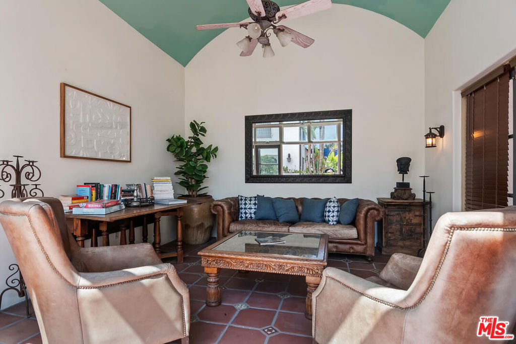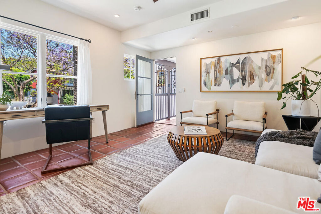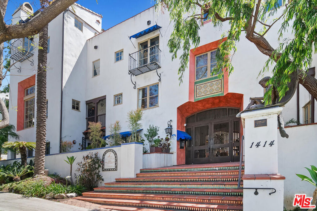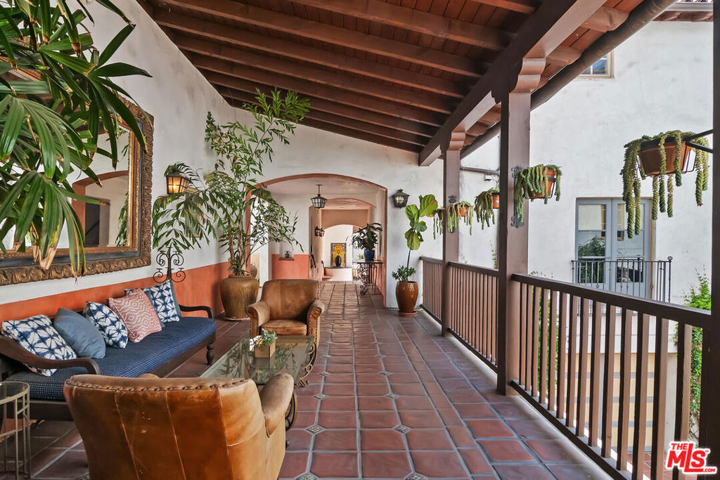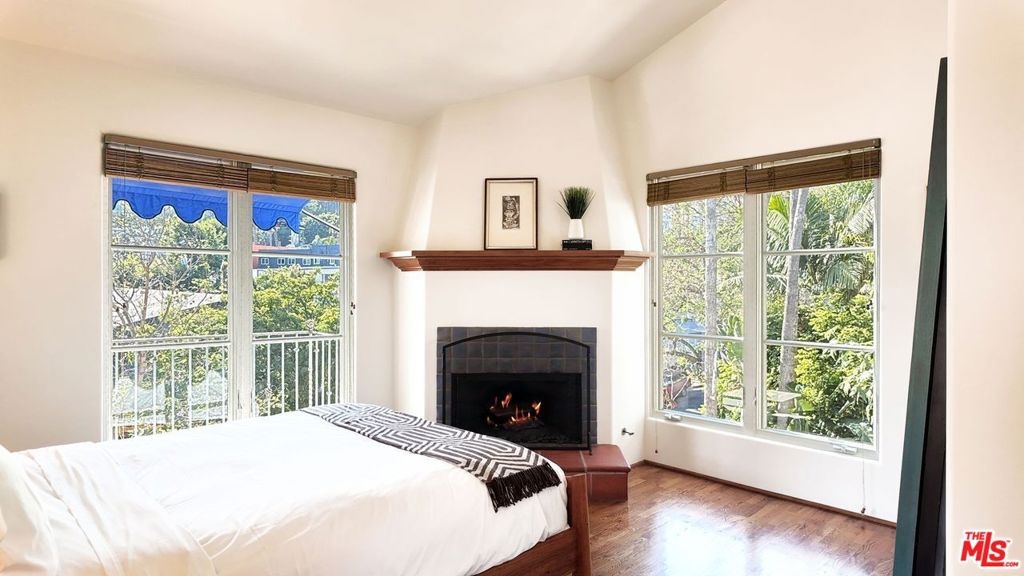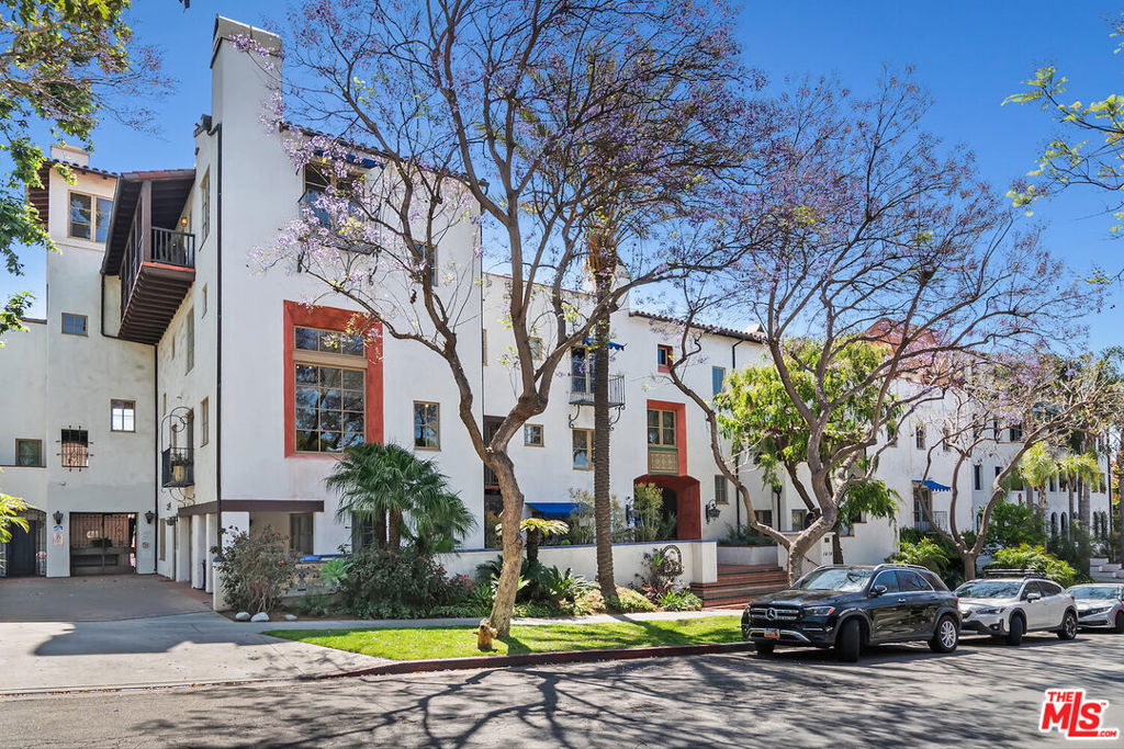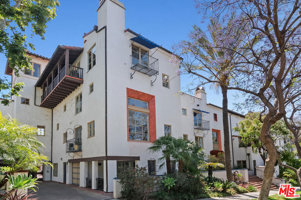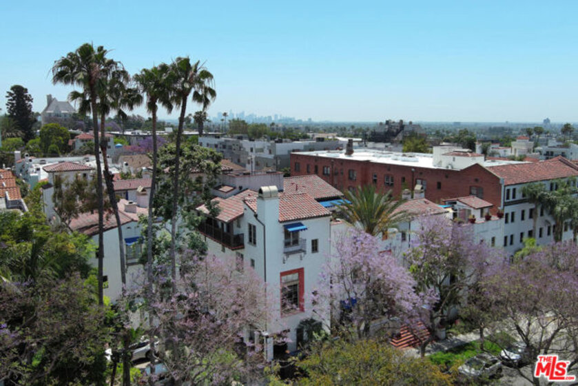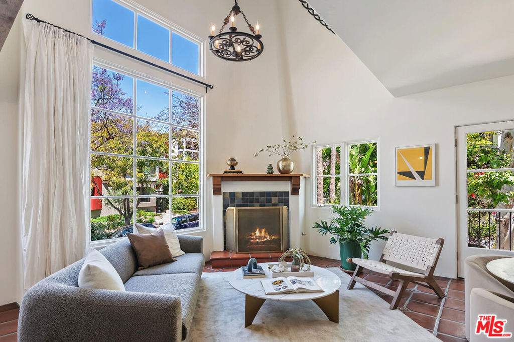 Rare opportunity in West Hollywood's Historic Harper Avenue District! Dramatic townhome in the highly coveted Spanish Revival 7 Fountains Community, designed by renowned architect Stefanos Polyzoides. One of only 20 villa townhomes, this private front corner unit boasts breathtaking wrap around views to the north, south and west. Wake up to living in a beautiful botanical garden-like feel and choose to end your day enjoying a relaxing sunset from your romantic balcony or high in the sky roof deck patio. Inviting living room with soaring ceiling, grand two-story fireplace and balcony, with views of the Hollywood Hills and city lights. The open living space incorporates the kitchen, dining area, and powder room, providing a perfect flow for entertaining. Keep your commute to work short and trouble free. The separate multi purpose room connected by a private breezeway is the perfect space, replete with views of West Hollywood and into Century City. Let your imagination run wild and use it as a home office, media room, guest bedroom, yoga studio or... A beautiful hardwood stairway takes you to the Primary Suite, situated on its own floor with wonderful French doors to Romeo & Juliet balcony, large walk-in closet, plus add'l closet, dual sinks, large tub & separate shower. Additional bedroom suite on 3rd floor has fireplace, full bath and views. The 3rd bedroom suite has a romantic Montecito inspired balcony overlooking the Hollywood Hills & Century City. There is a full bath and additional closets. You will love the outdoor patio deck with sweeping city views including the iconic Mirador sign, beautiful foliage, and all the festivities of West Hollywood and Santa Monica Blvd. The grounds of the Award Winning 7 Fountains community feature lush landscaping, beautiful fountains, koi pond, seating area with fireplace and peaceful reading room. Each of the 7 fountains features a unique mosaic design, using hand painted tile. There are 3 separate parking spaces in the garage, huge dedicated storage room, plus plenty of guest parking. Great location, convenient to award winning shops & entertainment, nightlife and the famous Sunset Strip. Come spoil yourself! Don't miss Video and 3D Tours.