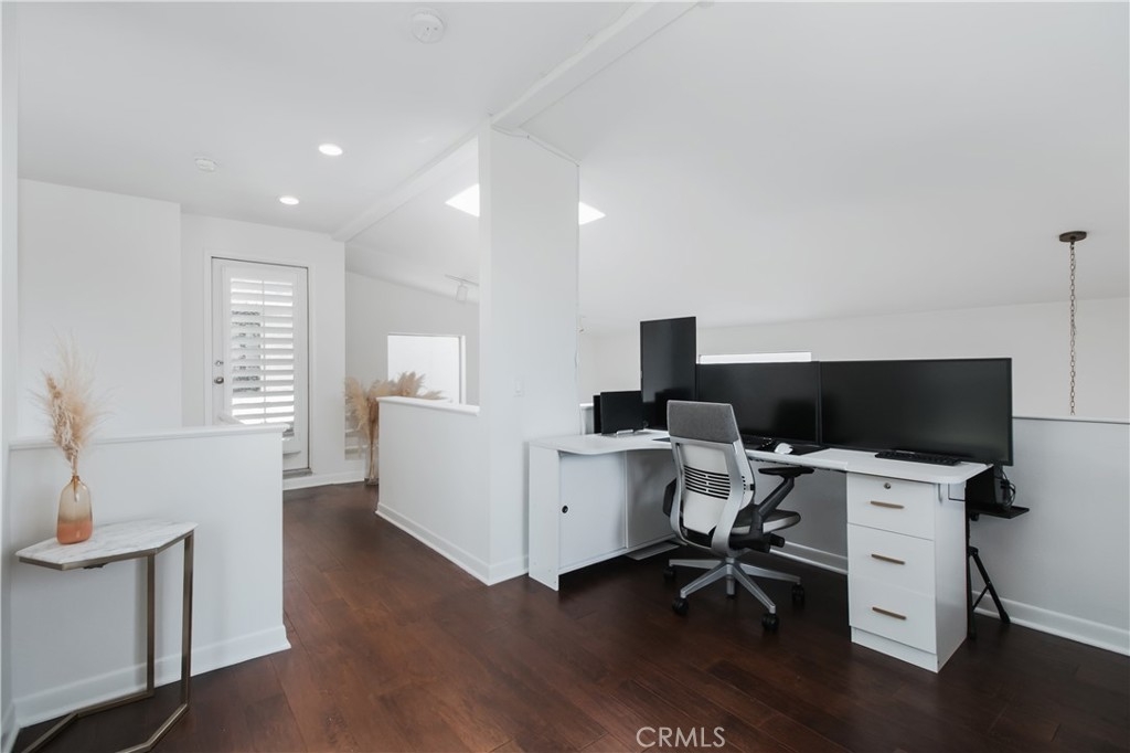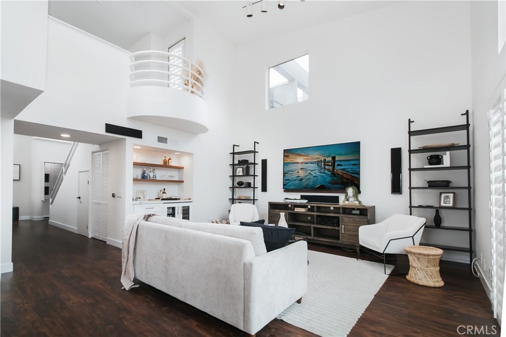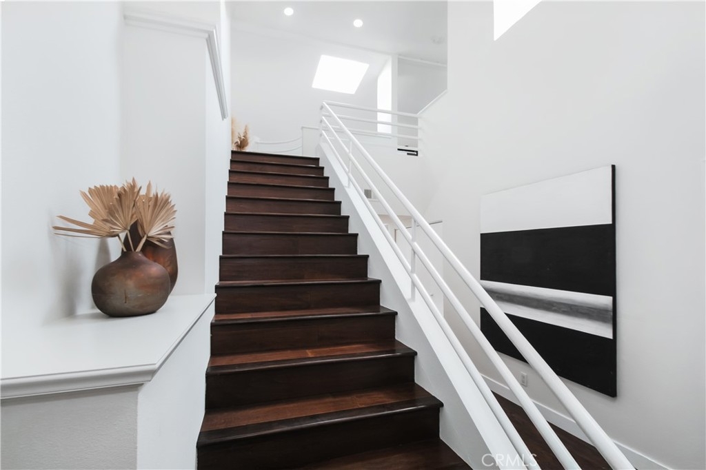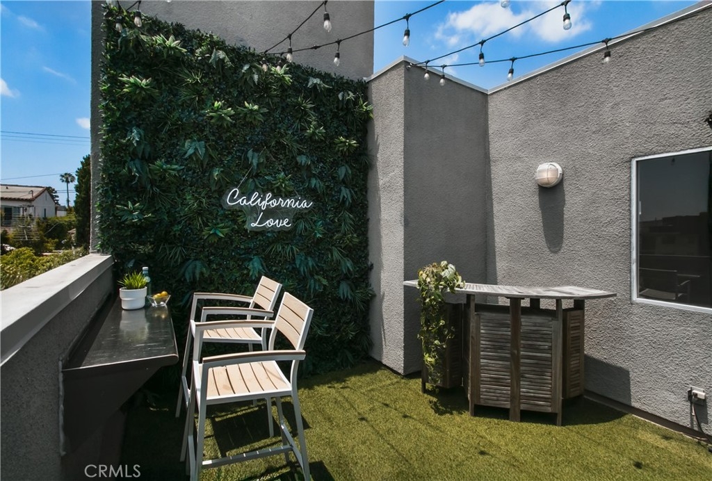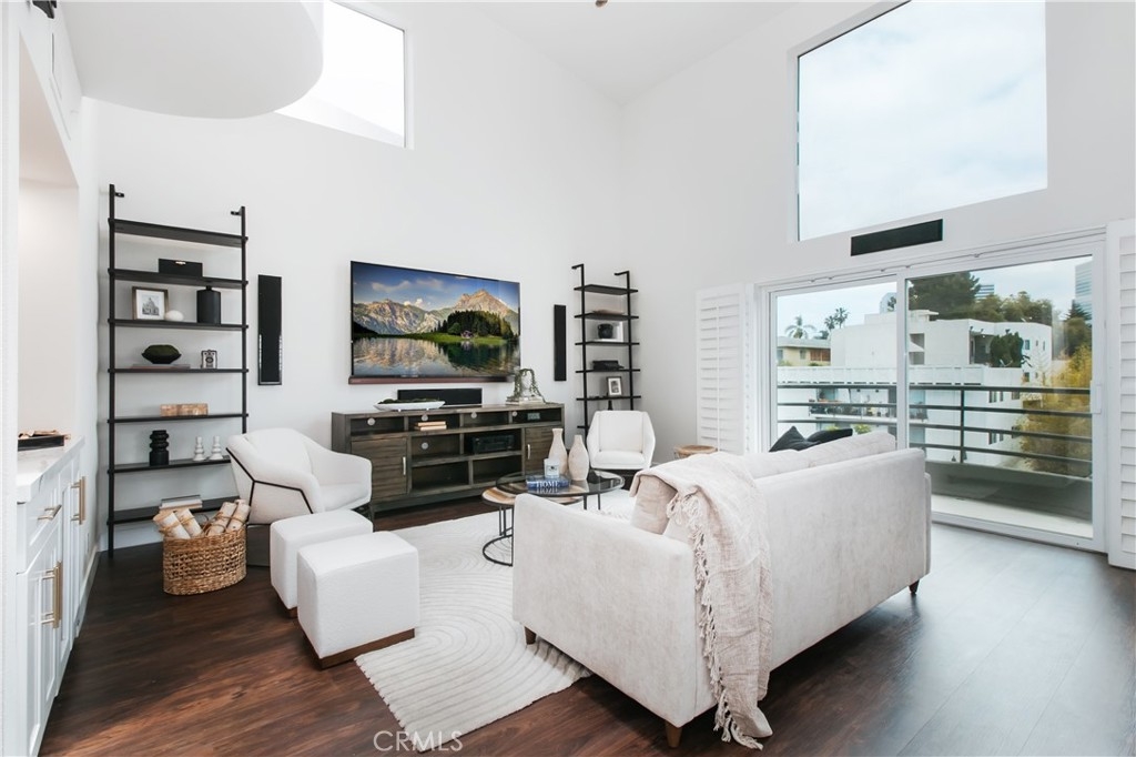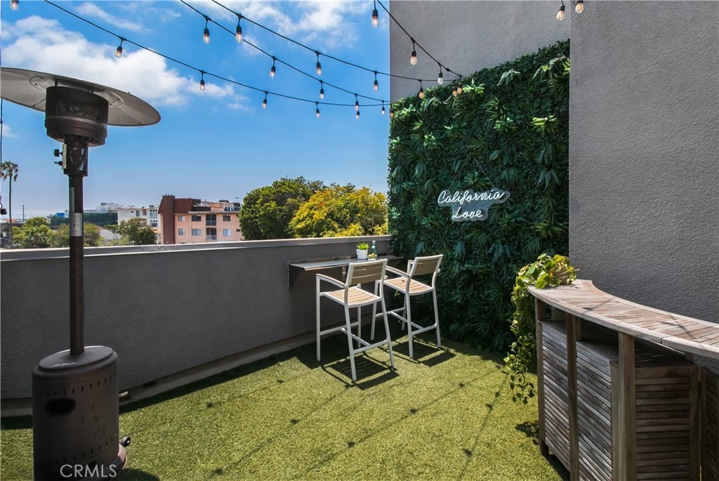 This light-filled two-bedroom, two-bath + loft condo is a rare find - your personal residence offering city-living with ample spaces for hosting and entertaining. This prime location, stylish top floor, corner-unit brings privacy and personality in equal measure. Step into your sunlit sanctuary featuring soaring two-story ceilings, skylights, and windows on three sides. The wide modern staircase sets the tone, leading to a versatile loft and two separate, private rooftop decks—perfect for city views and rooftop hangs! The main floor living areas flow together with the added ambiance of a built-in bar with a wine fridge. The living room includes track lighting and is home theater-ready with wiring for a built-in sound system. The updated kitchen is perfect for entertaining with quartz countertops, subway tile backsplash, GE Café appliances, including a 6-burner range with double oven, large workstation sink, white shaker cabinetry, and a breakfast bar. On the main floor, the primary suite checks all the boxes with a walk-in closet plus a full wall closet, built-ins, and a spa-inspired updated bathroom with dual sinks, bronze fixtures, and a show-stopping shower with custom plant ledge and a clerestory window. The second bedroom offers an efficient layout with an ample closet and a Murphy bed. The updated second bathroom brings tasteful classic black and white vibes with brass fixtures. The upstairs loft is the perfect flex space. Make it your studio, WFH zone, or personal lounge. Two private rooftop decks are your urban oasis as additional outdoor space for relaxing, hosting, and al fresco dining. Enjoy the artificial living plant wall and sunset views on the southeast patio or kick back and watch the game on the mounted TV on the east patio, both with hanging Edison lights. Features an in-unit laundry closet with side-by-side washer and dryer, under-stair storage, and an additional personal, large storage unit on the fourth floor. The secure, gated garage provides two side-by-side parking spots with an NACS EV charger. This desired location keeps you connected with the adjacent Century City Mall for endless shopping and dining, nearby UCLA and Westwood Village, and the soon-to-open Metro Line. Low HOA fees include earthquake insurance.