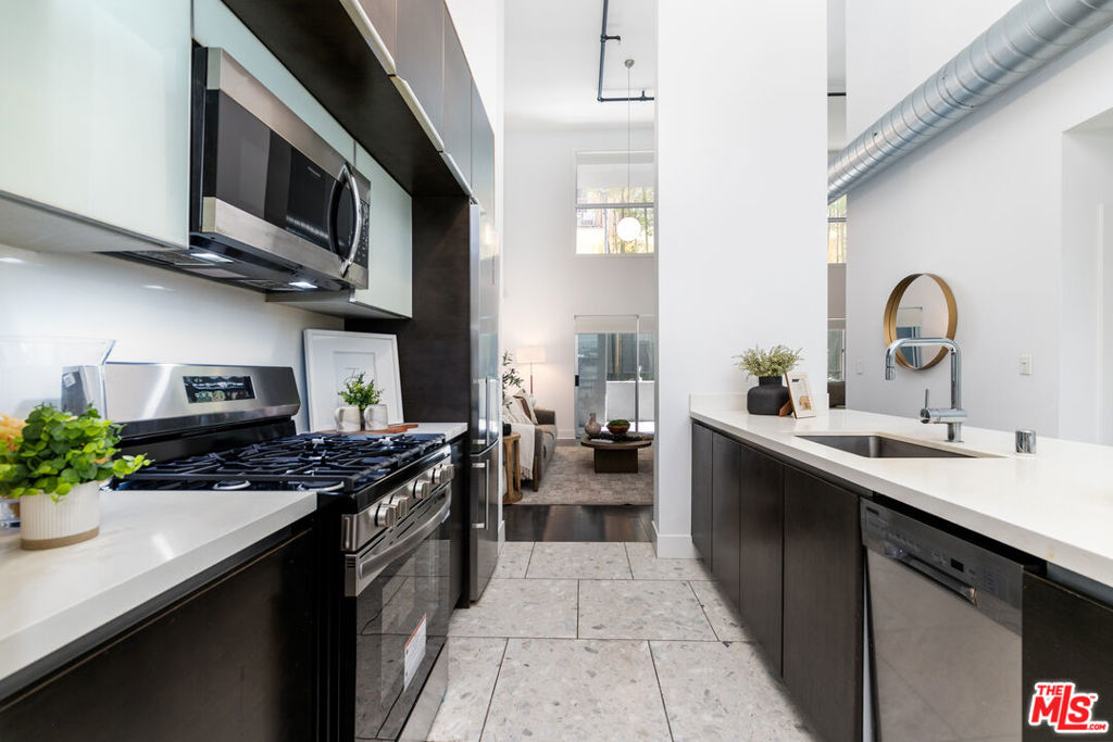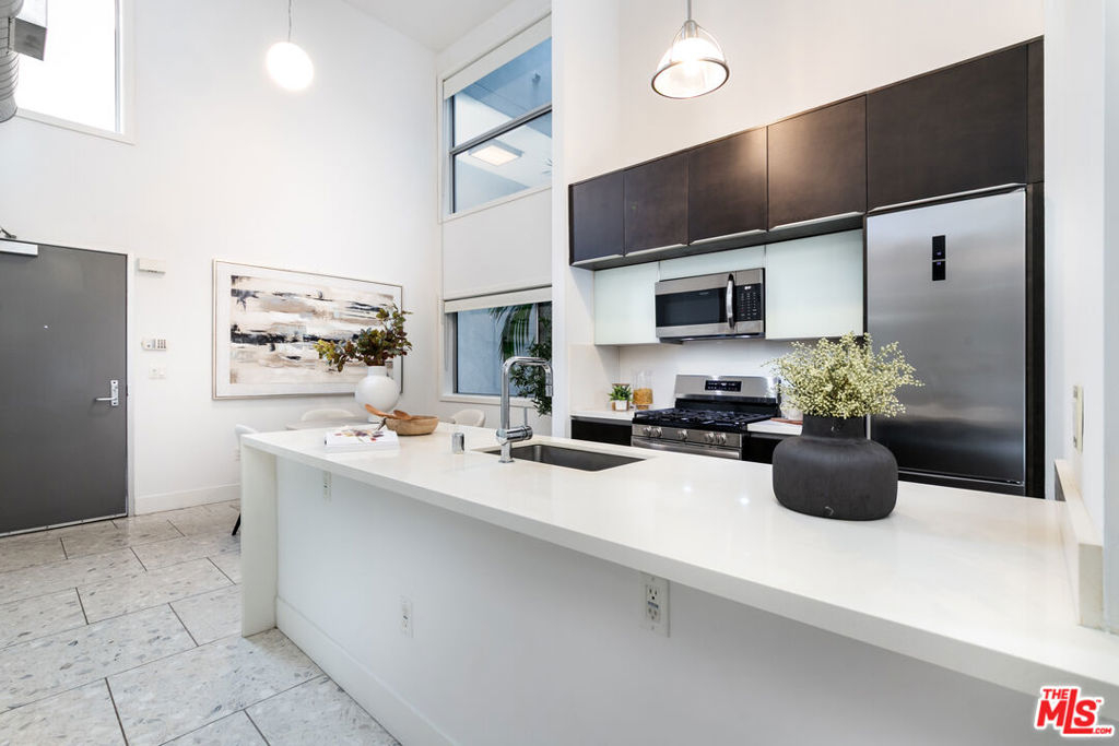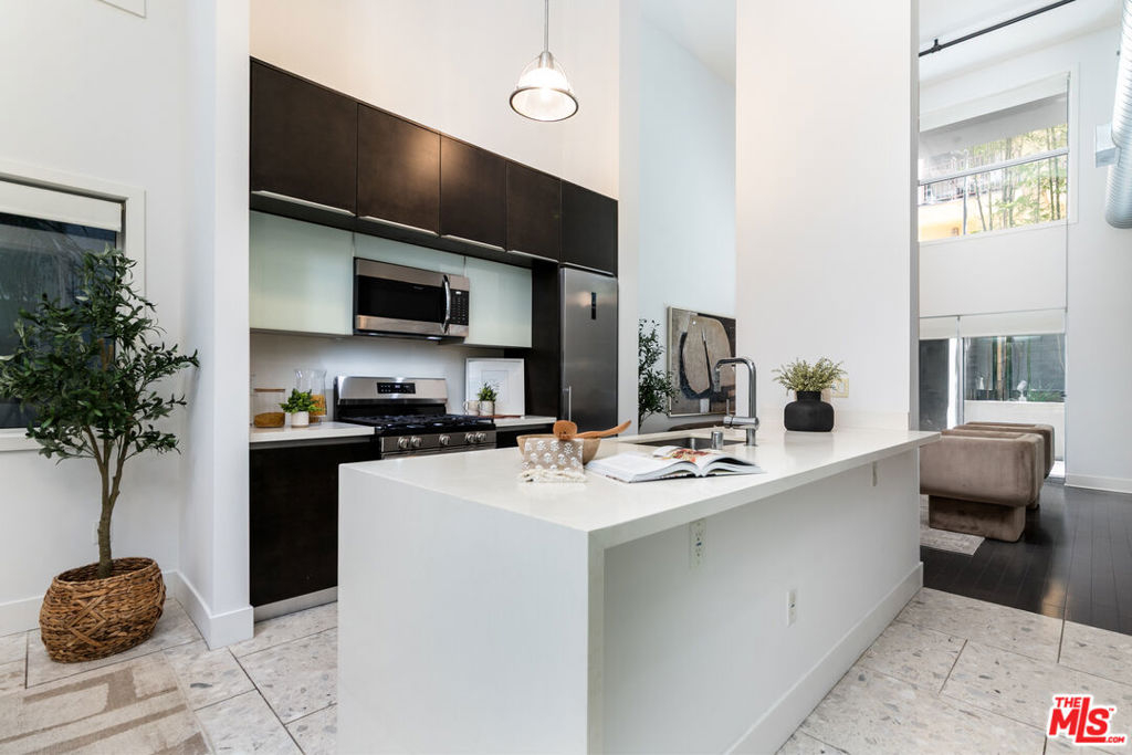 Experience the height of coastal urban living in this striking architectural loft-style townhome, perfectly situated in a prime West LA location just west of the 405. This sophisticated 2-bedroom, 2-bathroom unit offers an airy, open layout defined by soaring ceilings, recessed lighting, and a seamless flow to a large, charming private patio ideal for al fresco dining and entertaining. The gourmet kitchen is a chef's dream, featuring Caesarstone countertops and high-end stainless steel Energy Star appliances, while the convenience of an in-unit washer and dryer completes the interior. Residents enjoy luxury building amenities including a resort-style furnished courtyard with a fireplace and two dedicated, non-tandem parking spaces in a secure subterranean garage equipped with a storage room and bike racks. Offering incredible value, the HOA fee covers internet, water, gas, and earthquake insurance, making this a rare, turn-key opportunity to own in one of LA's most desirable neighborhoods just steps from the vibrant shops and restaurants.