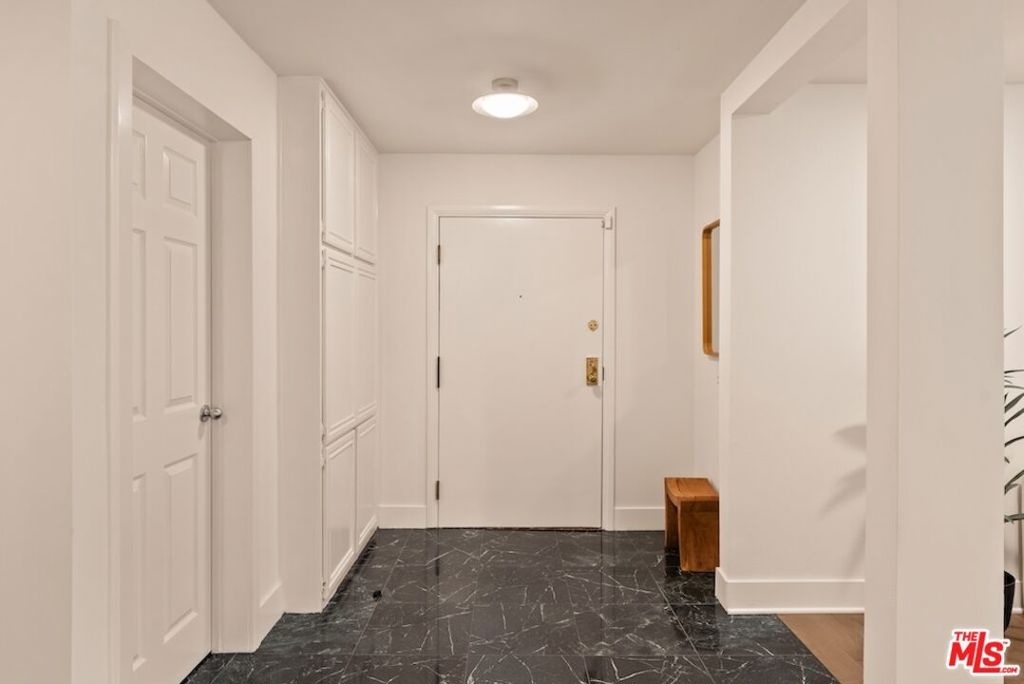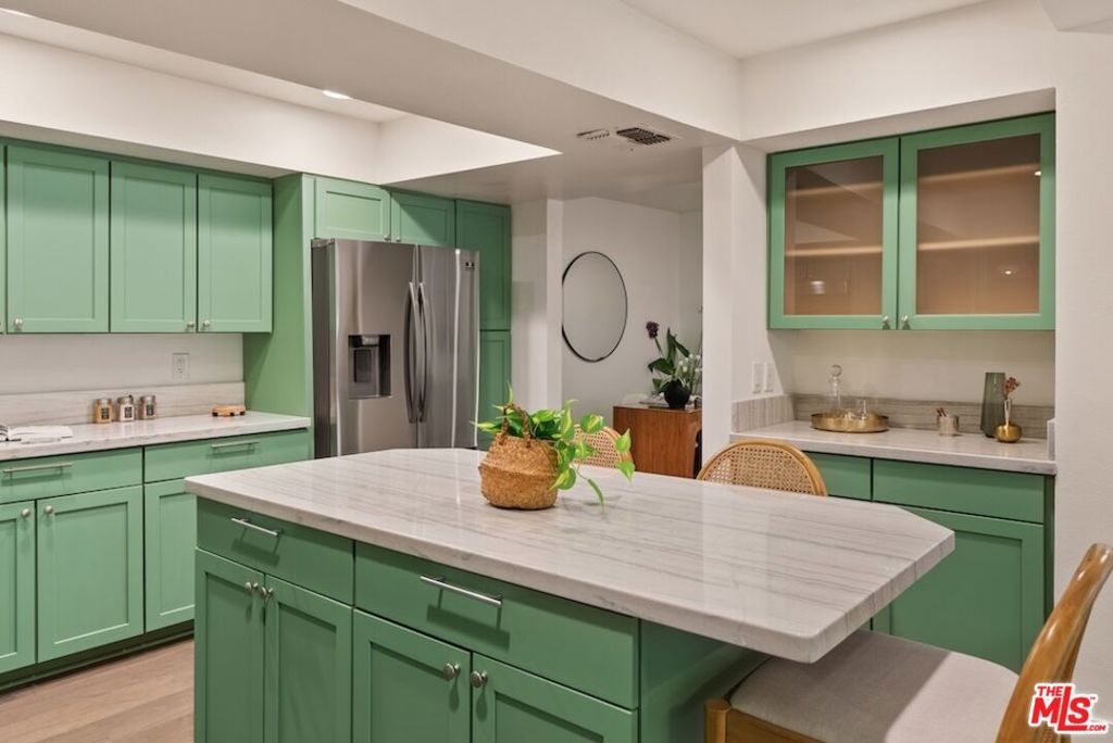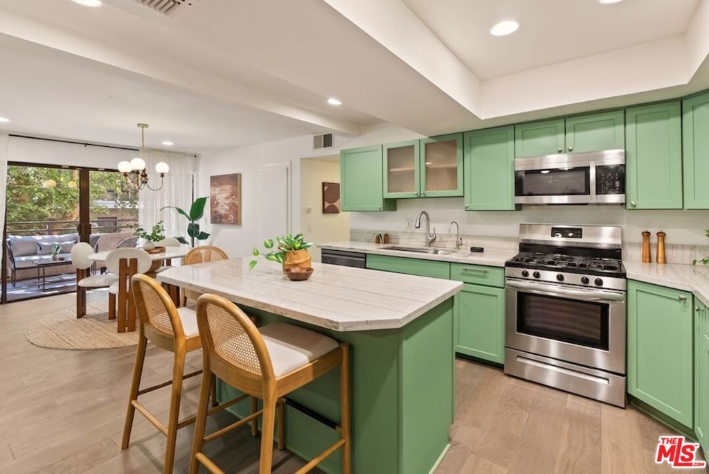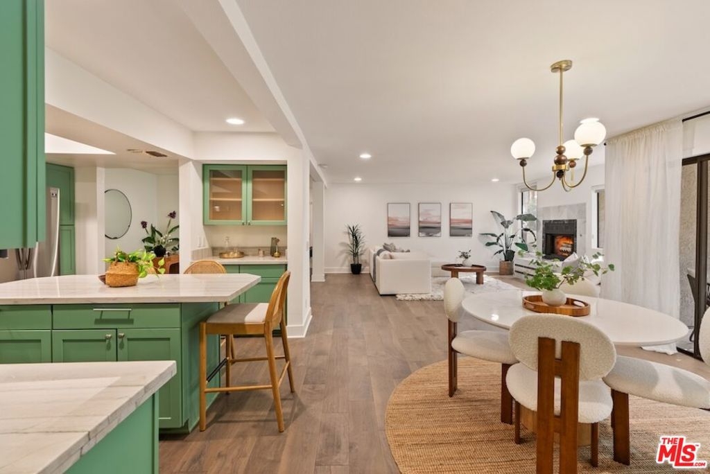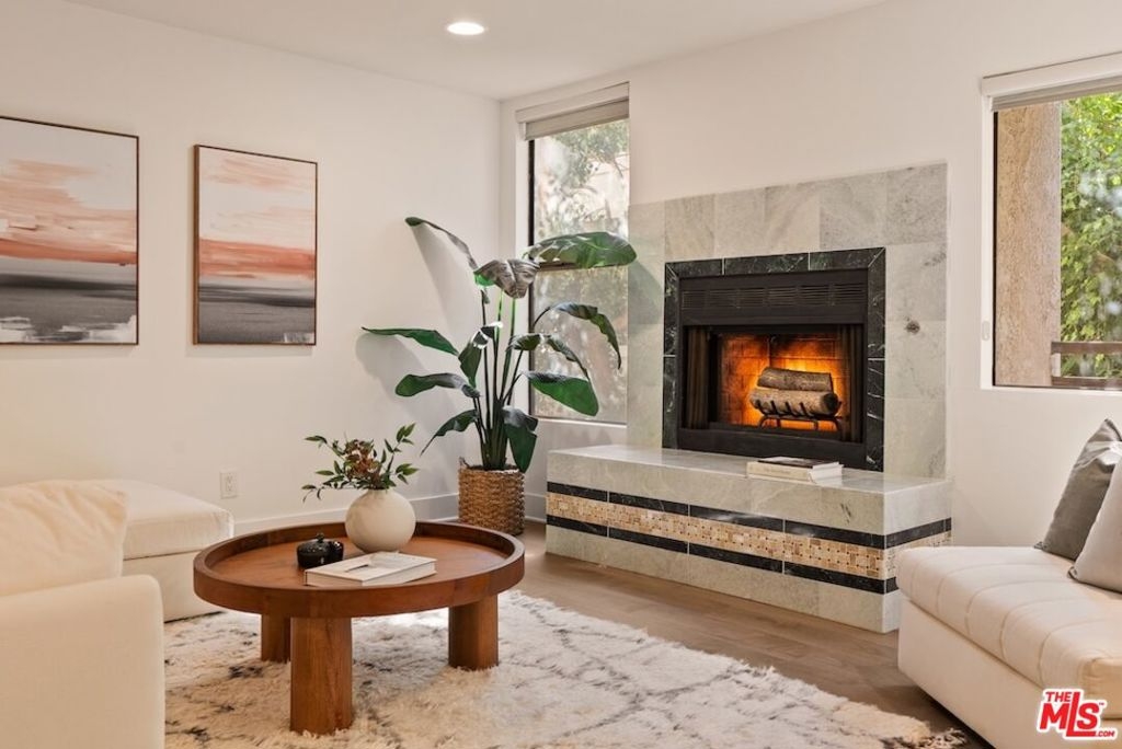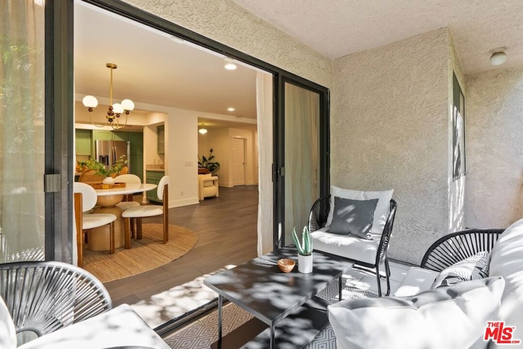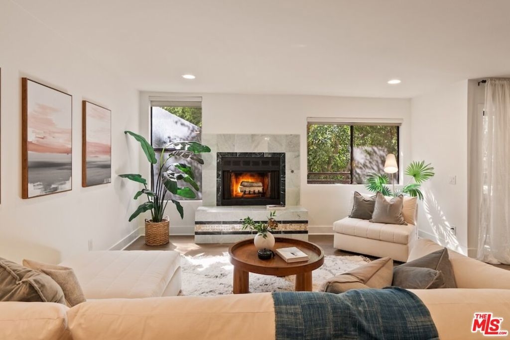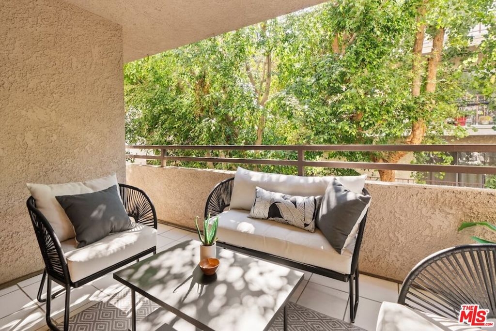 Tucked away on a quiet street just blocks from the dynamic energy of Sawtelle, this exquisitely reimagined corner residence exudes an air of effortless sophistication. Though technically a first-floor unit, it sits elevated above the street at a second-story level, offering privacy and a commanding perspective. Spanning nearly 1,600 square feet, this moody, design-forward 2-bedroom plus den, 2.5-bathroom home is a study in contrasts where rich textures, deep hues, and warm natural elements converge to create an intoxicatingly stylish atmosphere. Step inside, and a striking green marble entryway sets the tone, leading to an expansive living space anchored by a custom-tiled fireplace wrapped in raw, organic stone - an artful centerpiece that radiates quiet luxury. The open-concept design seamlessly transitions into a dining area and a grand chef's kitchen, where deep sage cabinetry, veined marble countertops, and professional-grade stainless steel appliances invite both culinary creativity and intimate gatherings. A sprawling island doubles as an informal dining space, perfect for slow morning coffee rituals or late-night conversations over a bottle of Syrah. Adjacent to the living space, a versatile den area offers endless possibilities whether envisioned as a refined home office, an artist's studio, or a stage for a grand piano. Expansive glass doors lead to a large private balcony, where lush, leafy views create an intimate, natural backdrop - an unexpected sanctuary in the heart of the city. The ambiance is equally intoxicating in the primary suite, which boasts its own secluded balcony, a generous walk-in closet, and an ensuite bath clad in travertine and granite, embodying an aesthetic both timeless and contemporary.This freshly painted home is adorned with brand-new hardwood floors, curated lighting fixtures that cast a sultry glow, and recessed lighting that accentuates every carefully chosen detail. A dedicated laundry closet with side-by-side washer and dryer adds to the home's effortless convenience.Set within a meticulously maintained and secured building with a gated garage, two parking spaces, controlled entry, and security cameras, this residence offers both sanctuary and accessibility. Just moments from Sawtelle's most celebrated eateries and boutiques, with seamless access to the 405 and 10 freeways, this is urban living at its most magnetic - a rare fusion of style, substance, and soulful ambiance.