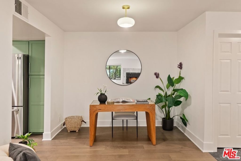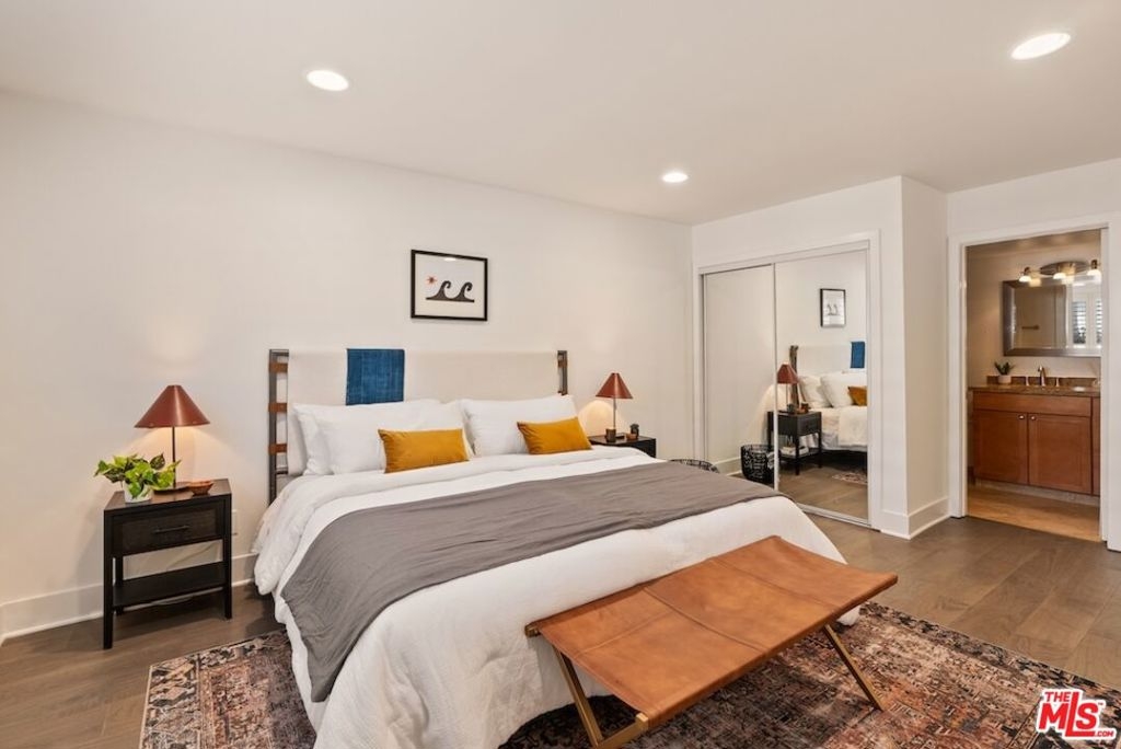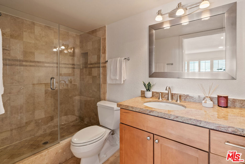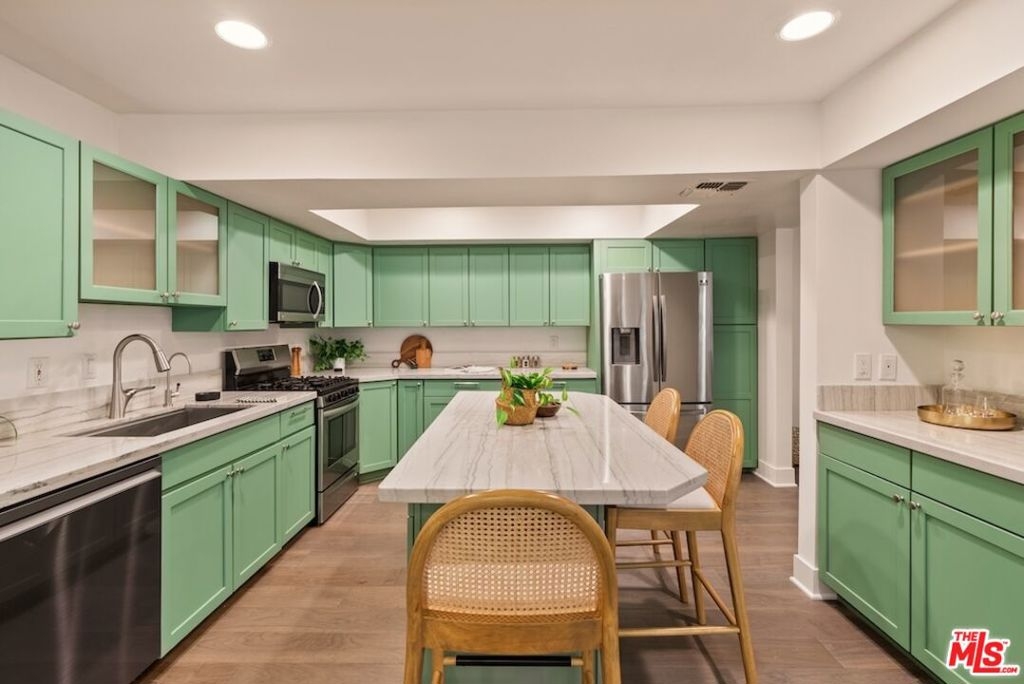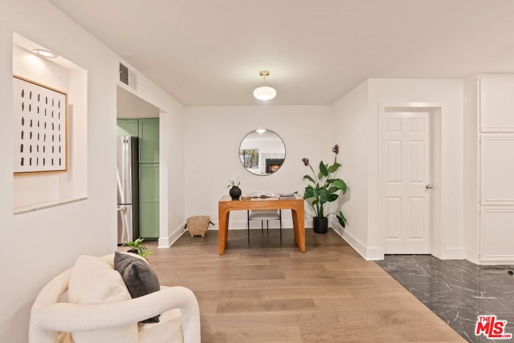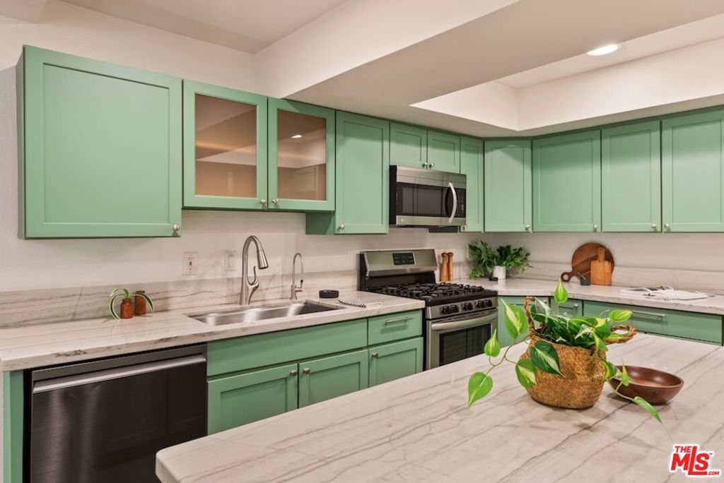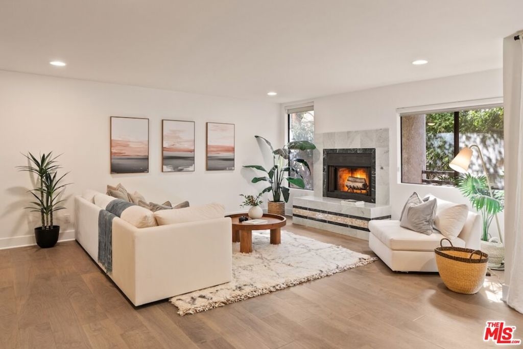 Tucked away on a quiet street just blocks from the dynamic energy of Sawtelle, this exquisitely reimagined corner residence exudes an air of effortless sophistication. Though technically a first-floor unit, it sits elevated above the street at a second-story level, offering privacy and a commanding perspective. Spanning nearly 1,600 square feet, this moody, design-forward 2-bedroom plus den, 2.5-bathroom home is a study in contrasts where rich textures, deep hues, and warm natural elements converge to create an intoxicatingly stylish atmosphere. Step inside, and a striking green marble entryway sets the tone, leading to an expansive living space anchored by a custom-tiled fireplace wrapped in raw, organic stone - an artful centerpiece that radiates quiet luxury. The open-concept design seamlessly transitions into a dining area and a grand chef's kitchen, where deep sage cabinetry, veined marble countertops, and professional-grade stainless steel appliances invite both culinary creativity and intimate gatherings. A sprawling island doubles as an informal dining space, perfect for slow morning coffee rituals or late-night conversations over a bottle of Syrah. Adjacent to the living space, a versatile den area offers endless possibilities whether envisioned as a refined home office, an artist's studio, or a stage for a grand piano. Expansive glass doors lead to a large private balcony, where lush, leafy views create an intimate, natural backdrop - an unexpected sanctuary in the heart of the city. The ambiance is equally intoxicating in the primary suite, which boasts its own secluded balcony, a generous walk-in closet, and an ensuite bath clad in travertine and granite, embodying an aesthetic both timeless and contemporary.This freshly painted home is adorned with brand-new hardwood floors, curated lighting fixtures that cast a sultry glow, and recessed lighting that accentuates every carefully chosen detail. A dedicated laundry closet with side-by-side washer and dryer adds to the home's effortless convenience.Set within a meticulously maintained and secured building with a gated garage, two parking spaces, controlled entry, and security cameras, this residence offers both sanctuary and accessibility. Just moments from Sawtelle's most celebrated eateries and boutiques, with seamless access to the 405 and 10 freeways, this is urban living at its most magnetic - a rare fusion of style, substance, and soulful ambiance.