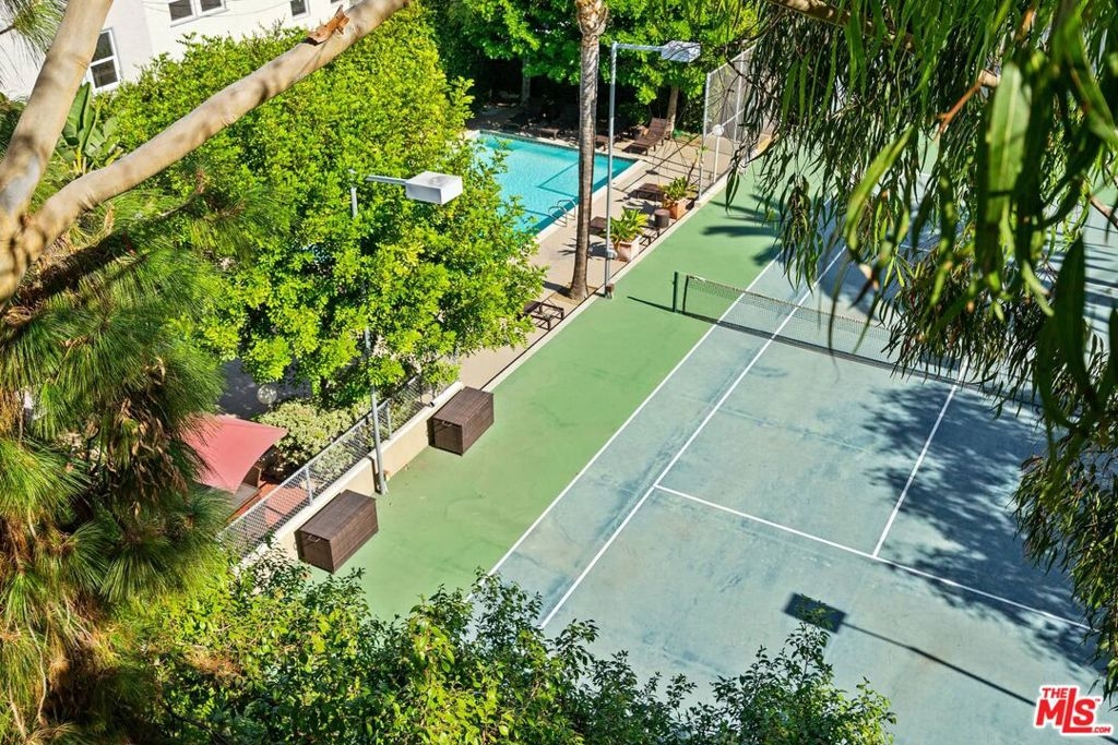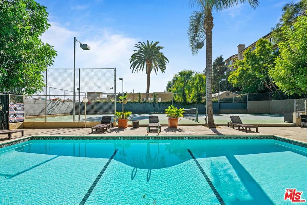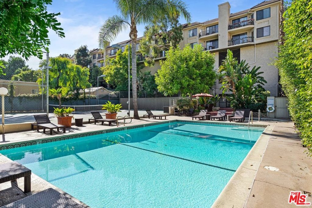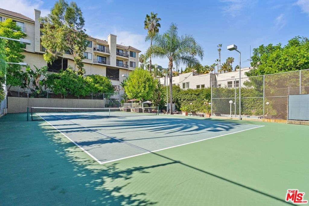 Resort living in the heart of Hollywood! Nestled in the hills adjacent to Whitley Heights, this small 32 unit complex has big amenities - Tennis Court, Racket Ball Court, Gym, Pool, Hot Tub. The well-appointed 2 BR + 2 BA condo features a living room with wood floors, fireplace, and balcony with views of Hollywood. Additionally, there's a kitchen with onyx countertops, gas stove, wine refrigerator, and washer/dryer. The primary suite has a walk-in closet and a spacious bath with spa tub, plus the secondary bedroom has a built-in Murphy bed. There are two side by side gated parking spots with elevator access, multiple guest spots, shared storage, and HOA earthquake insurance. Best of all, this convenient location is close to all - Cahuenga restaurants, shops, and nightlife, as well as major TV and film studios, Runyon Canyon, Pantages Theater, and The Hollywood Bowl!