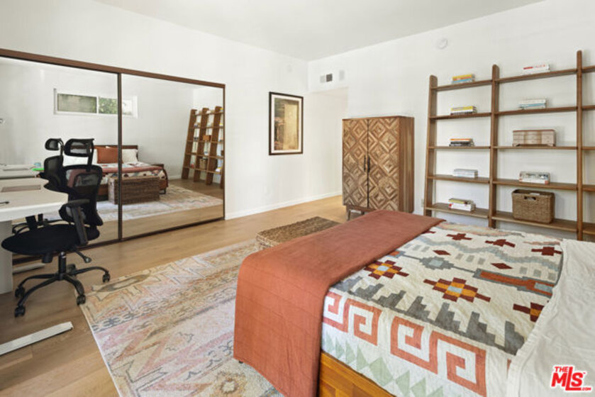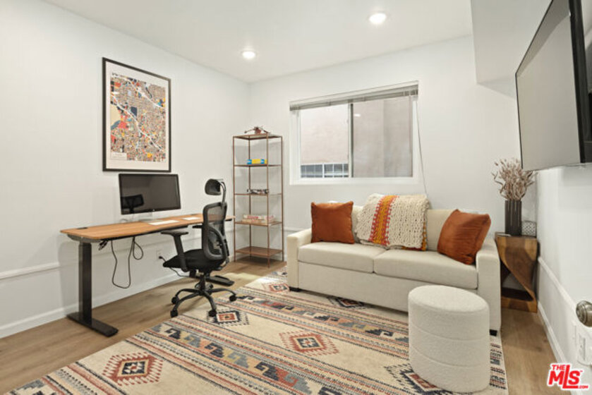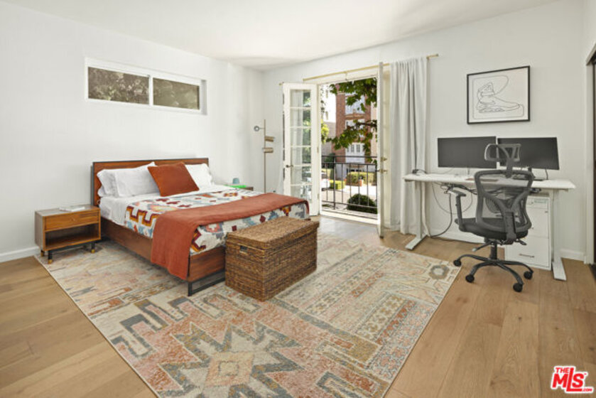 Sophisticated and welcoming, this front-facing contemporary residence combines airy proportions with charming European character. Set above street level, the single-story floor plan spans 1,270 sq.ft. with natural light streaming throughout. The living room opens through elegant French doors to a balcony shaded by mature maple trees, while the adjacent dining area enjoys a leafy street view. The remodeled kitchen features crisp white shaker cabinetry and stainless steel appliances. The spacious primary suite includes double French doors to a private balcony, generous closets, and an ensuite bath with dual vanity. A second bedroom offers flexibility as a guest room or office, served by a full hall bath. Additional highlights include a large laundry room with storage, two tandem garage spaces plus extra storage, and secure guest parking. HOA dues include earthquake Ins, water, trash and basic cable, and internet. Ideally located near Westwood Village, Century City, the new Google campus, and freeway access, this is Westside living at its most effortless.