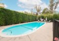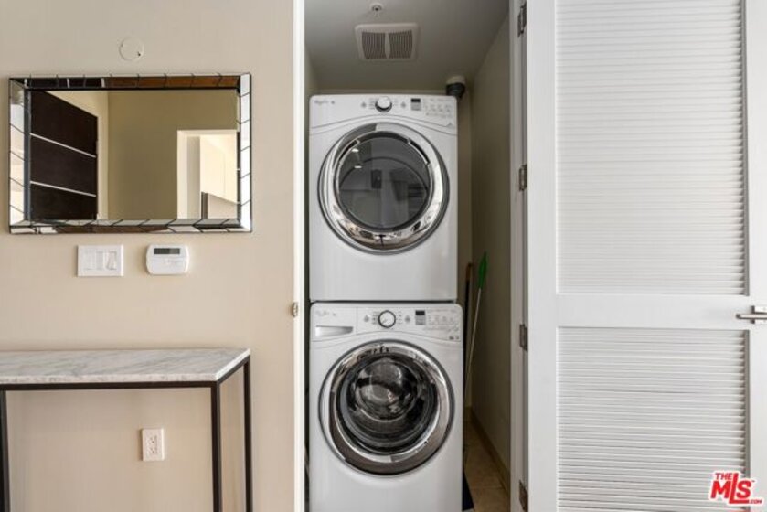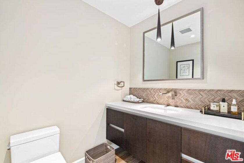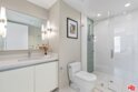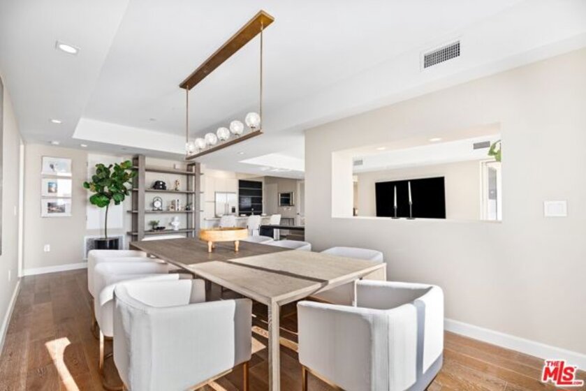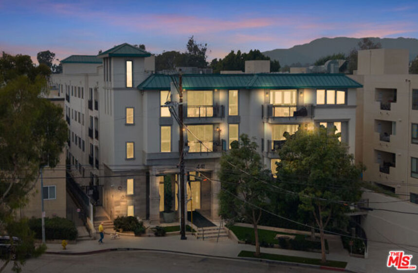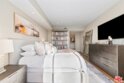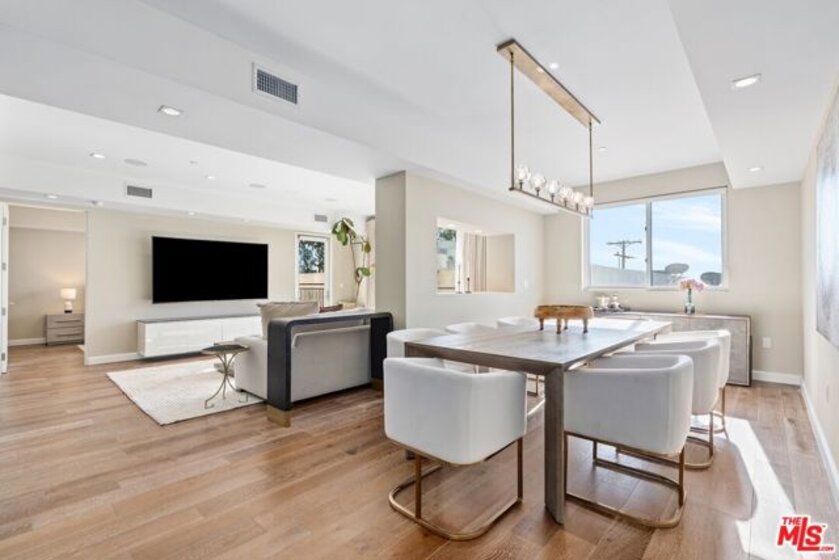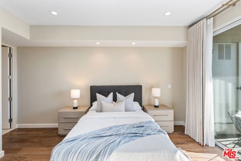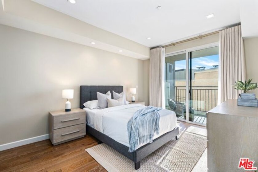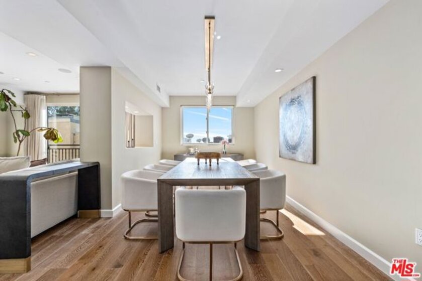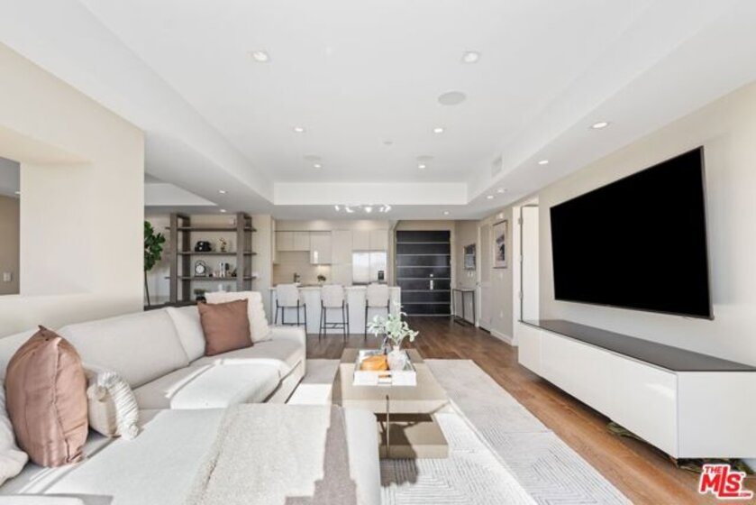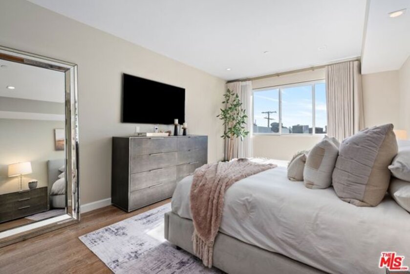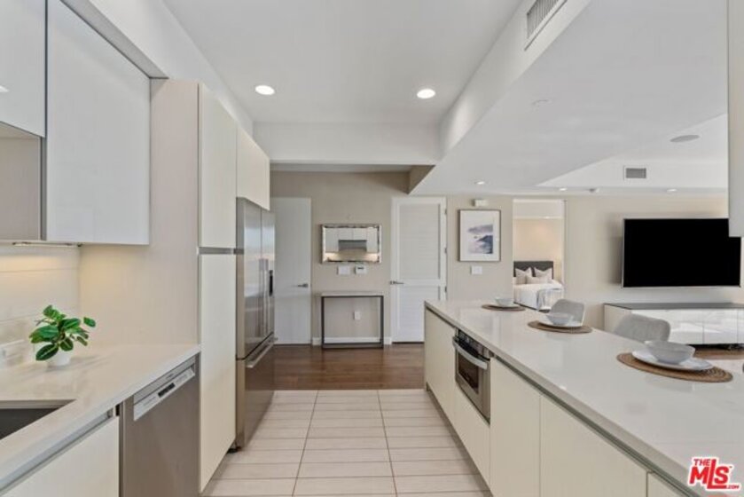 Recently reduced and perched on the coveted top floor, Residence #402 offers rare privacy with no neighbors above and a prized south-facing orientation that fills the home with beautiful natural light throughout the day. Currently the only top-floor two-bedroom available in the building, this 1,611-square-foot residence showcases high ceilings, expansive windows, and a spacious, thoughtfully designed layout ideal for both refined entertaining and comfortable everyday living. Spanning approximately 1,611 square feet, this refined two-bedroom, two-and-a-half-bath residence features a spacious, thoughtfully designed floor plan ideal for both comfortable living and elegant entertaining. High ceilings, expansive windows, and wide-plank oak floors create an airy, sophisticated atmosphere, while intentional accent lighting enhances the home's warm, modern aesthetic. The generous living and dining areas flow seamlessly to a private balcony, offering a peaceful outdoor retreat. The chef's kitchen is beautifully appointed with top-tier Wolf, Fisher & Paykel, and Bosch stainless-steel appliances, sleek white cabinetry, abundant counter space, and a large island with bar seating. Both bedrooms are well-proportioned with ensuite baths, offering ideal separation and privacy. The primary suite serves as a luxurious sanctuary, complete with dual vanities, a soaking tub, a separate shower, and a spacious walk-in closet. An in-unit washer and dryer provide everyday convenience. The Cosmopolitan BW is one of Brentwood's premier full-service luxury buildings, known for strong long-term value and resale performance unlike anything comparable in the area. Residents enjoy 24/7 concierge and front desk service, a state-of-the-art fitness center, heated pool, outdoor lounge with fire pit, and a tranquil meditation garden.
