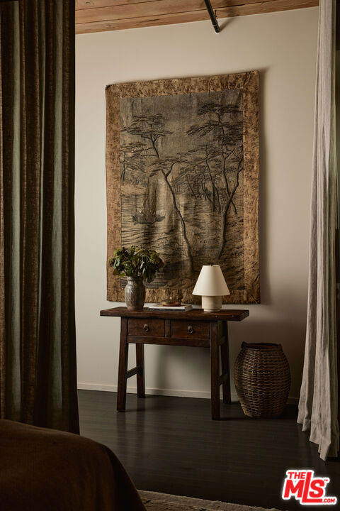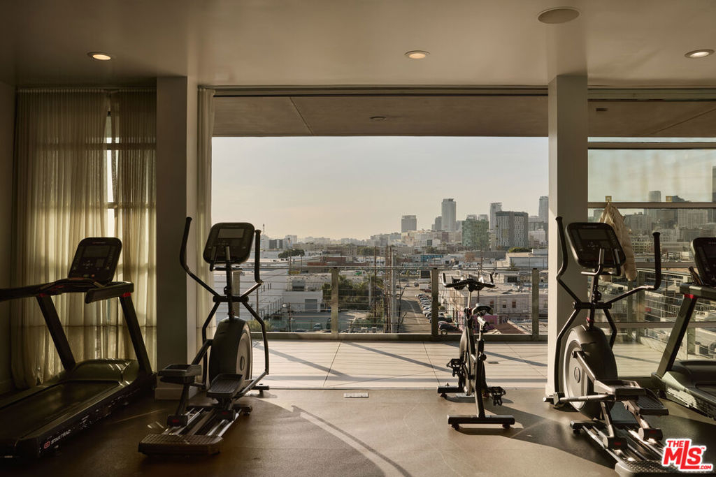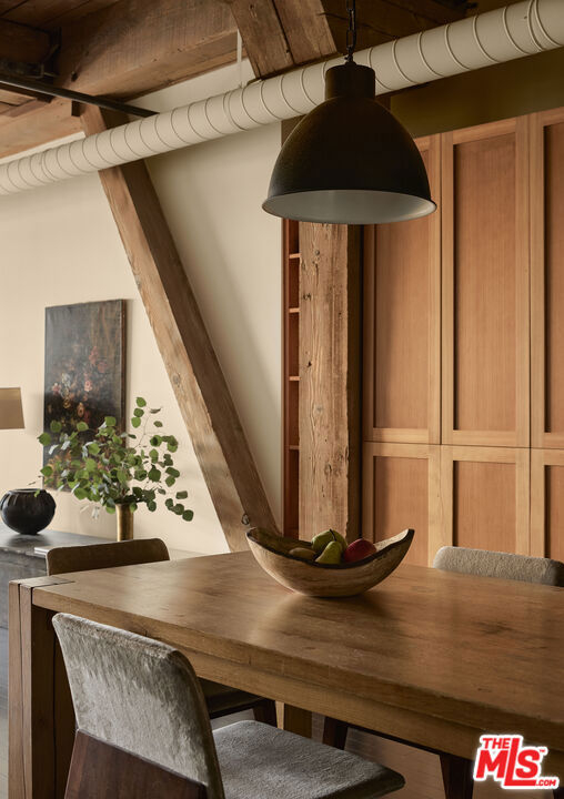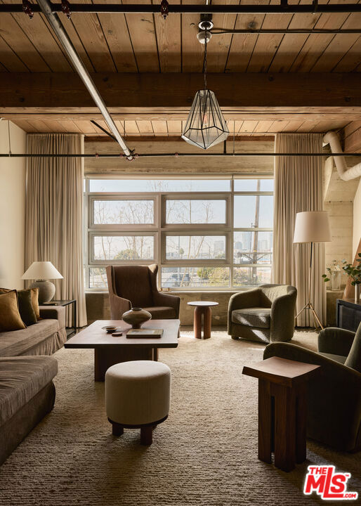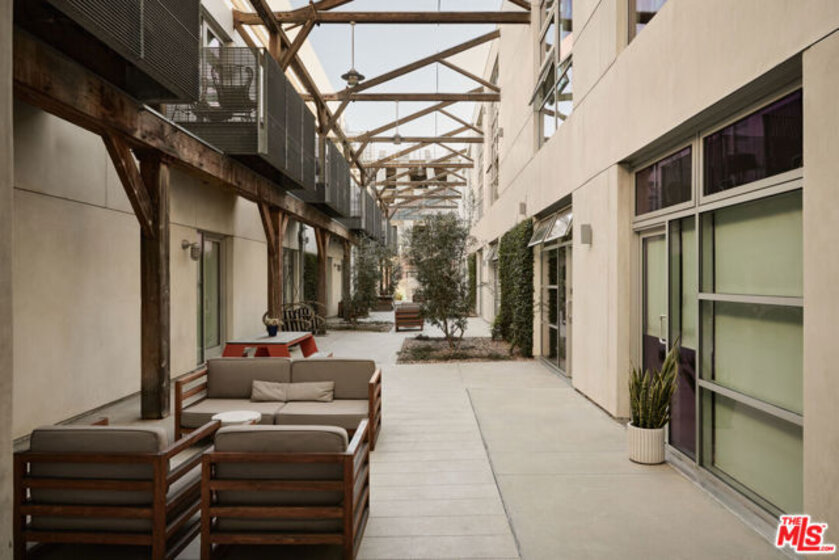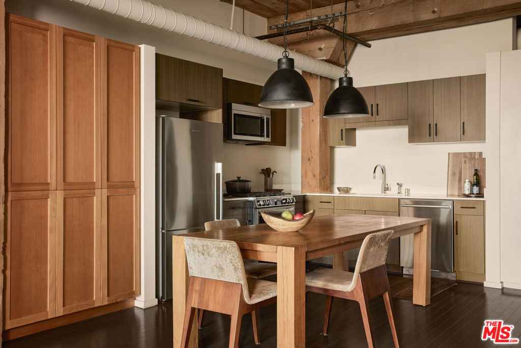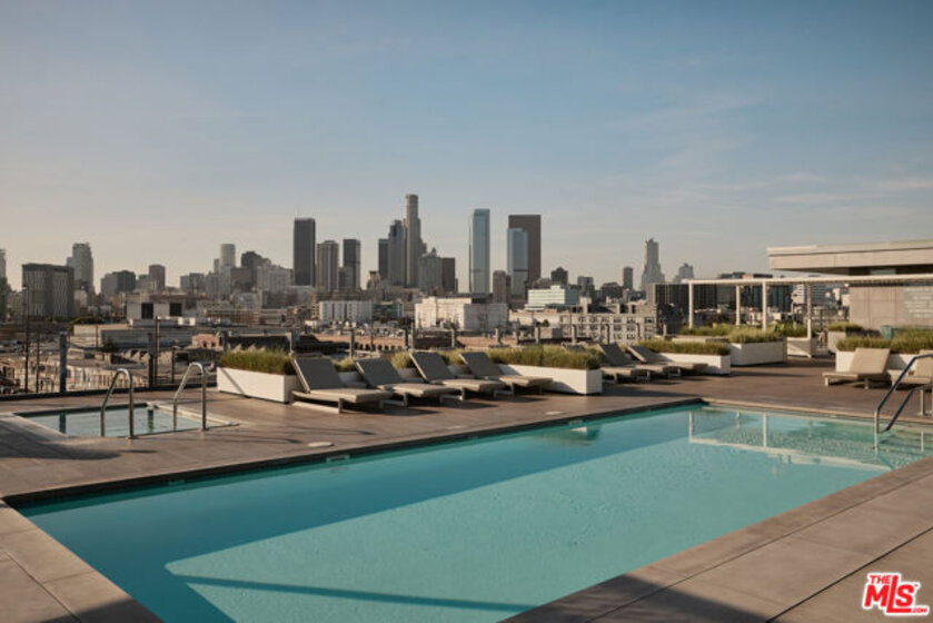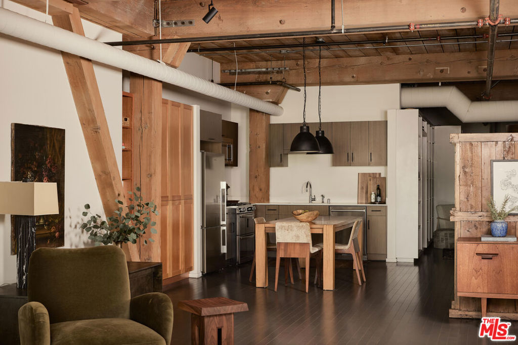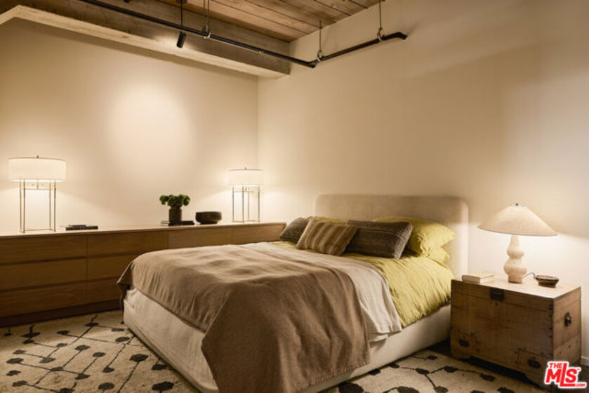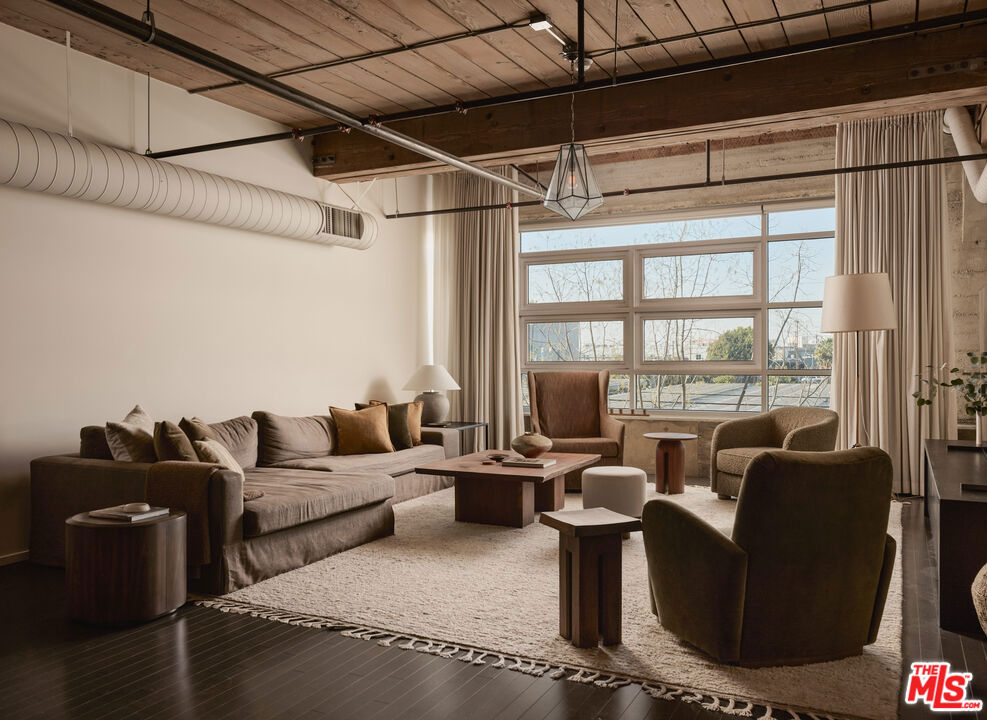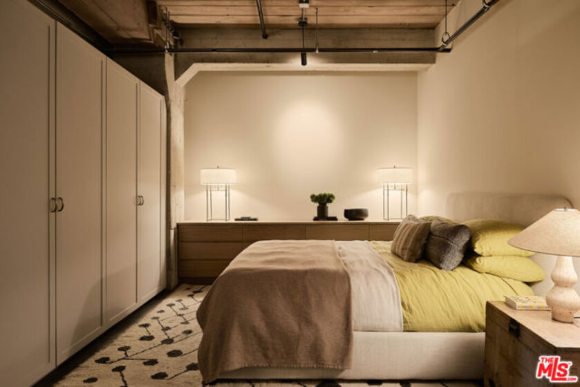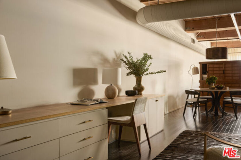 Exceptional Arts District loft in the historic Barker Block, exquisitely designed by noted interior design firm DISC Interiors. A dramatic wall of windows spans the far end of the residence, dressed in floor-to-ceiling drapery that adds warmth and texture, filling the space with an abundance of natural light and framing a coveted downtown skyline view. West-facing units with all wood ceilings and sunset exposures like this rarely come to market at Barker Block, making this residence an exceptional opportunity. This special home strikes a thoughtful balance of warmth and sophistication with hardwood floors throughout, nearly 11-foot ceilings with exposed beams, architectural lighting complemented by designer decorative fixtures, and custom built-in cabinetry providing ample storage at every turn for smart, elevated living. Warm white walls and painted-out ducting give the loft a more cohesive and softened feel. The heart of the loft is a chef's kitchen outfitted with top-of-the-line, recently updated appliances seamlessly anchoring the open layout, ideal for both everyday life and entertaining. A spacious full bath includes in-unit laundry, while the generously sized bedroom features luxurious custom curtains that provide privacy and a thoughtful separation of space. The bedroom is complemented by a large wall of custom designed closets with antique brass hardware, and a built-in wall-to-wall oak dresser. A custom built-in 16' desk with a full wall of bookshelves thoughtfully separates the entry and dining areas, adding both function and architectural interest.The Barker Block is a full-service building offering 24/7 front desk and security, complimentary common-area WiFi, an outdoor lounge with fire pits, and a resort-style rooftop with heated pool, spa, BBQ areas, and a fitness center showcasing some of the best panoramic views in downtown Los Angeles. Known for its striking architectural details and timeless industrial character, the live/work designated Barker Block also offers a dynamic and sophisticated creative community spirit.Located in the heart of the Arts District, moments from Bavel, Girl and the Goat, Verve Coffee, Blue Bottle Coffee, as well as walking distance to Still Life Ceramic Studios, Dover Street Market, Bestia, Soho Warehouse, and art galleries such as Hauser & Wirth, this exceptional loft delivers a rare blend of architectural pedigree, thoughtful design, and a vibrant, walkable urban lifestyle.