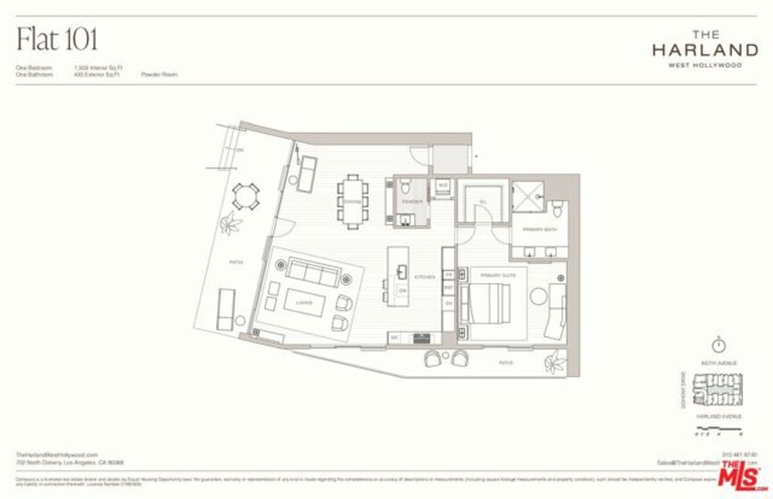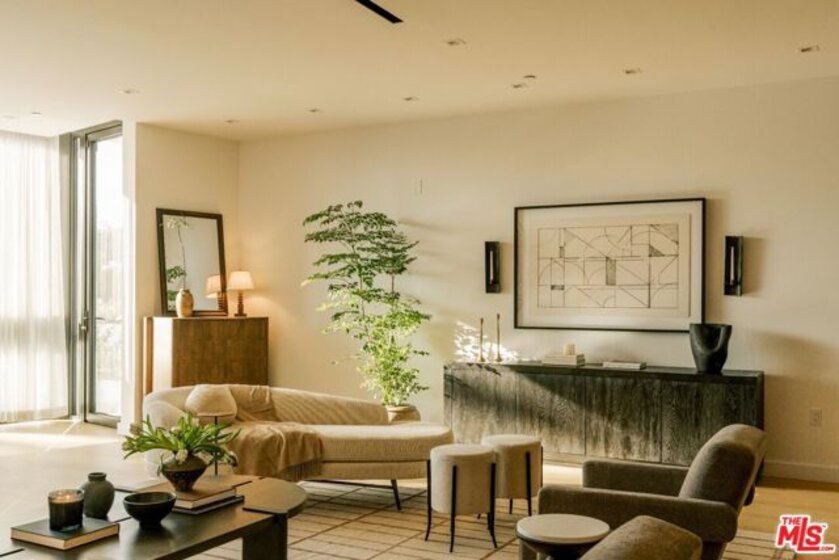 Residence 101 at The Harland is one of only seven flats in this Case Study inspired boutique condominium building designed by OFFICEUNTITLED with interiors by Marmol Radziner. The intimate single-level layout exemplifies the best of California modern design. This one-bedroom, one-and-a-half-bath residence opens onto a private patio along a tree-lined stretch of North Doheny Drive, drawing in sunset-facing light through the afternoon and evening. Floor-to-ceiling windows and open-concept living blur the line between indoors and out, while a restrained material palette of light oak, walnut, marble, and bronze conveys understated, modern sophistication throughout. Located where West Hollywood meets Beverly Hills, The Harland pairs the privacy of a personal residence with a curated suite of services and amenities, including a screening room, residents' lounge, chefs kitchen, fitness studio, and two-lane bowling alley just moments from the city's top dining, shopping, and cultural destinations.