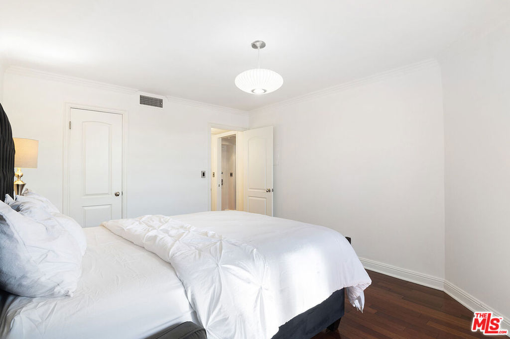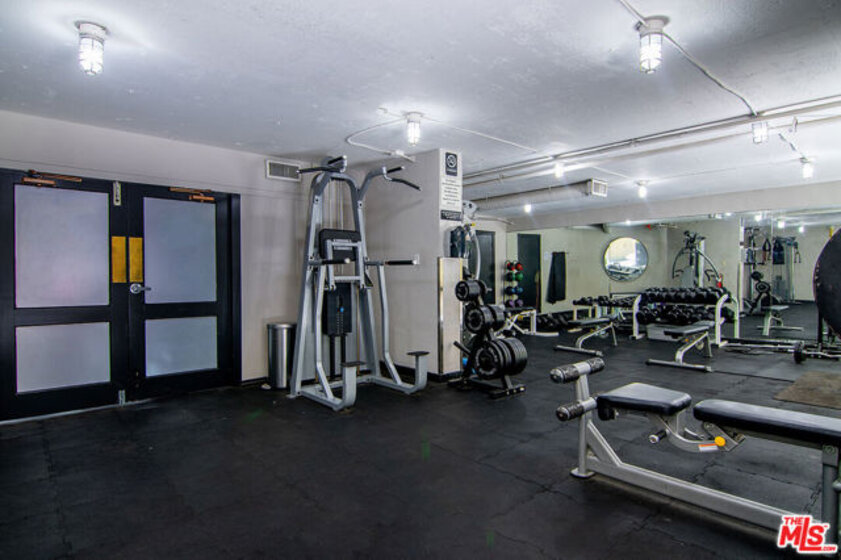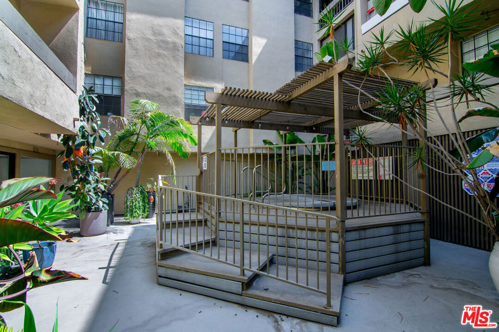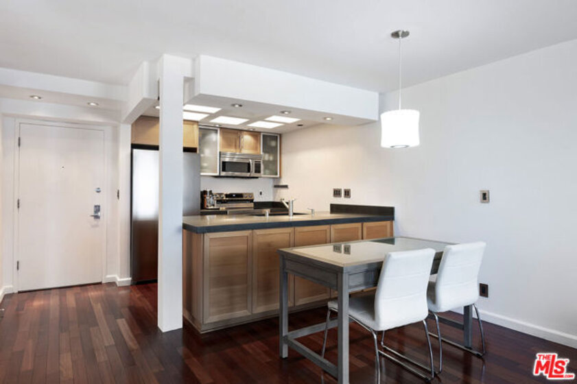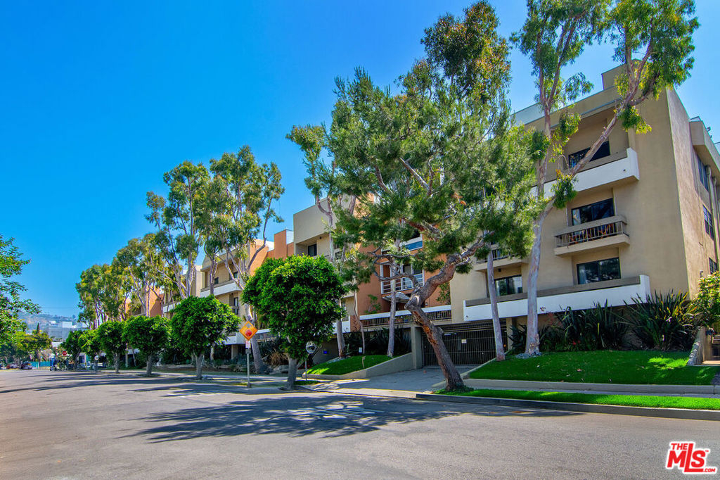 Top-floor south-facing 1-bedroom, 1-bathroom condo on tree-lined Kings Road in the heart of West Hollywood! The kitchen features stainless steel appliances, concrete countertops, recessed lighting, washer/dryer combo and generous cabinet space. Enjoy an open-concept dining and living area with a cozy gas fireplace and sliding glass doors that lead to a private patio. The spacious primary bedroom boasts a walk-in closet and direct access to the patio. The updated bathroom includes granite countertops and a tub/shower combo. Additional highlights include hardwood floors throughout and central AC. Community amenities include secure garage parking, a fitness center, two spas, laundry facilities on each floor, and a rooftop sun deck with BBQ area and stunning mountain and treetop views. Just steps from West Hollywood's top shops, restaurants, and nightlife!